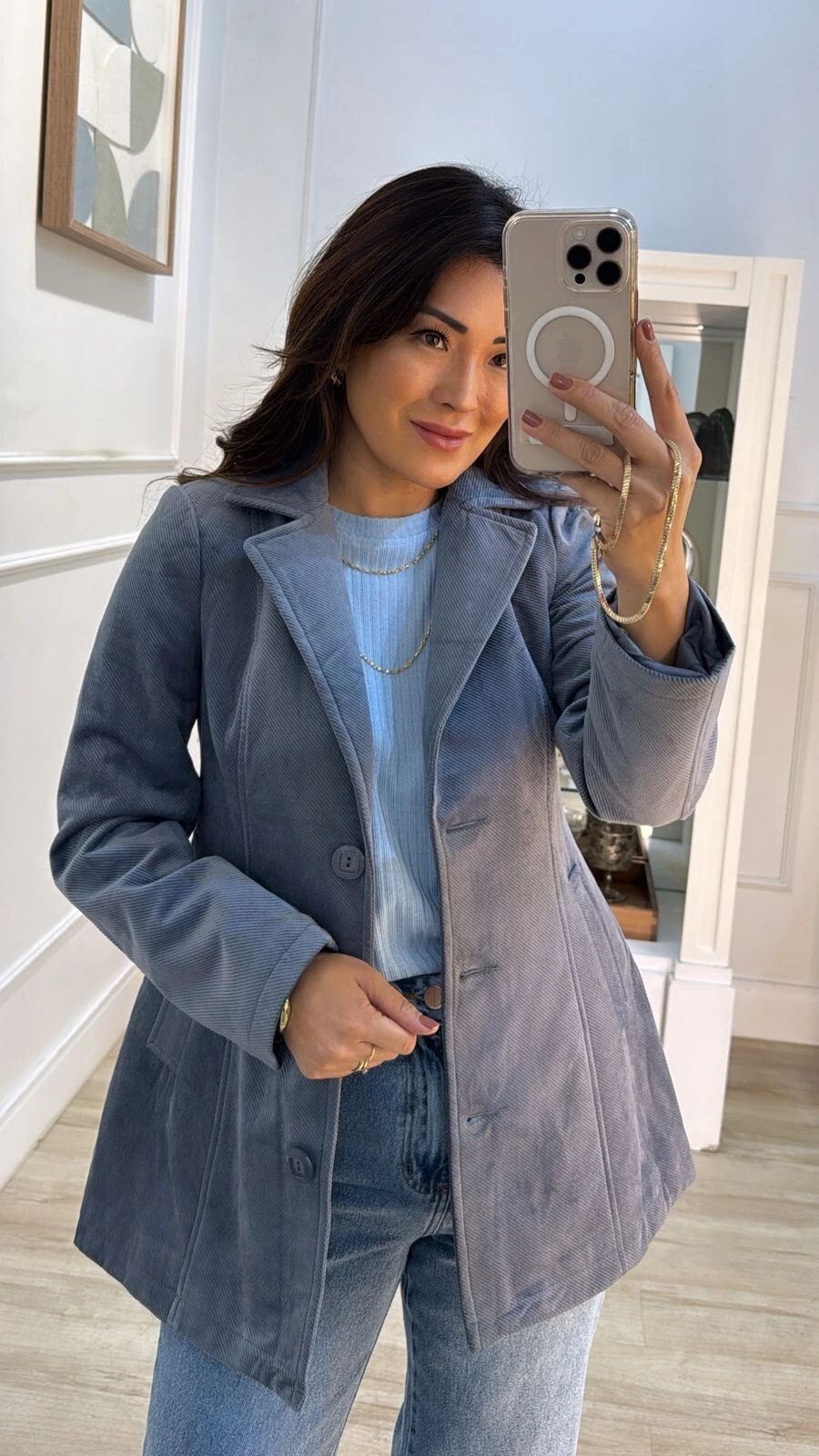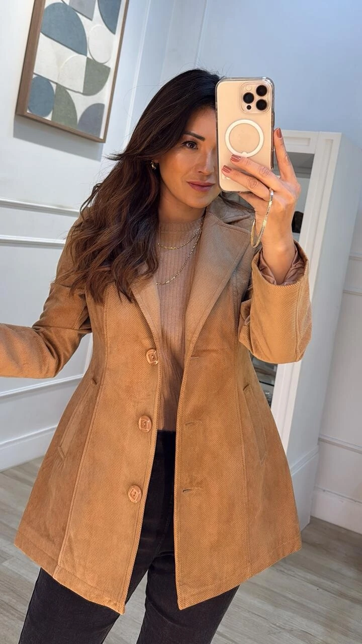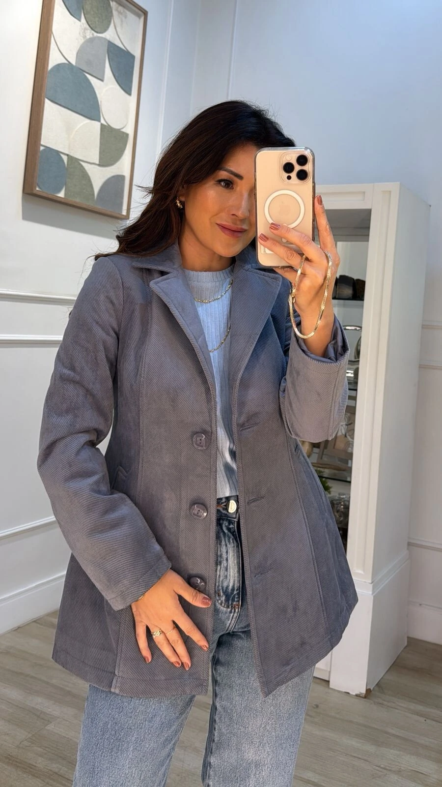Casaco alongado confeccionado em veludo cotelê. Possui gola, mangas longas, bolsos frontais com relevo, recorte, pesponto, forro e fechamento frontal da peça por botões resinados.