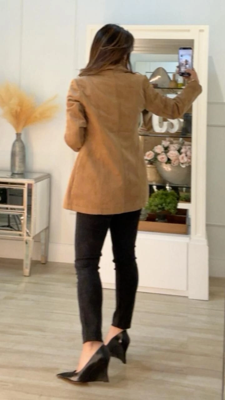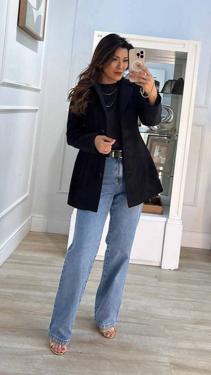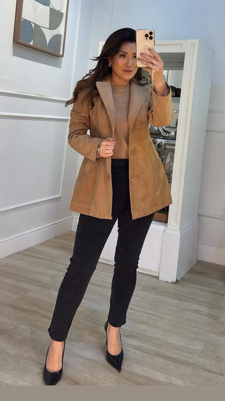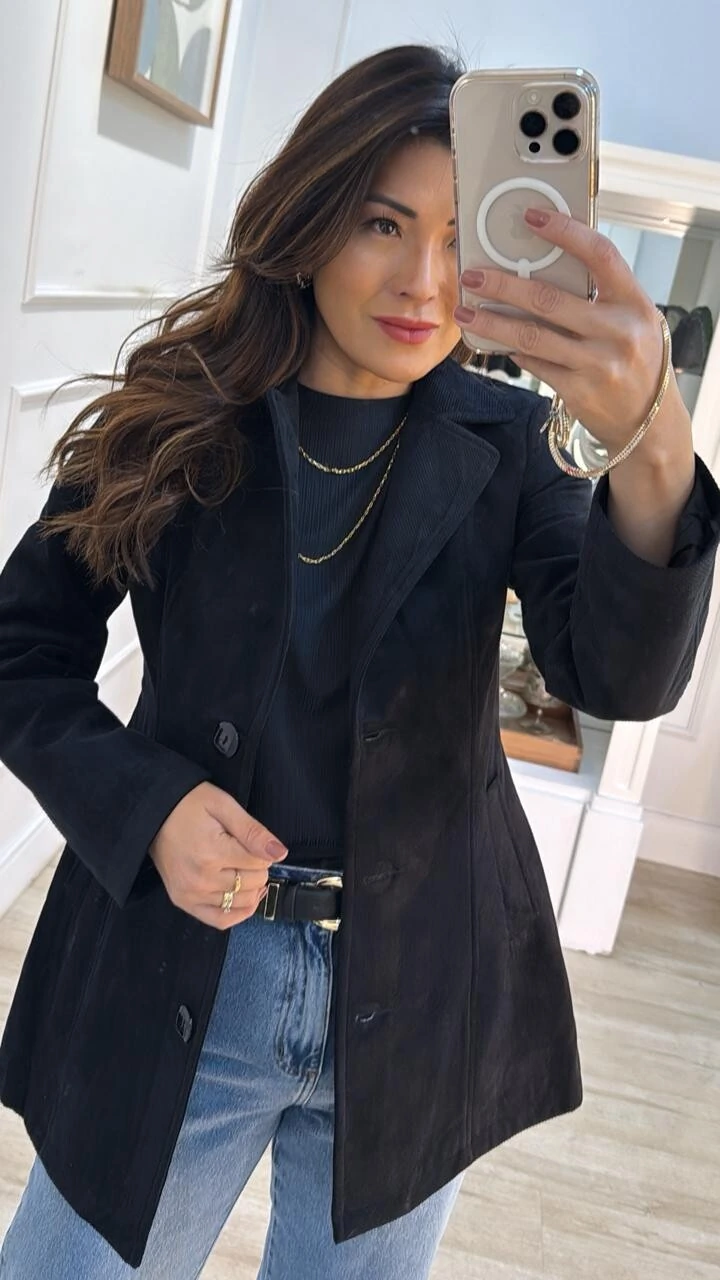 Casaco alongado confeccionado em veludo cotelê. Possui gola, mangas longas, bolsos frontais com relevo, recorte, pesponto, forro e fechamento frontal da peça por botões resinados.