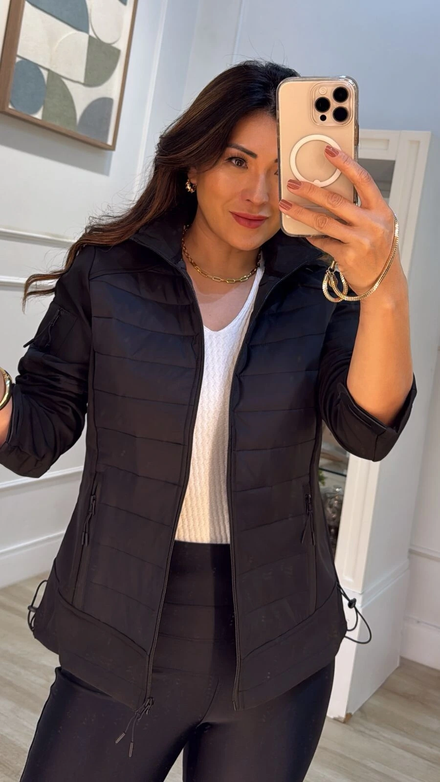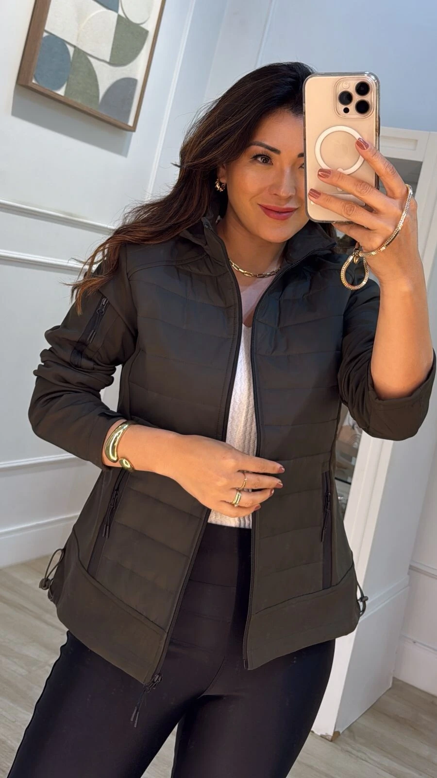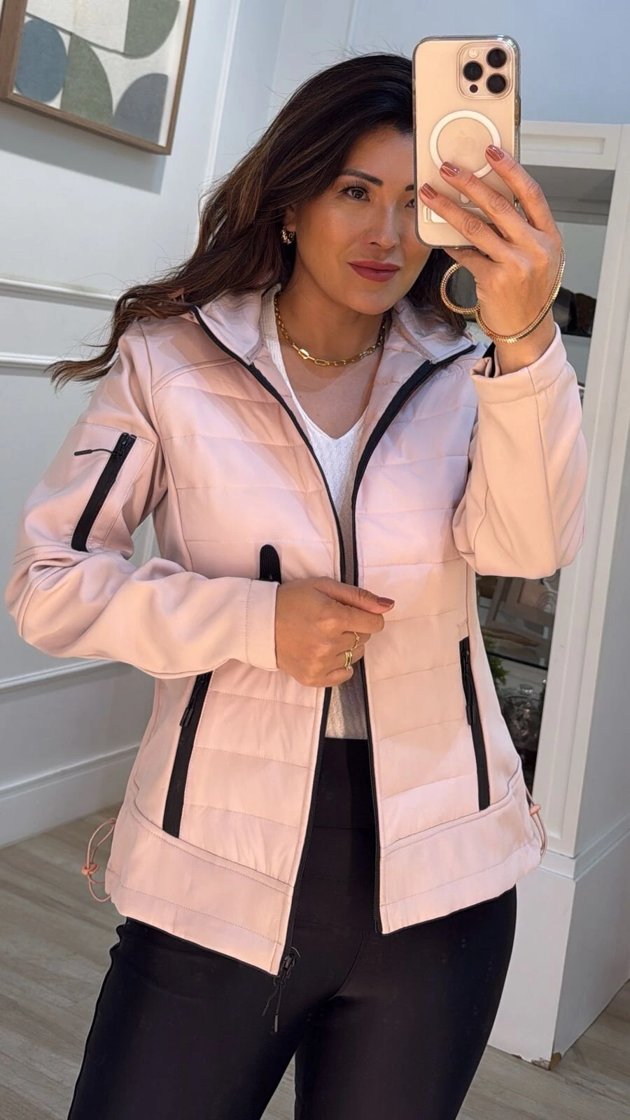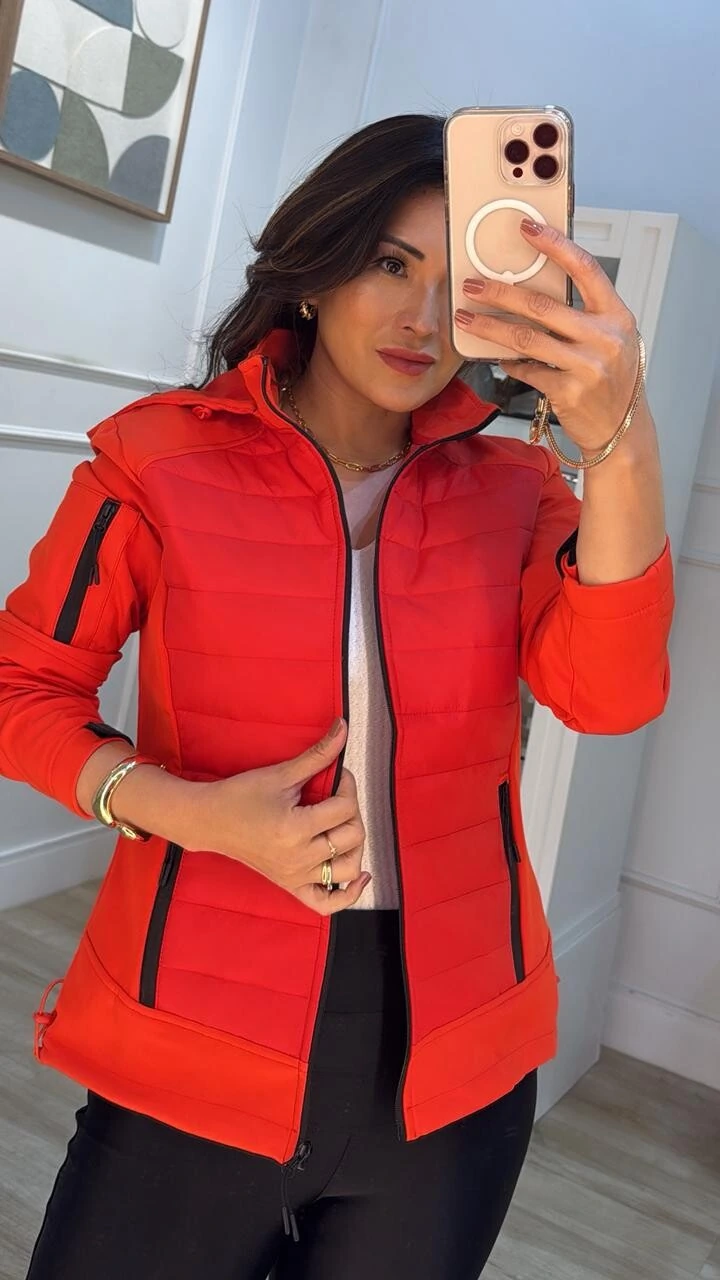 Jaqueta possui capuz removível com puxadores reguláveis, mangas longas, bolsos frontais e na manga direita, velcro nos punhos, puxadores reguláveis no barrado, pespontos na horizontal, forro peluciado, fechamento frontal da peça e dos bolsos por zíper.