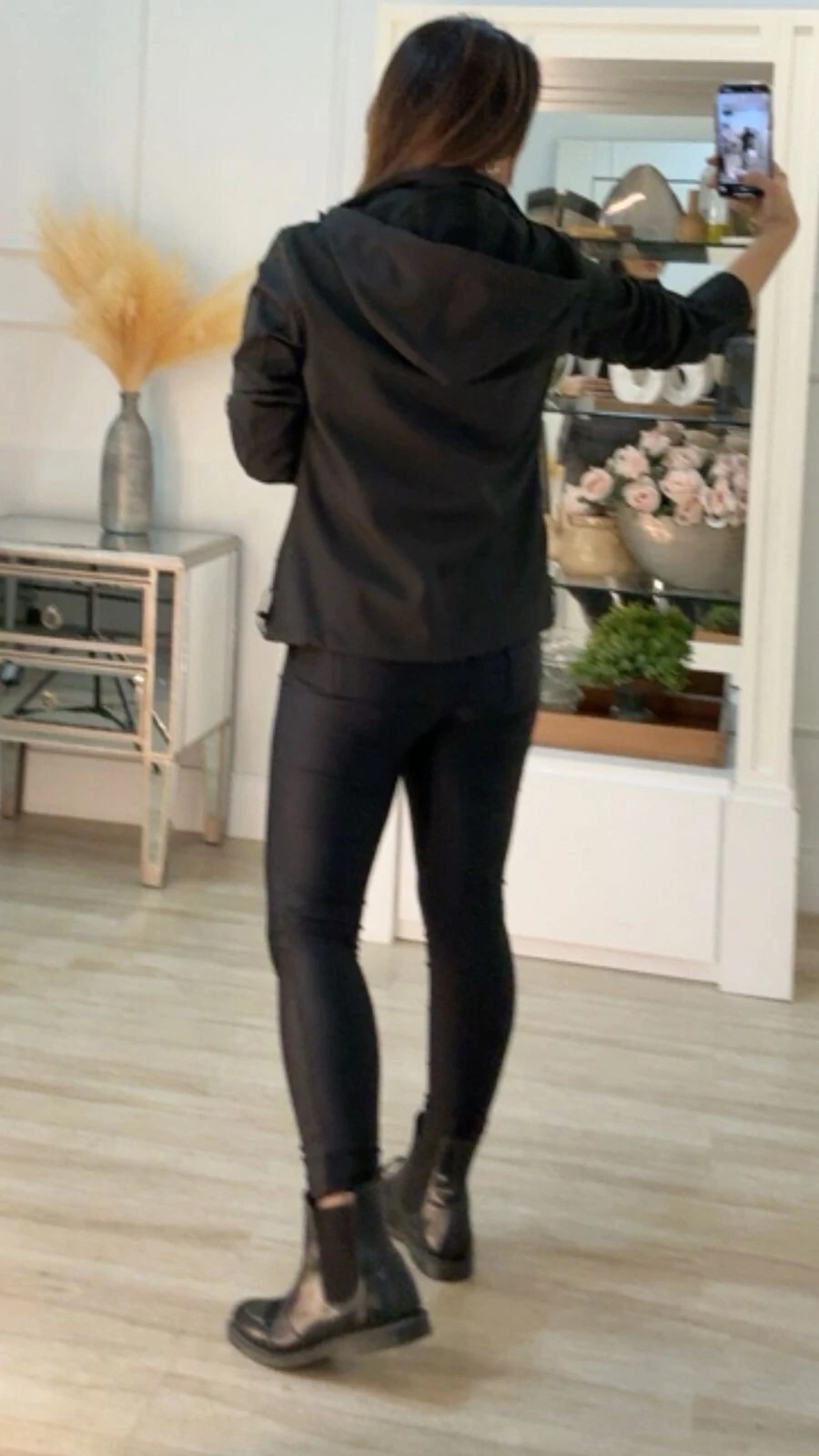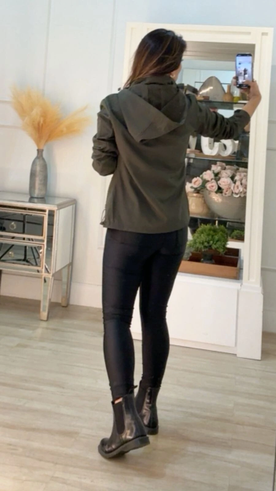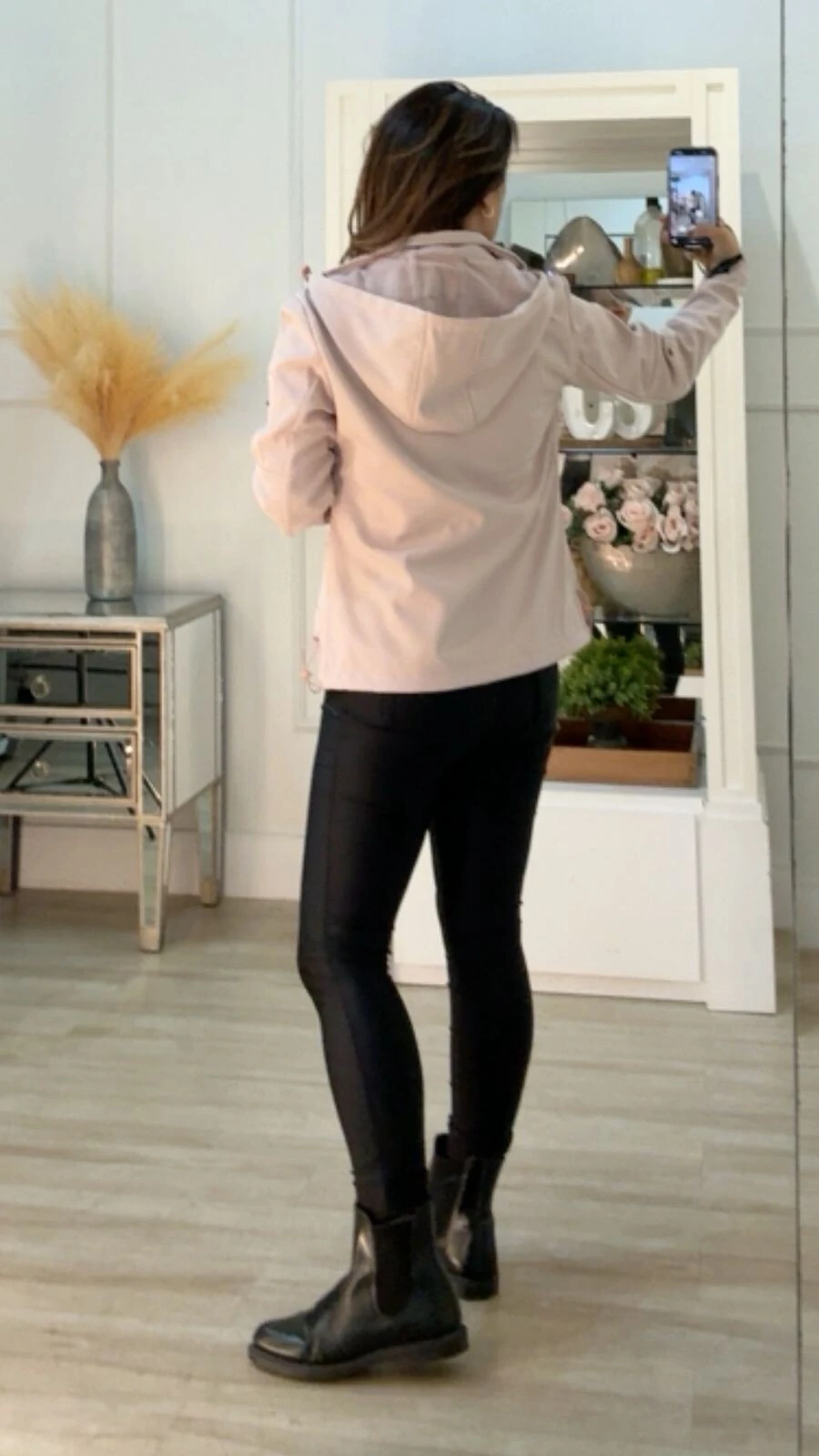 Jaqueta possui capuz removível com puxadores reguláveis, mangas longas, bolsos frontais e na manga direita, velcro nos punhos, puxadores reguláveis no barrado, pespontos na horizontal, forro peluciado, fechamento frontal da peça e dos bolsos por zíper.