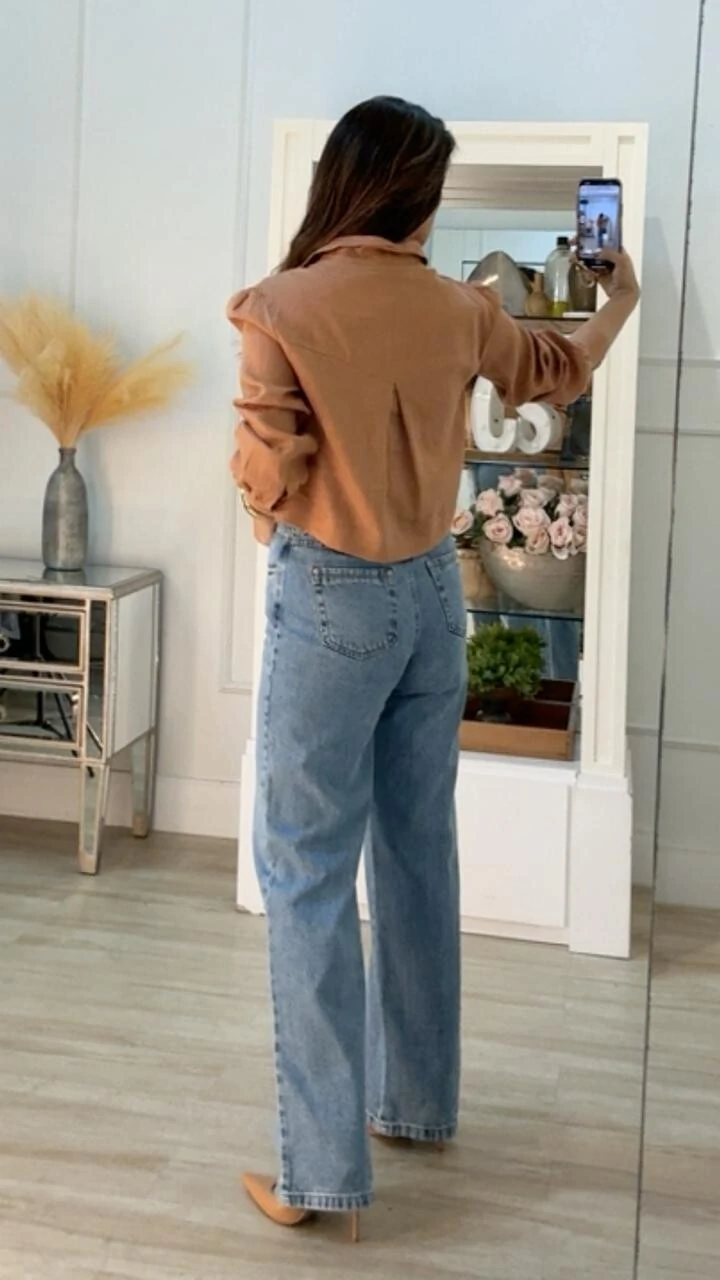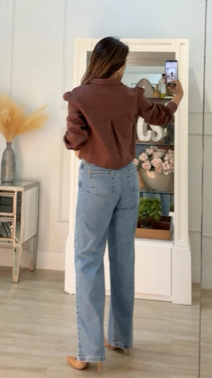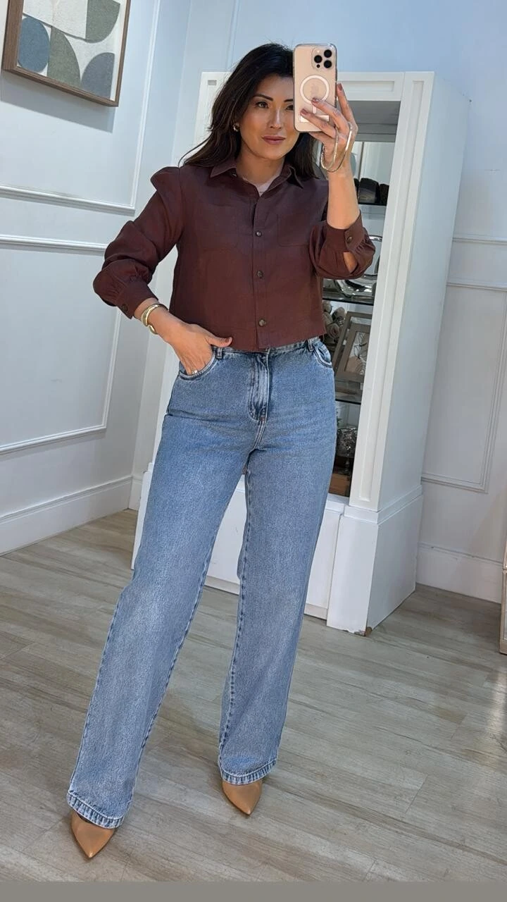 Camisa cropped confeccionado em linho. Possui gola, mangas longas princesa, bolsos frontais, prega posterior, barrado arredondado, pesponto, fechamento frontal da peça e punhos por botões.