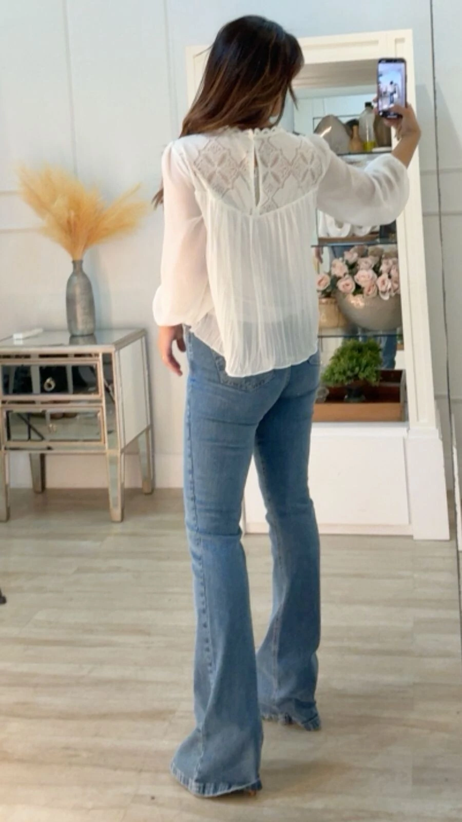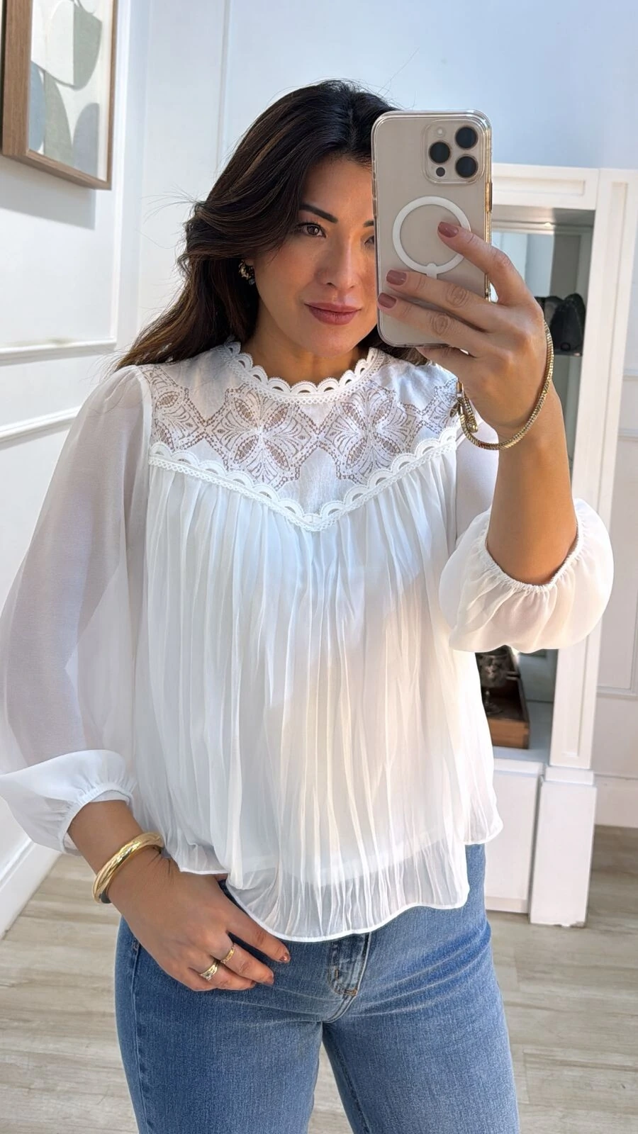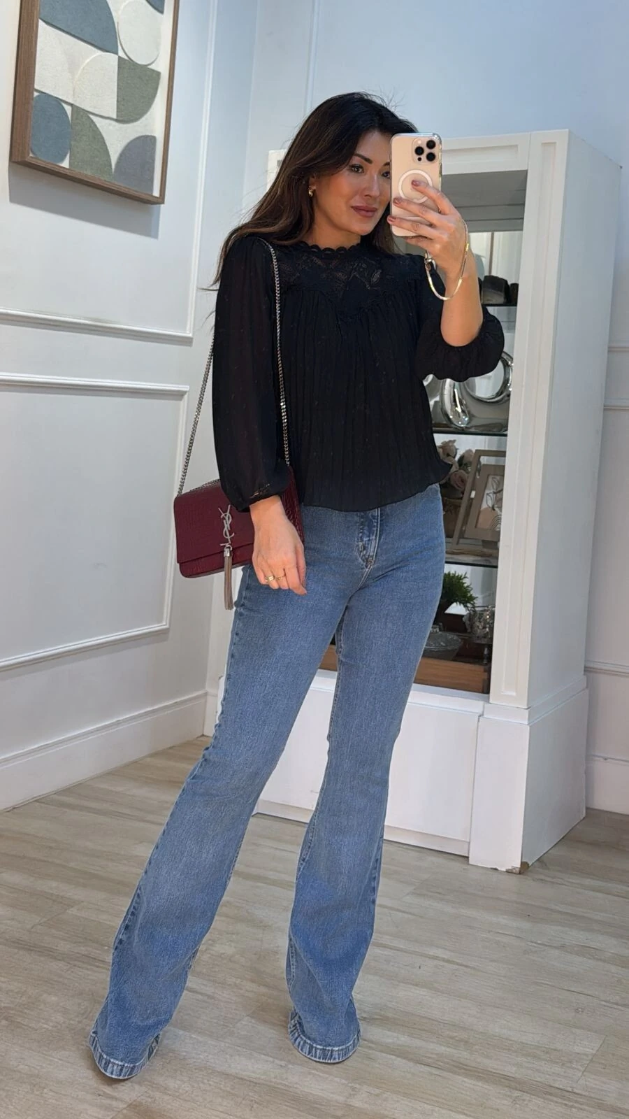 Blusa confeccionado em crepe. Possui gola careca, mangas longas com elástico nos punhos, pesponto, detalhe de renda com sianinha, recorte vazado na parte posterior com fechamento por botão, e forro.