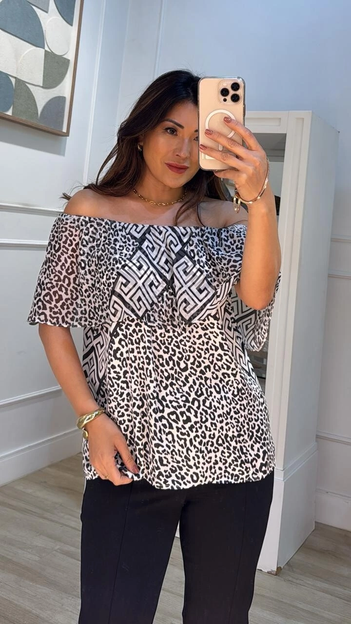 Blusa ombro a ombro acetinada com babado em chiffon estampada. Possui elástico nos ombros. Modelagem ampla.