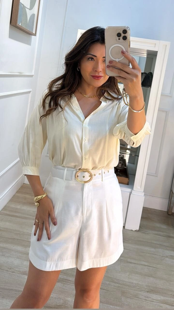 Camisa confeccionada em viscose. Possui gola, mangas 7/8, fechamento frontal da peça e dos punhos por botões, e pesponto.