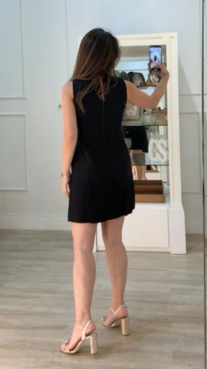 Vestido curto confeccionado em twill. Possui forro, alças largas, decote V, detalhes frontais de botões dourados e posterior: recorte em gota com botão e zíper para fechamento da peça. Modelagem ampla.