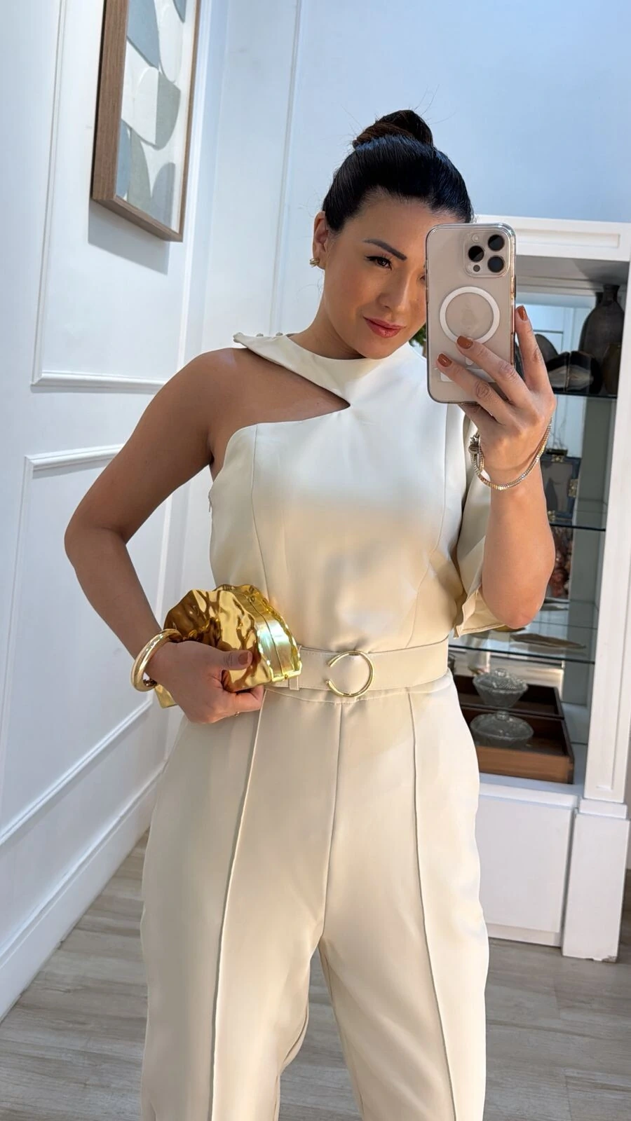 Macacão confeccionado em alfaiataria. Possui decote assimétrico, manga 3/4 única de babado, bolsos frontais, nervura, detalhe vazado com fechamento por botões resinados, fechamento pela parte lateral da peça por zíper, forro e cinto encapado com fivela meio circulo dourado.