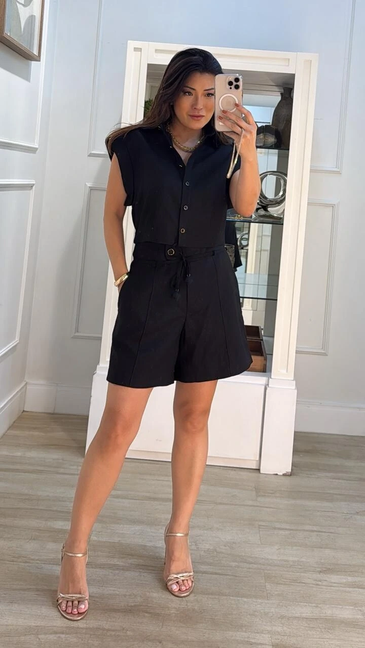 Camisa cropped possui gola, punhos dobrados com martingales, e fechamento da peça por botões frontais marmorizados.