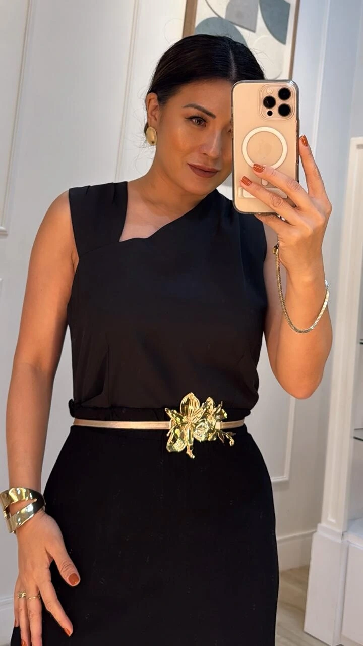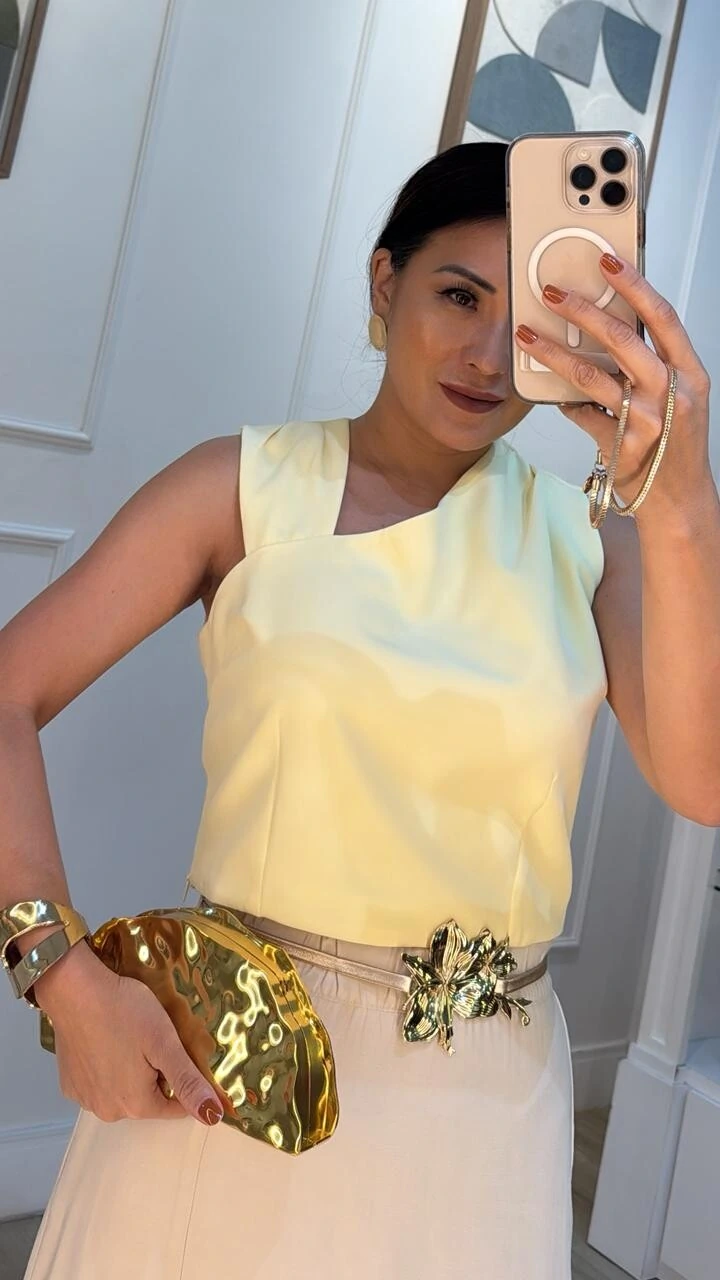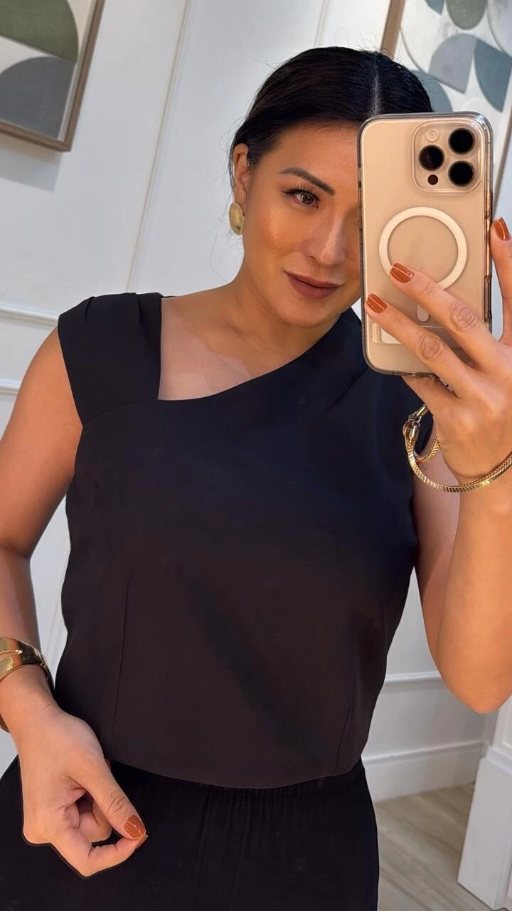 Cropped confeccionado em alfaiataria. Possui decote assimétrico, alças largas, pregas nos ombros, pesponto, forro e fechamento lateral da peça por zíper.