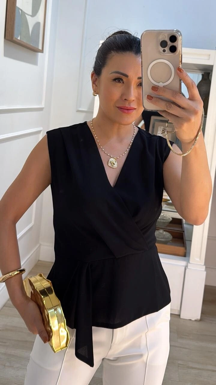 Blusa cachecour confeccionada em crepe. Possui decote v transpassado, amarração na cintura, alças largas com pregas nos ombros, pesponto e fechamento pela parte lateral da peça por zíper.
