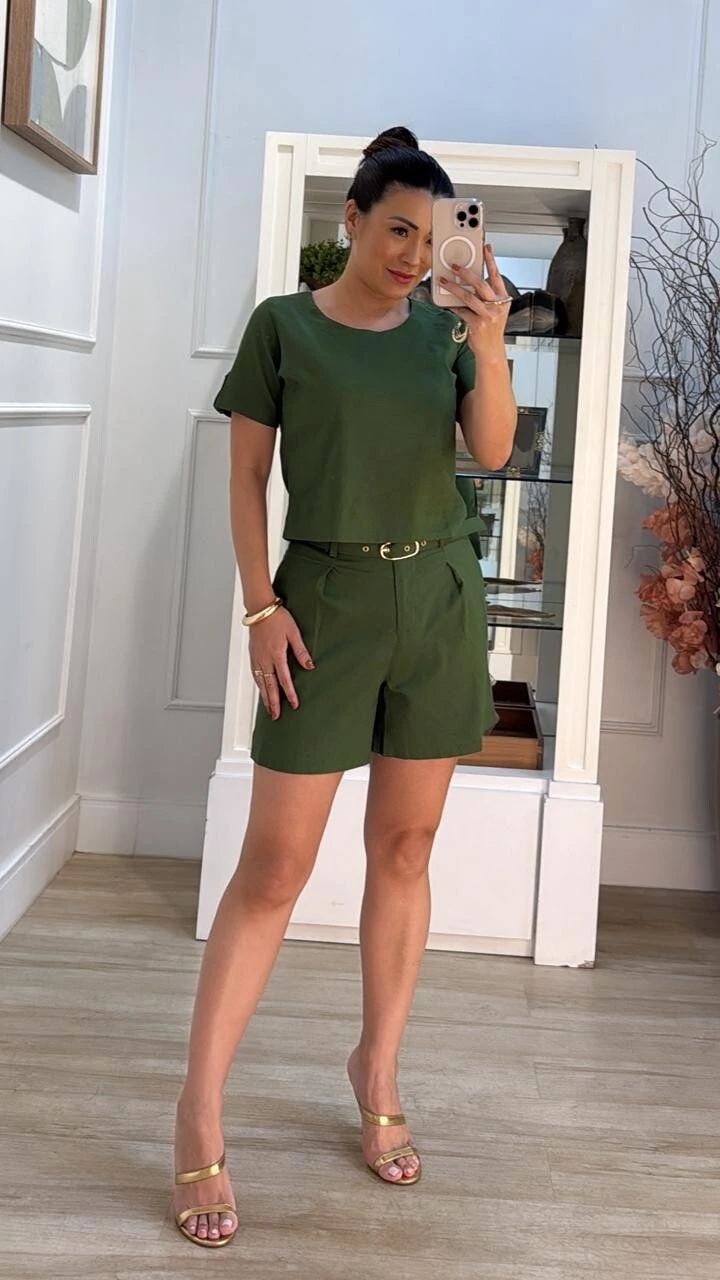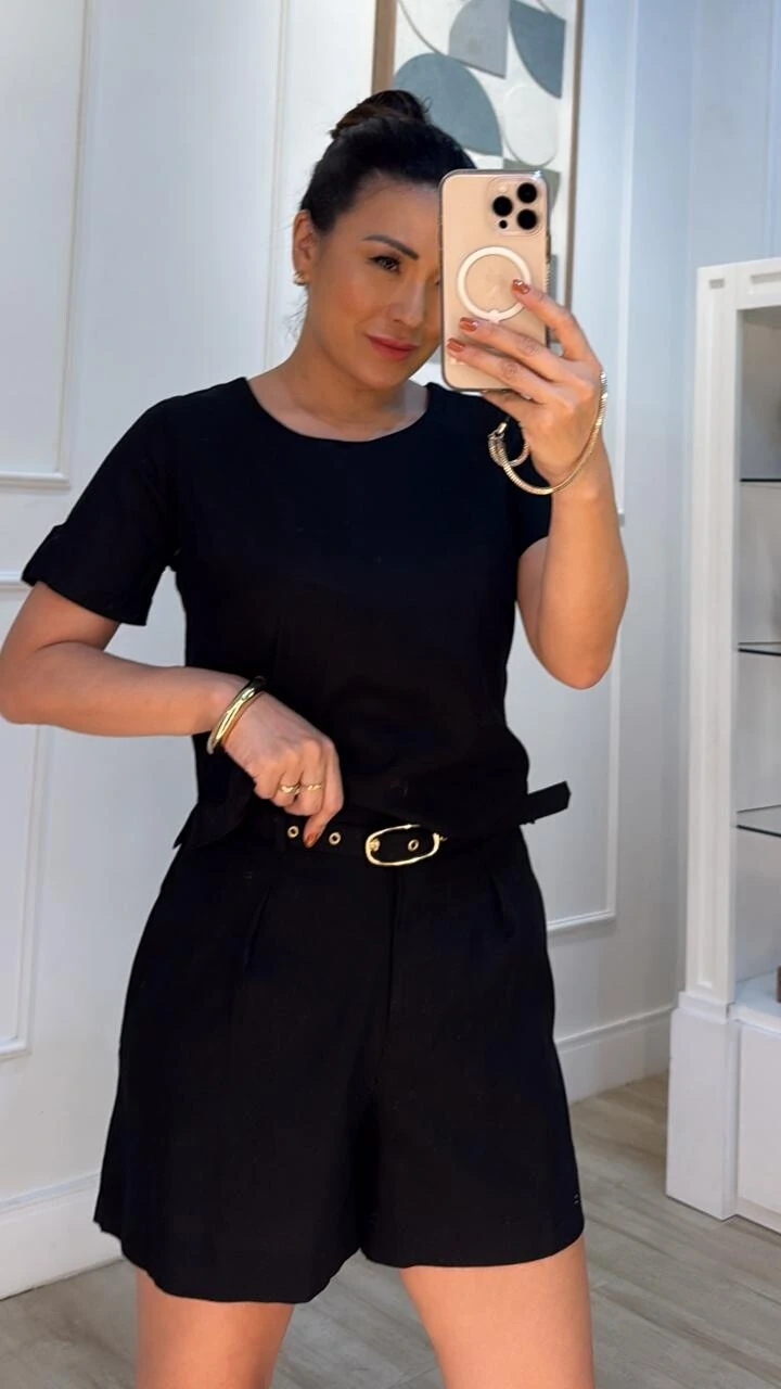 Shorts clochard confeccionado em viscose com linho. Possui passantes, pregas e bolsos frontais, pesponto, fechamento frontal da peça por botão interno e zíper, cinto encapado com fivela dourada.