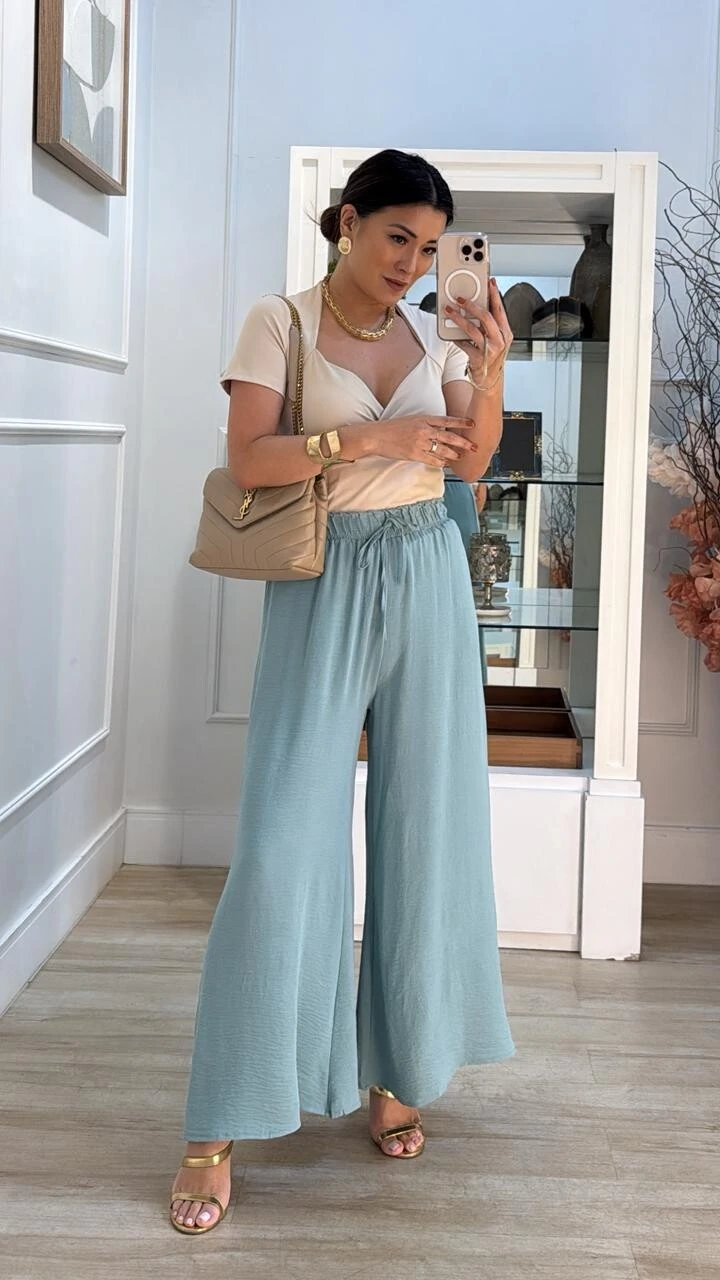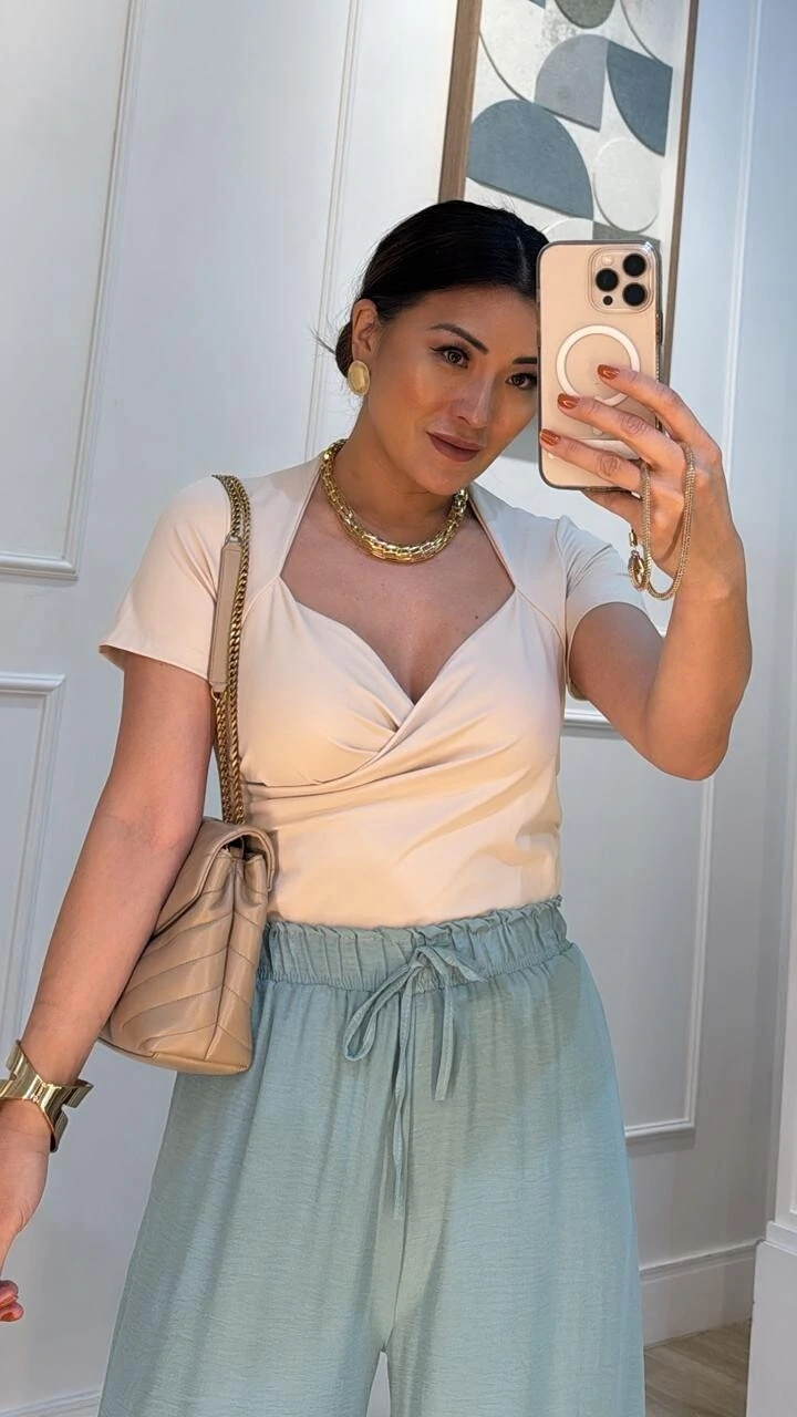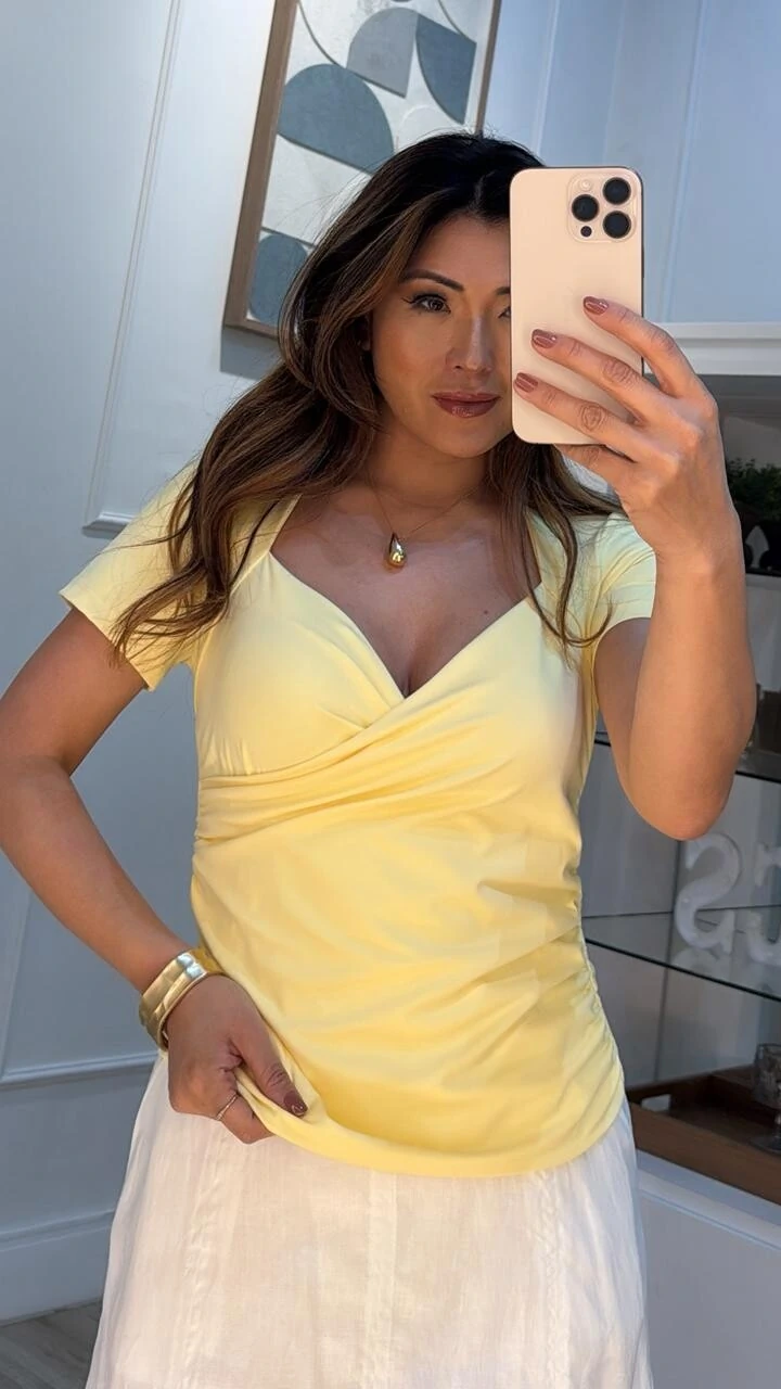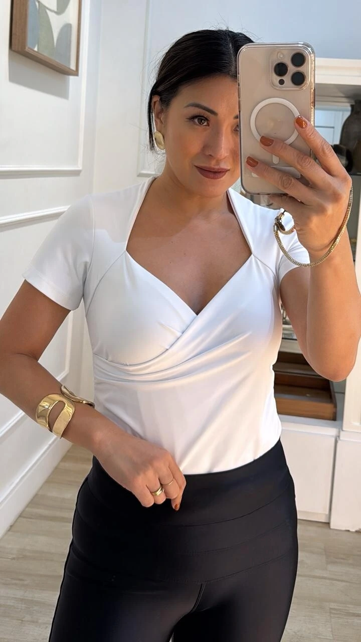 Blusa confeccionada em suplex com tecido duplo. Possui decote v transpassado, mangas curtas, pesponto, e detalhes drapeados laterais.