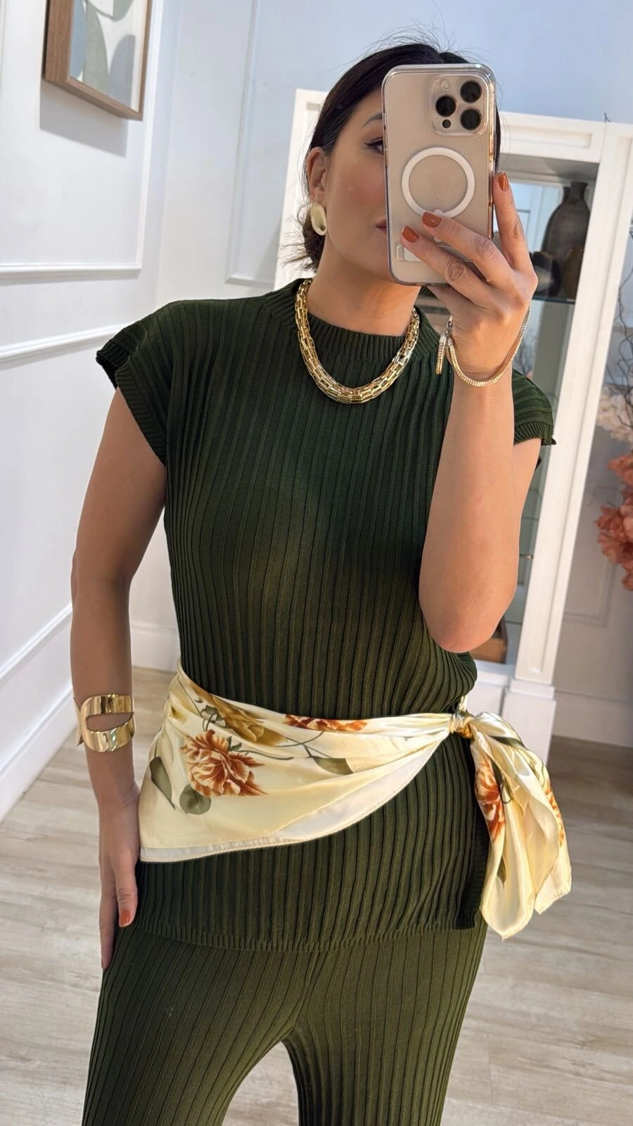 Conjunto confeccionado em tricot com nervuras caneladas. Blusa alongada possui gola alta, alças largas, fendas laterais, gola, punhos e barrado canelados. Calça pantalona possui pala lisa, barrado canelado e forro