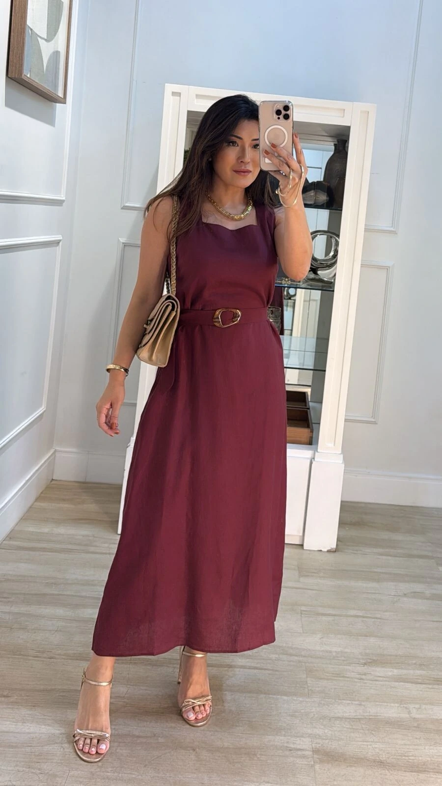 Vestido midi confeccionado em linho. Possui decote quadrado, recorte vazado posterior com fechamento por botão resinado, alças largas, bolsos frontais, pesponto, forro, fechamento posterior da peça por zíper, cinto fivela resinada.