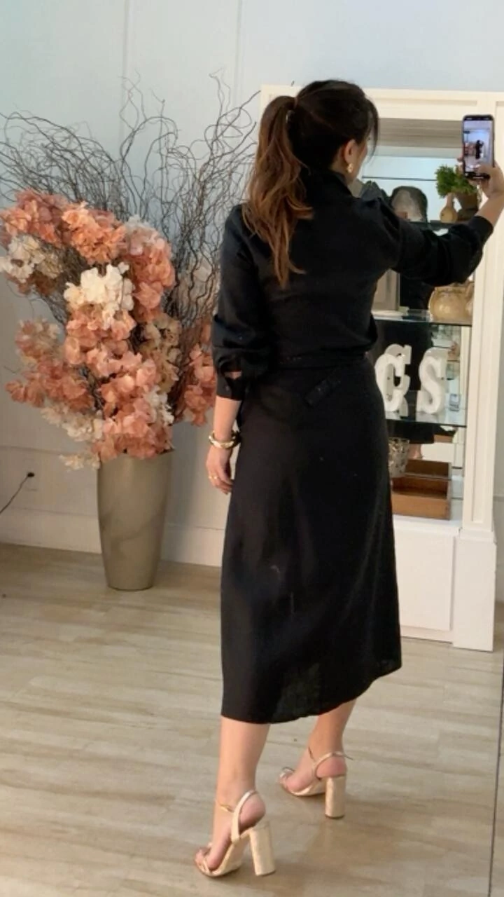 Saia midi confeccionado em linho. Possui pala com passantes laterais, bolsos frontais, fenda frontal, pesponto, forro, fechamento lateral da peça por zíper, cinto com fivela quadrada dourada.