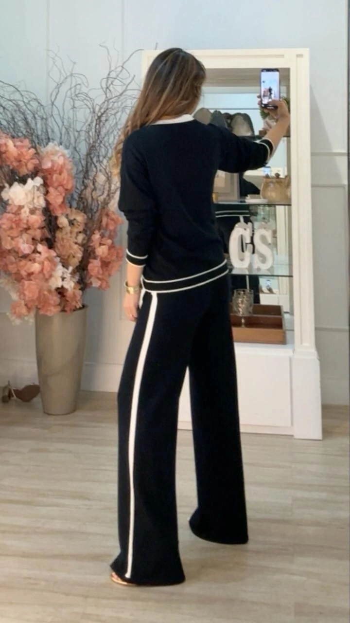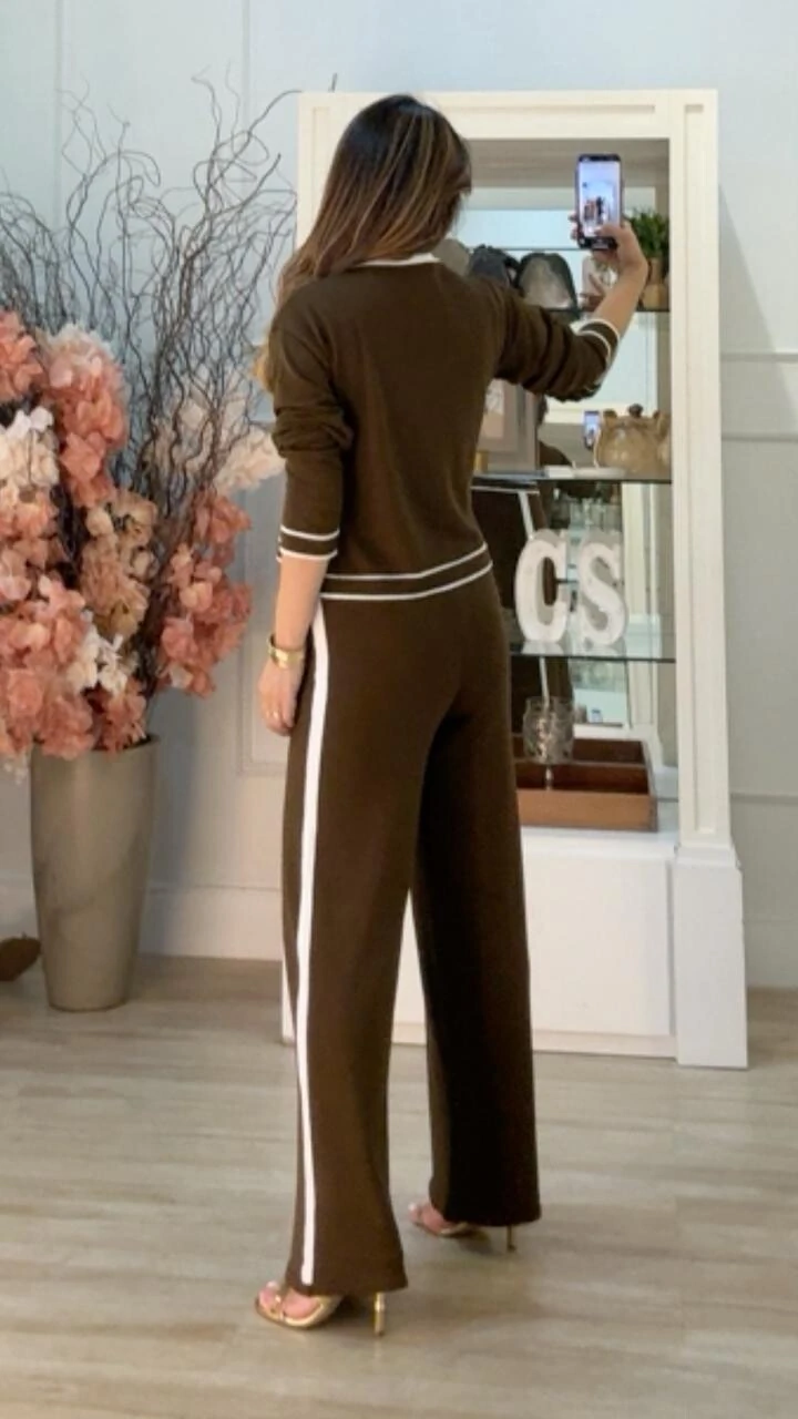Conjunto confeccionado em tricot. Blusa possui gola canoa, mangas longas, detalhe de faixa bicolor na gola, punhos e barrado. Calça possui pala larga e faixa bicolor lateral.