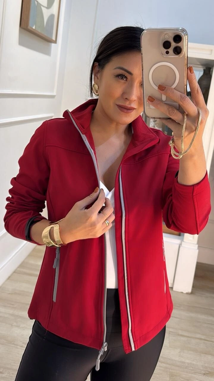 Jaqueta detalhe bicolor, possui forro de pelinho, gola alta, mangas longas, velcro nos punhos, bolsos, e zíperes na parte frontal e nos bolsos.