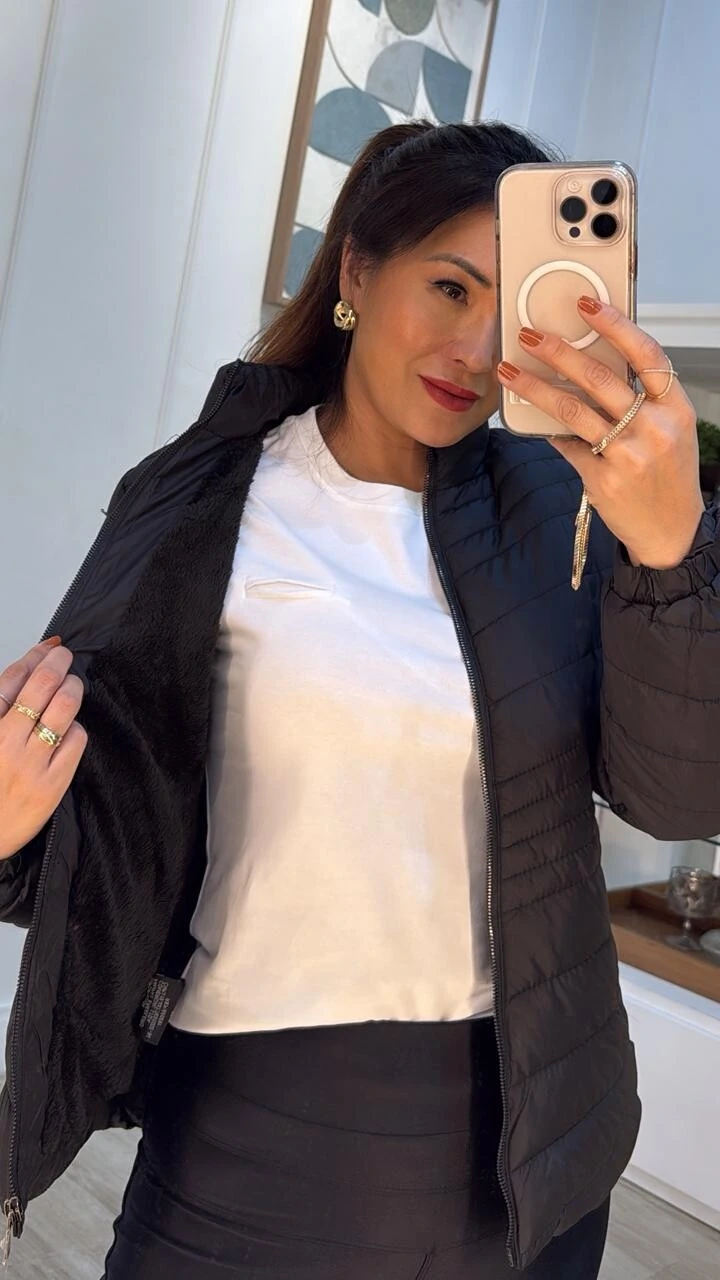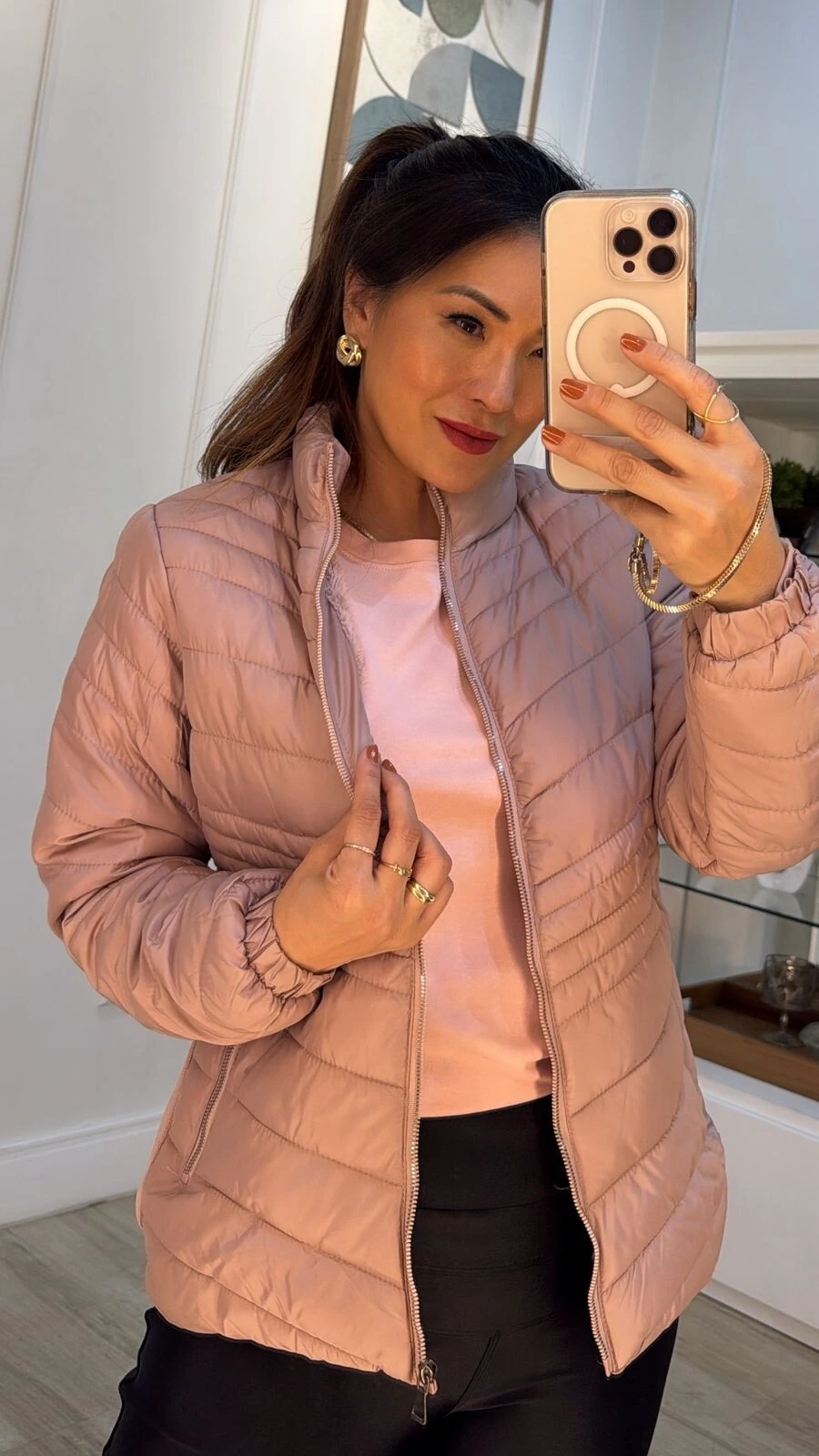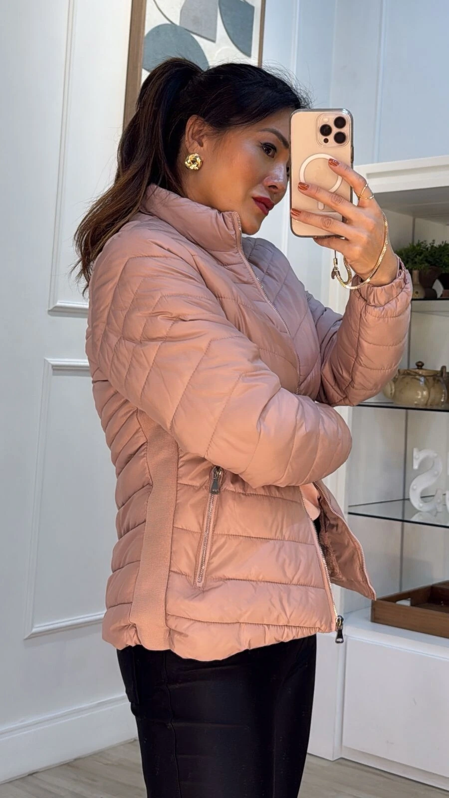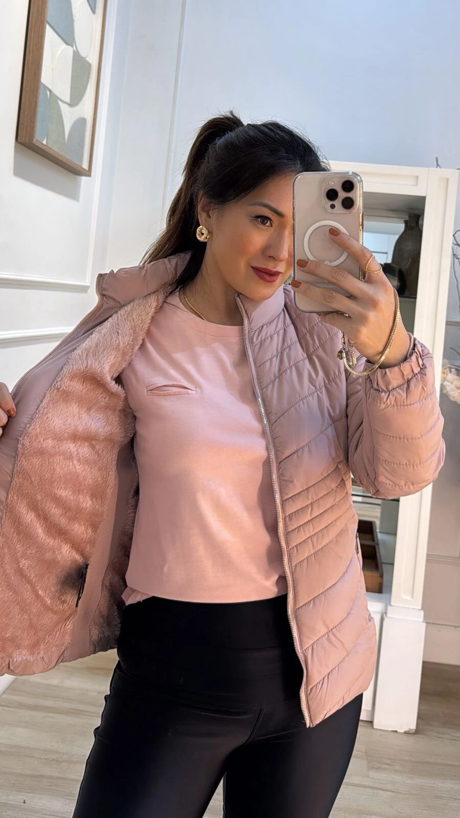 Jaqueta confeccionado em nylon. Possui gola alta, mangas longas, elástico nos punhos, pespontos na diagonal, bolsos frontais, detalhe lateral canelado, forro de pelinho, fechamento frontal da peça e dos punhos por zíper prata.