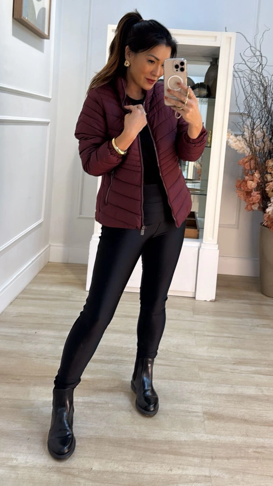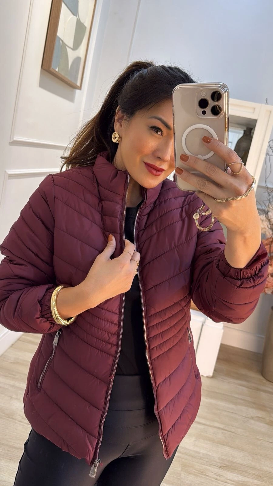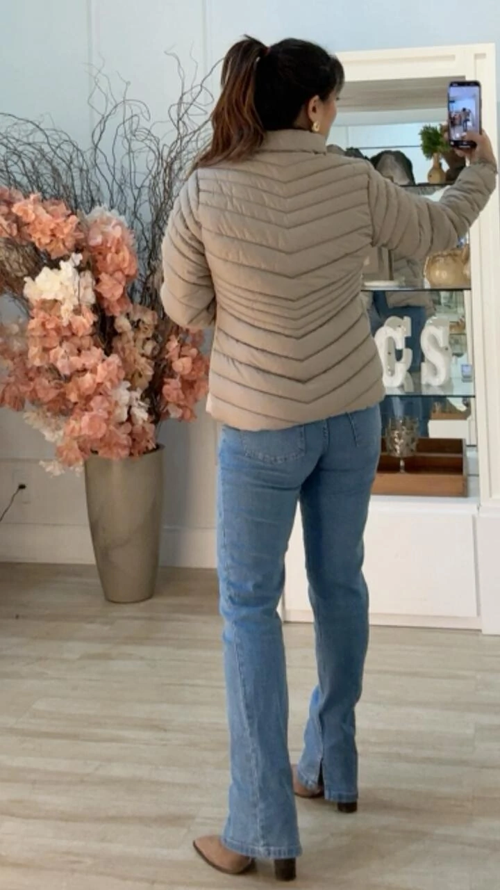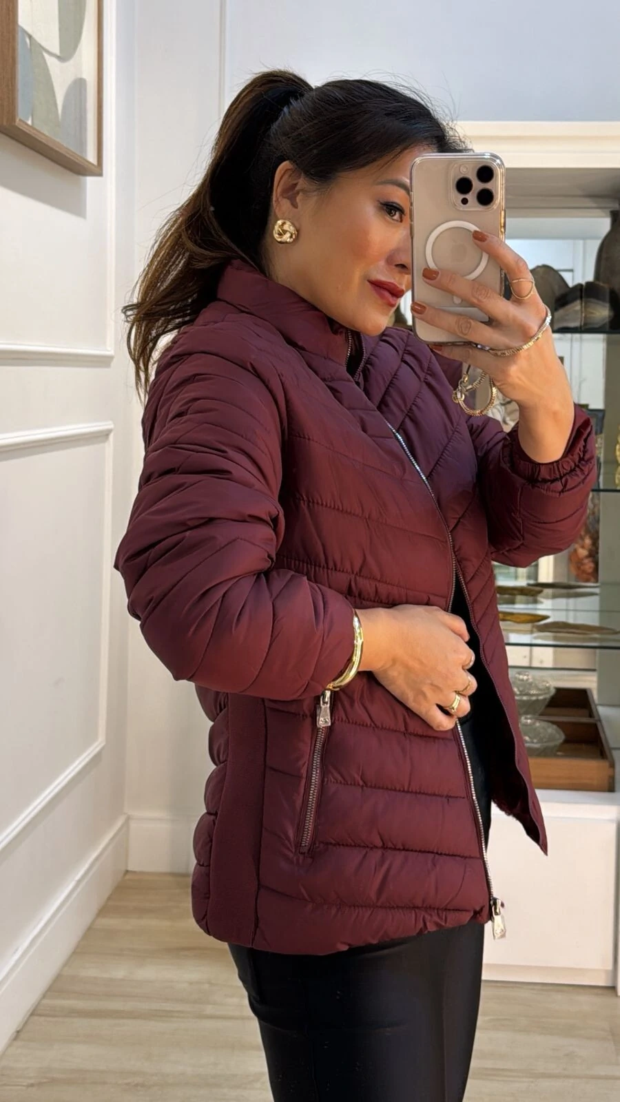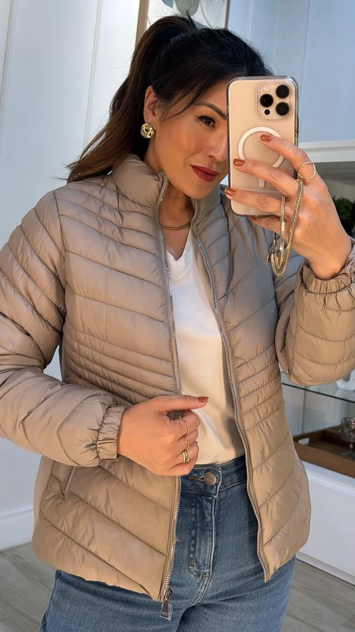 Jaqueta confeccionado em nylon. Possui gola alta, mangas longas, elástico nos punhos, pespontos na diagonal, bolsos frontais, detalhe lateral canelado, forro de pelinho, fechamento frontal da peça e dos punhos por zíper prata.