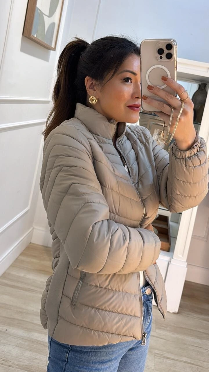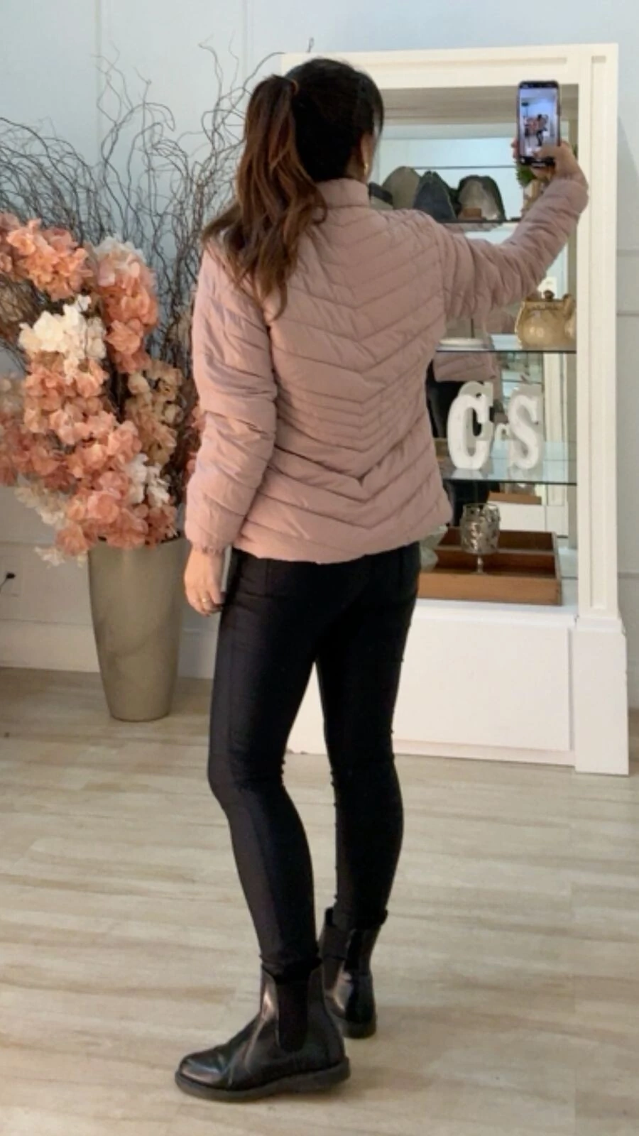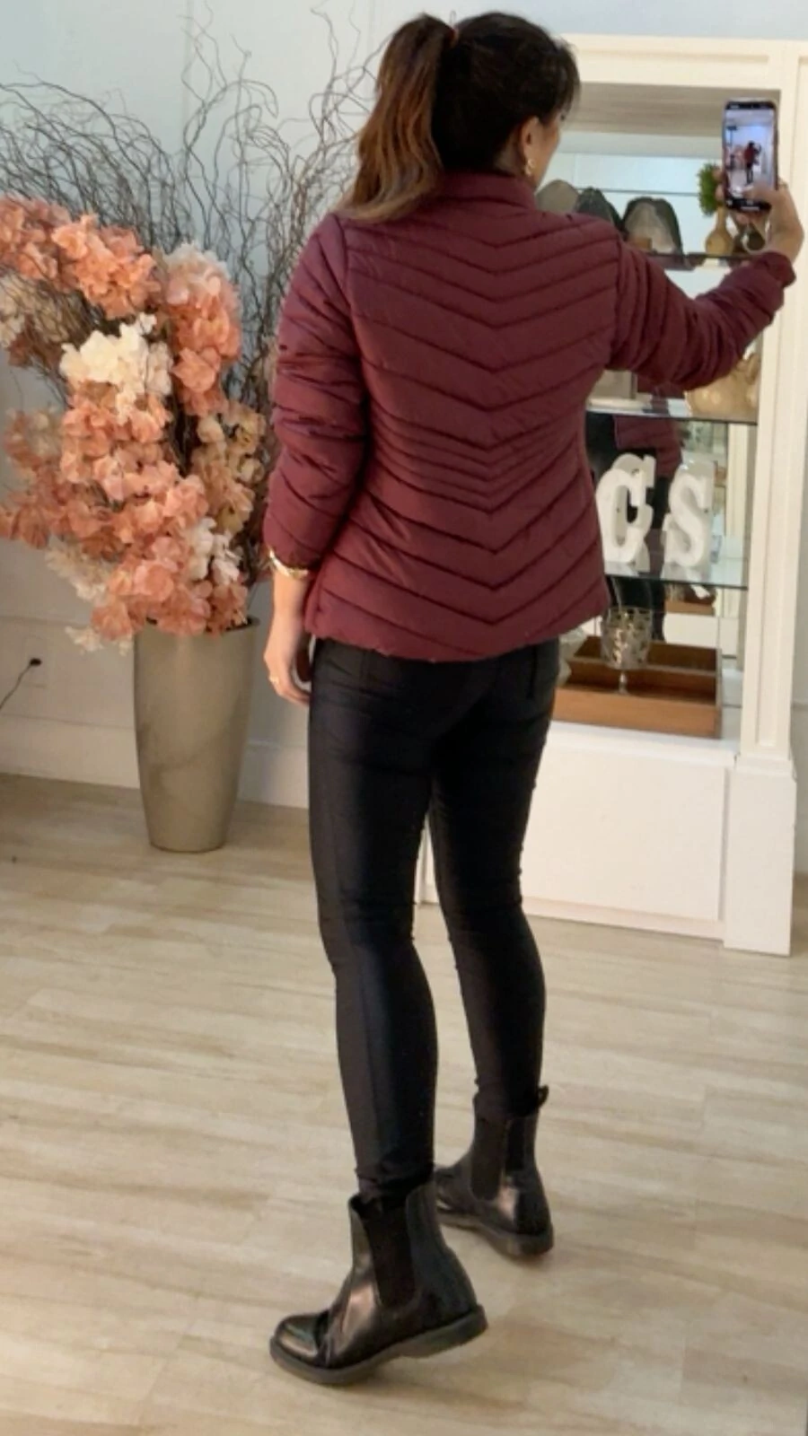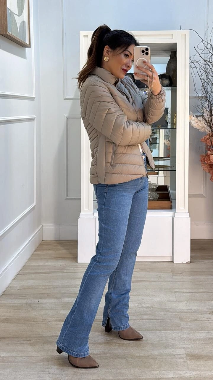 Jaqueta confeccionado em nylon. Possui gola alta, mangas longas, elástico nos punhos, pespontos na diagonal, bolsos frontais, detalhe lateral canelado, forro de pelinho, fechamento frontal da peça e dos punhos por zíper prata.
