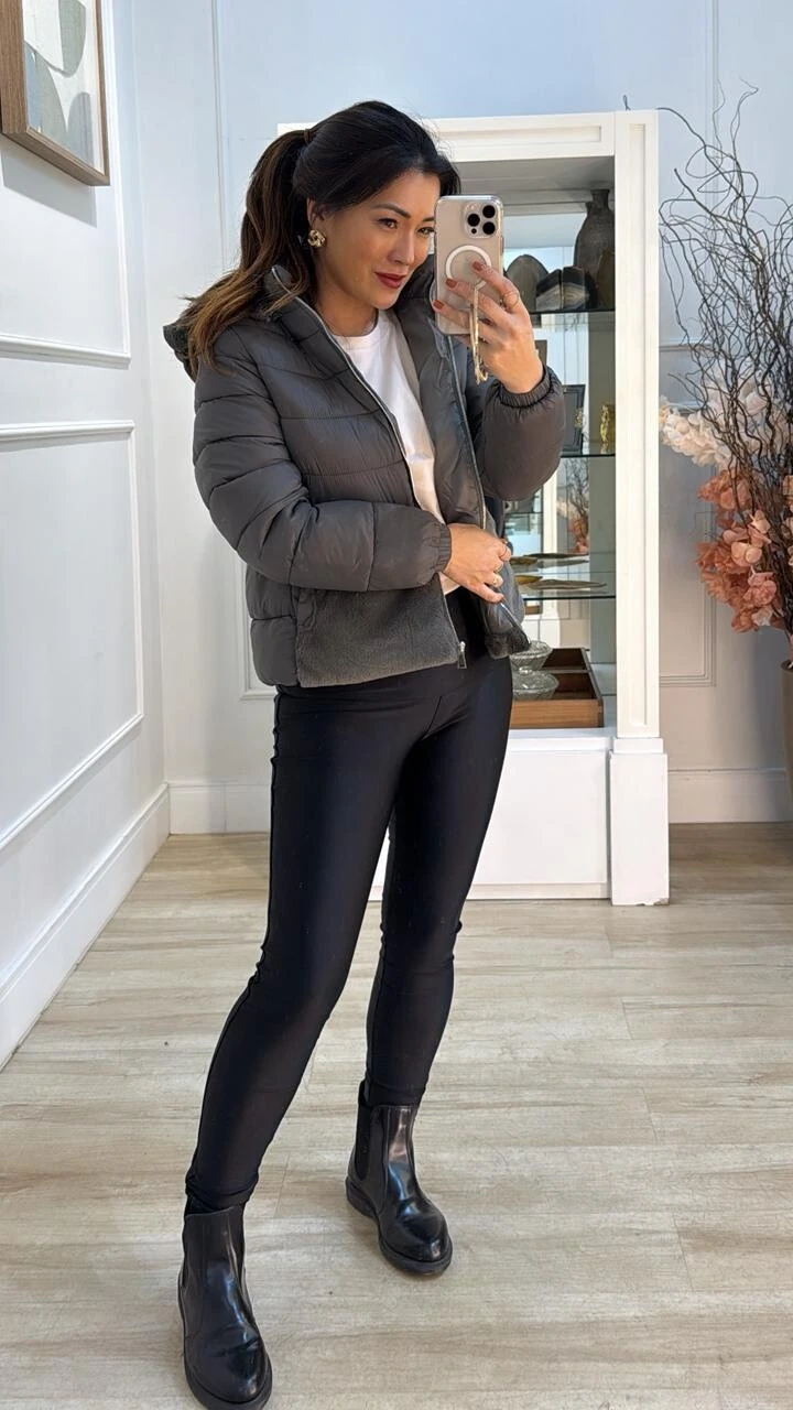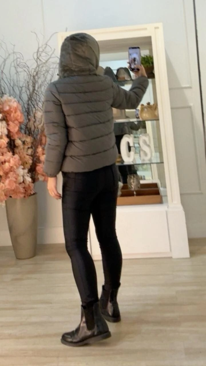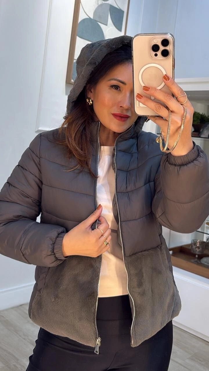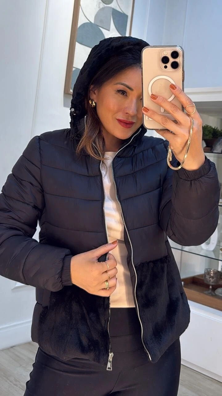 Jaqueta confeccionada em nylon com detalhe em teddy. Possui gola alta, capuz removível, gola e barrado em teddy, mangas longas, bolsos frontais, elástico nos punhos, forro, pesponto, e fechamento frontal da peça por zíper.