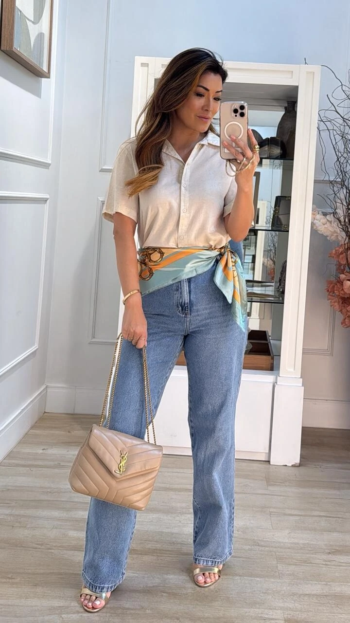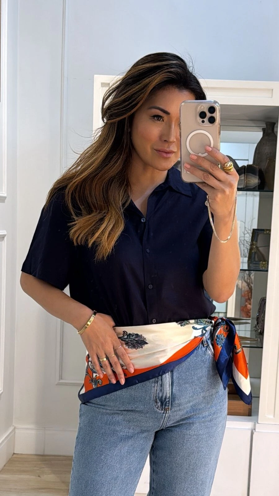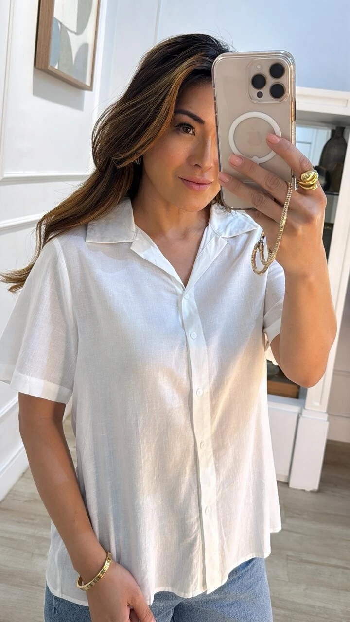 Camisa confeccionada em linho. Possui gola, mangas curtas, pesponto, prega posterior, fechamento frontal da peça por botões.