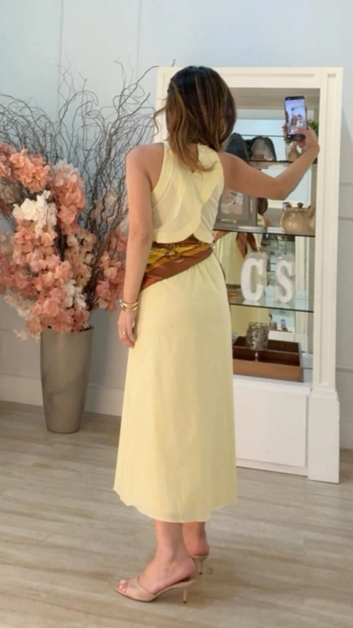 Vestido cavado midi confeccionado em tricoline. Possui gola careca, alças finas, bolsos, recorte vazado em gota posterior com fechamento por botão resinado, detalhe transpassado e vazado posterior, pesponto, forro e fechamento pela parte lateral da peça por zíper.