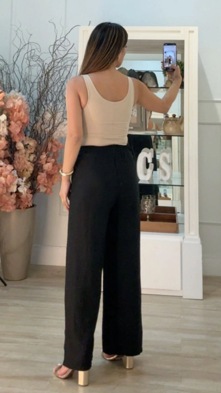 Calça pantalona. Possui pala larga com elástico, amarração regulável frontal, bolsos e pesponto.