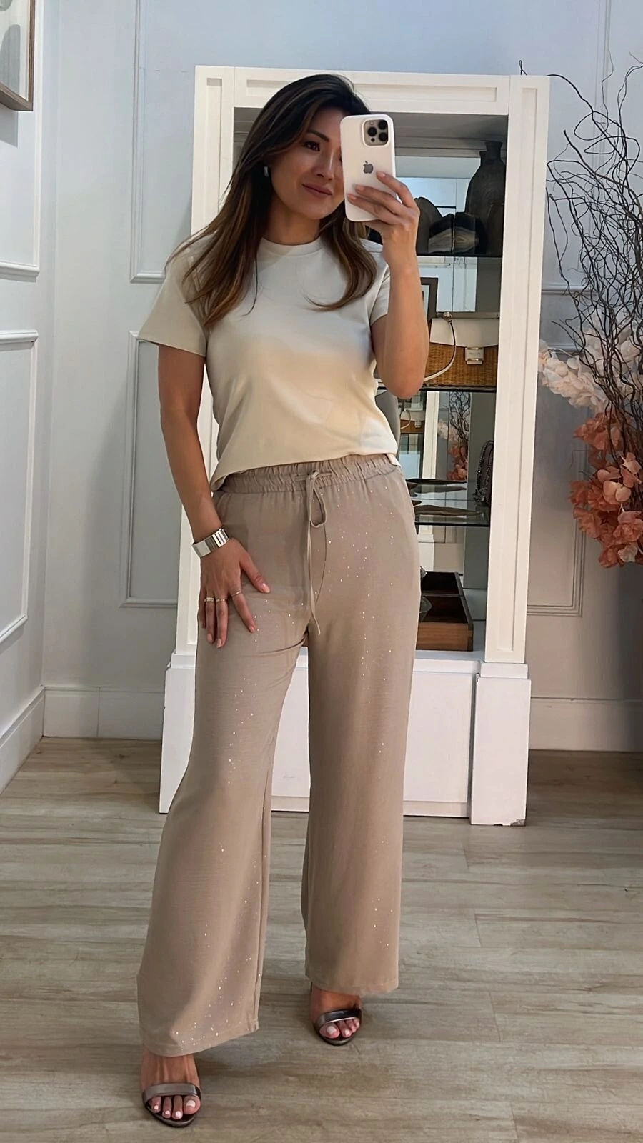 Calça pantalona com brilho. Possui pala larga com elástico, amarração regulável frontal, bolsos, pesponto,