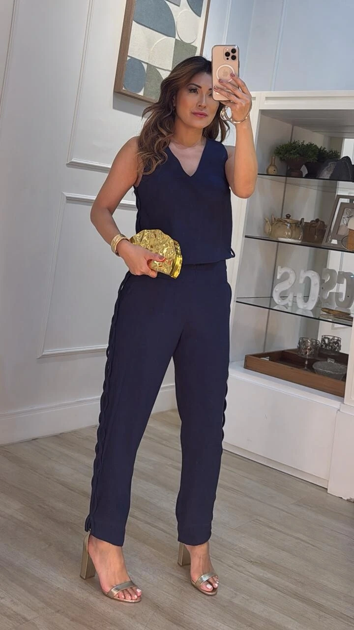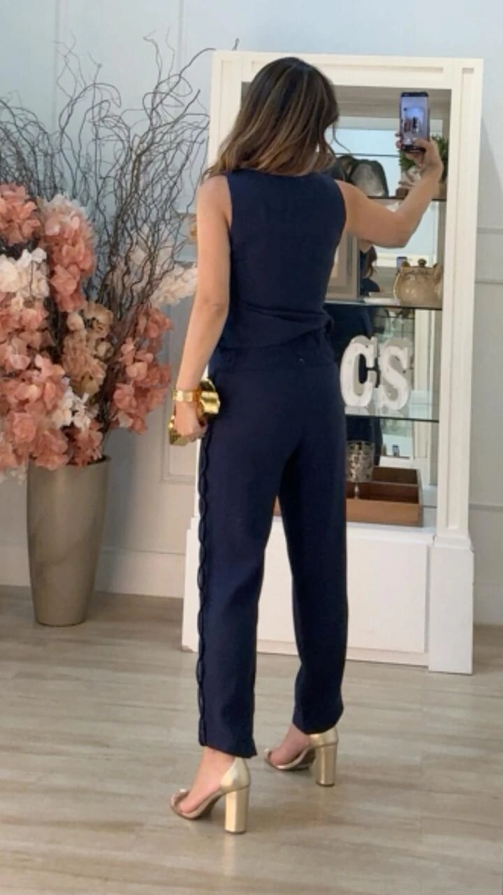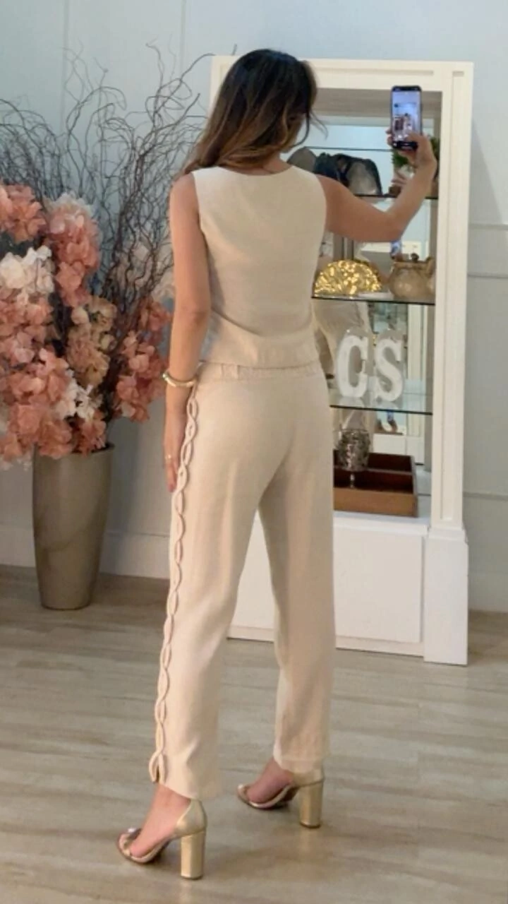 Calça confeccionada em viscose com linho. Possui pala larga com elástico franzido, bolsos frontais, detalhe trançado lateral, pesponto, barrado assimétrico e forro.