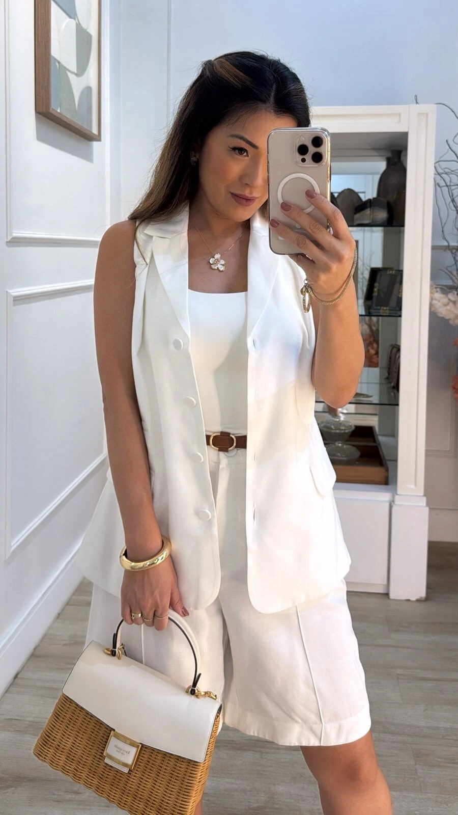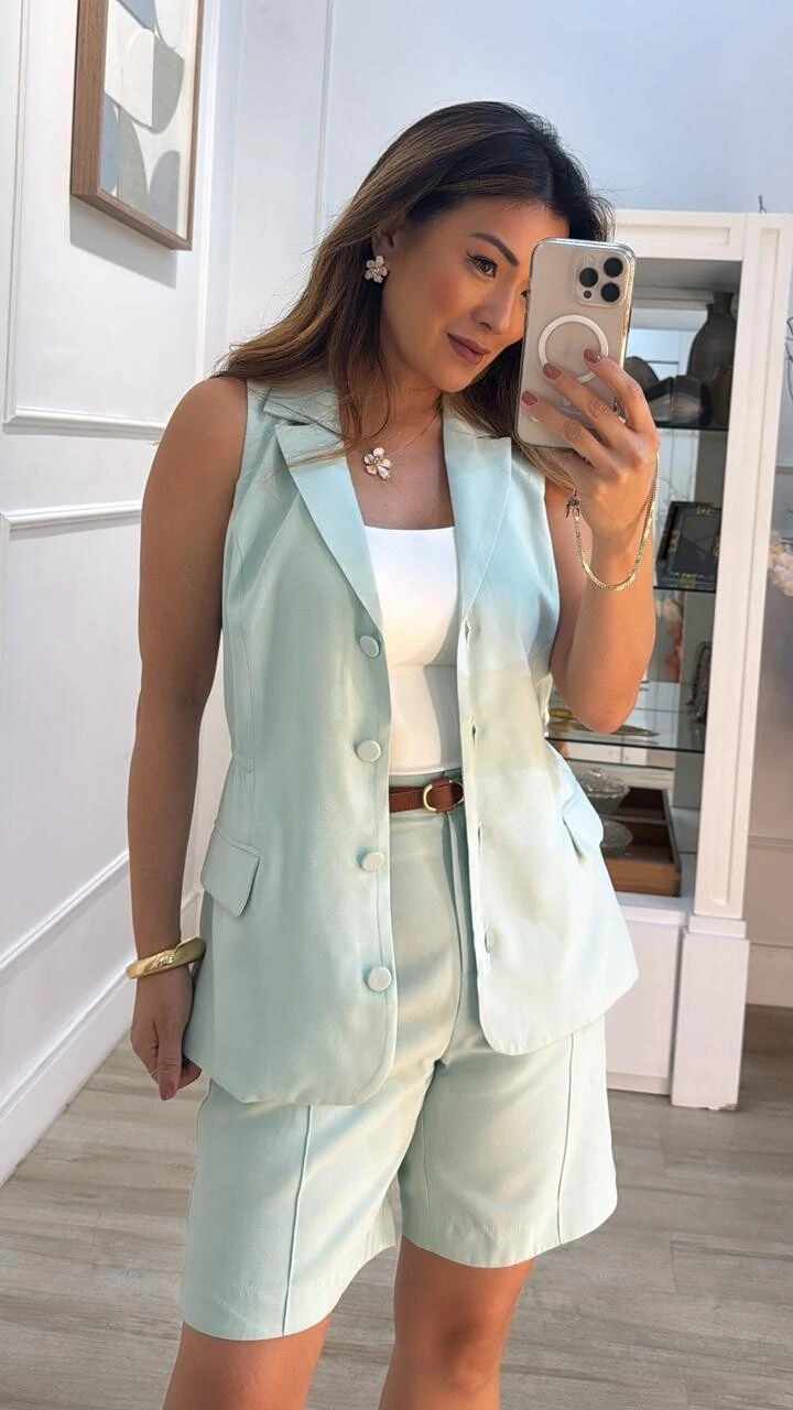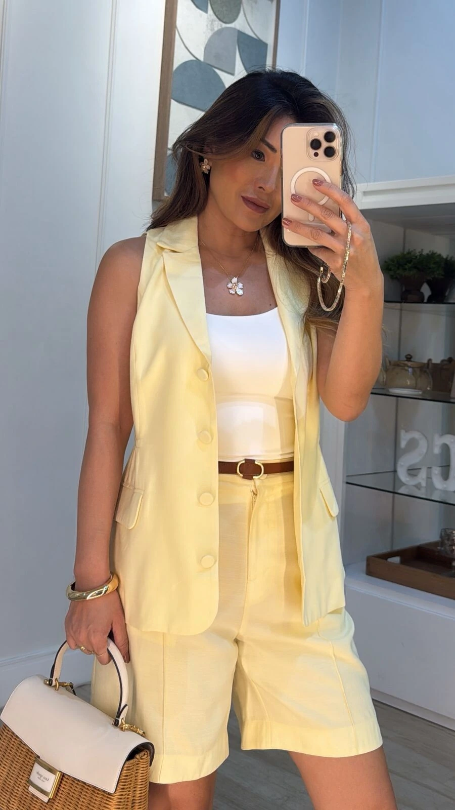 Colete alongado em alfaiataria. Possui forro, elástico franzido na cintura, bolsos fake com lapela, e botões forrados frontais para fechamento da peça.