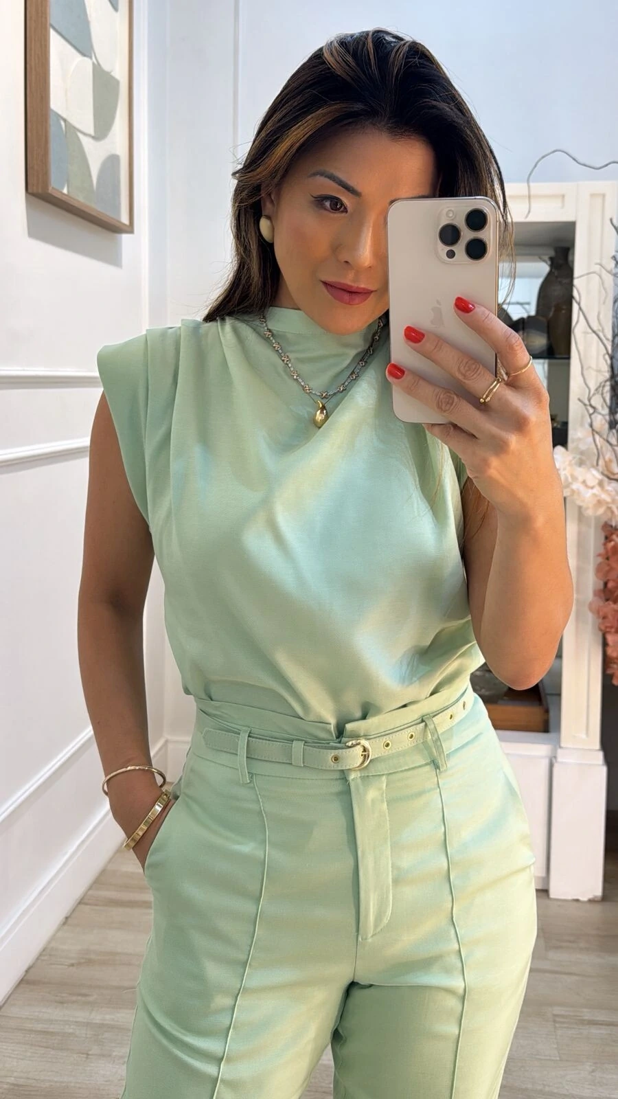 Blusa muscle confeccionada em twill. Possui gola canoa com amarração posterior, alças largas, drapeadas nos ombros e laterais, decote v posterior, pesponto, barrado assimétrico, e fenda lateral.
