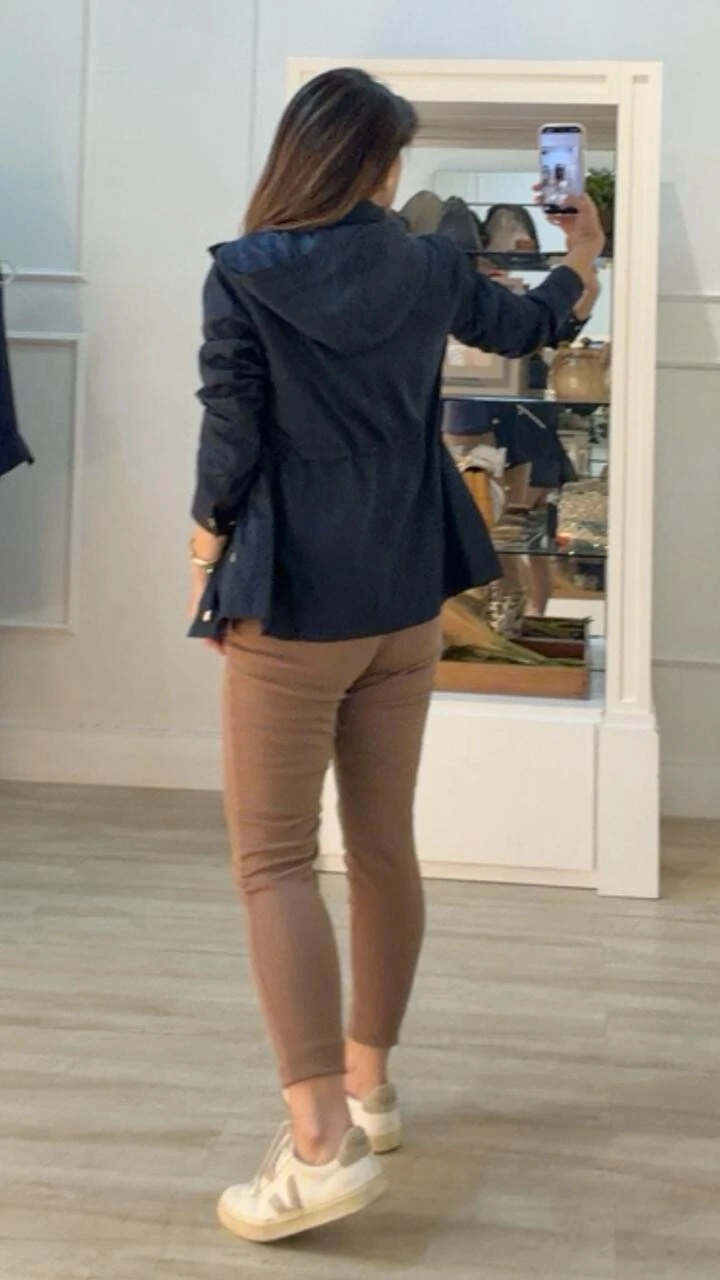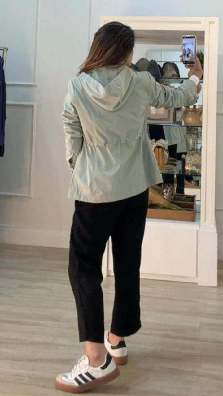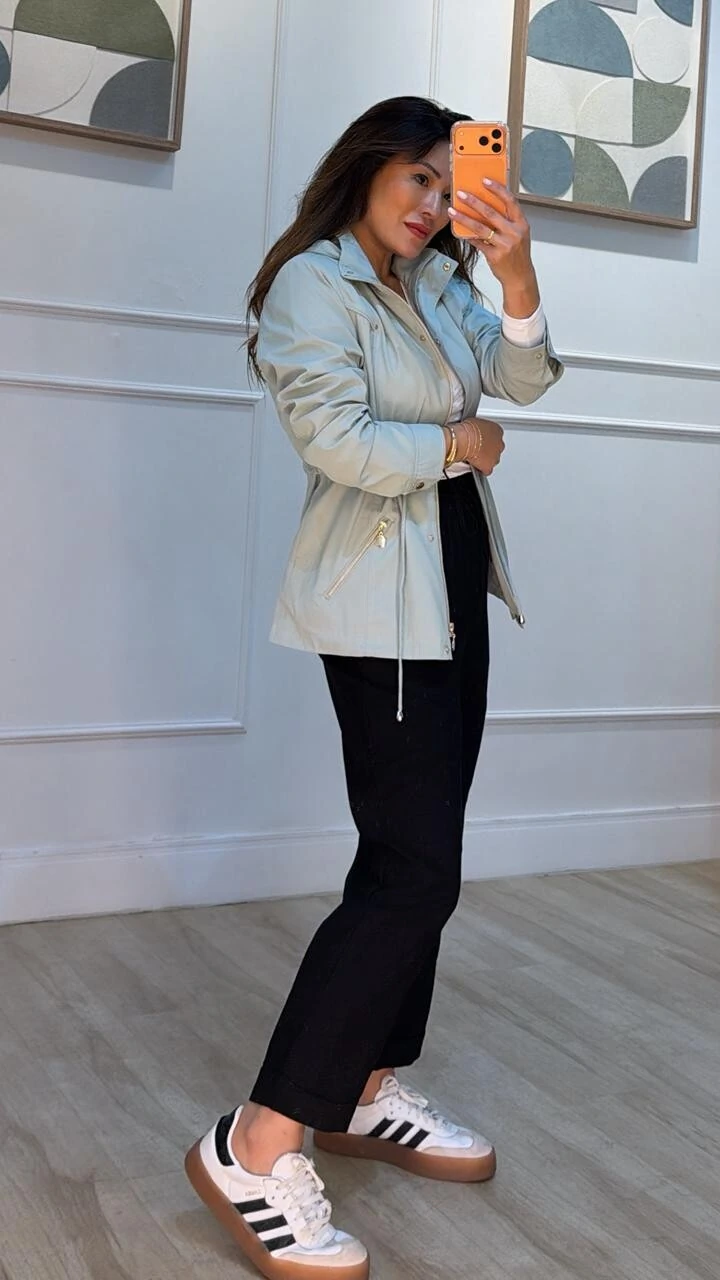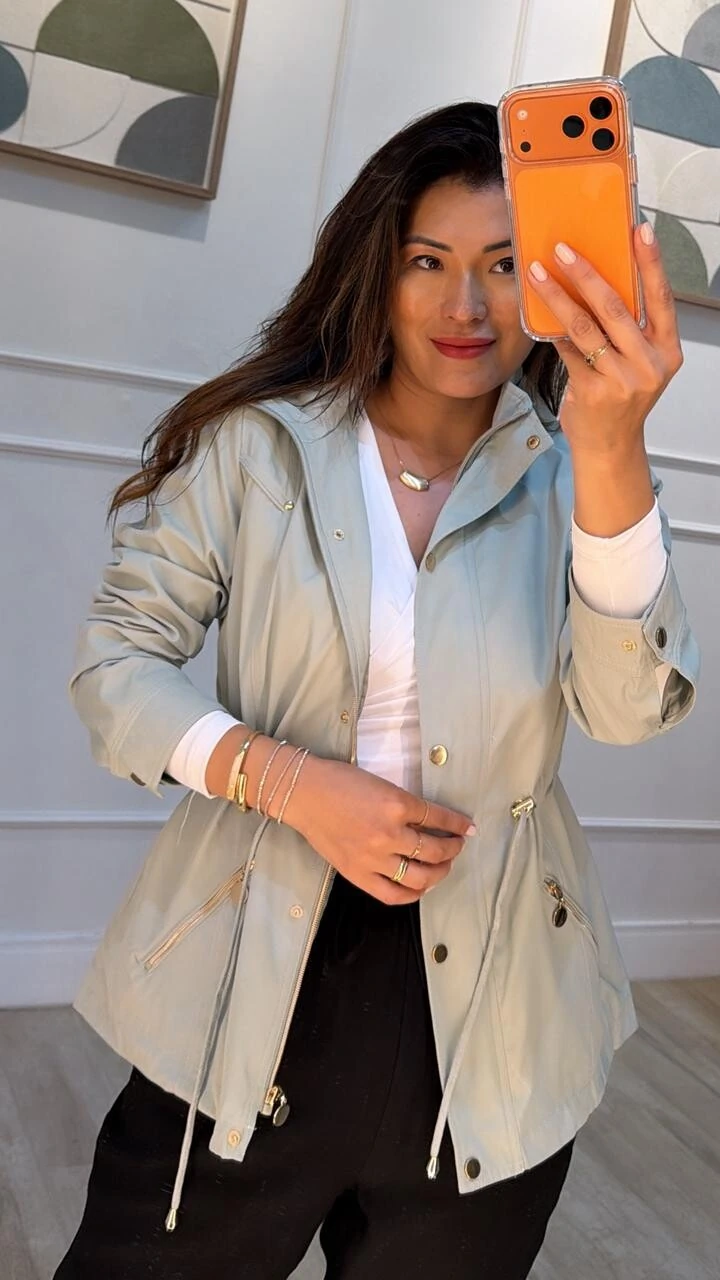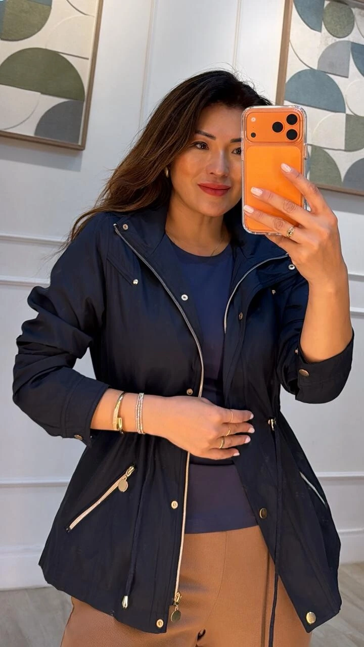 Parka gola alta, capuz removível, mangas longas com fechamento dos punhos por botões dourados, ombreiras, bolsos diagonais com fechamento por zíper dourado, pesponto, puxadores reguláveis na cintura, forro, e fechamento pela parte frontal da peça por zíper e botões dourados.