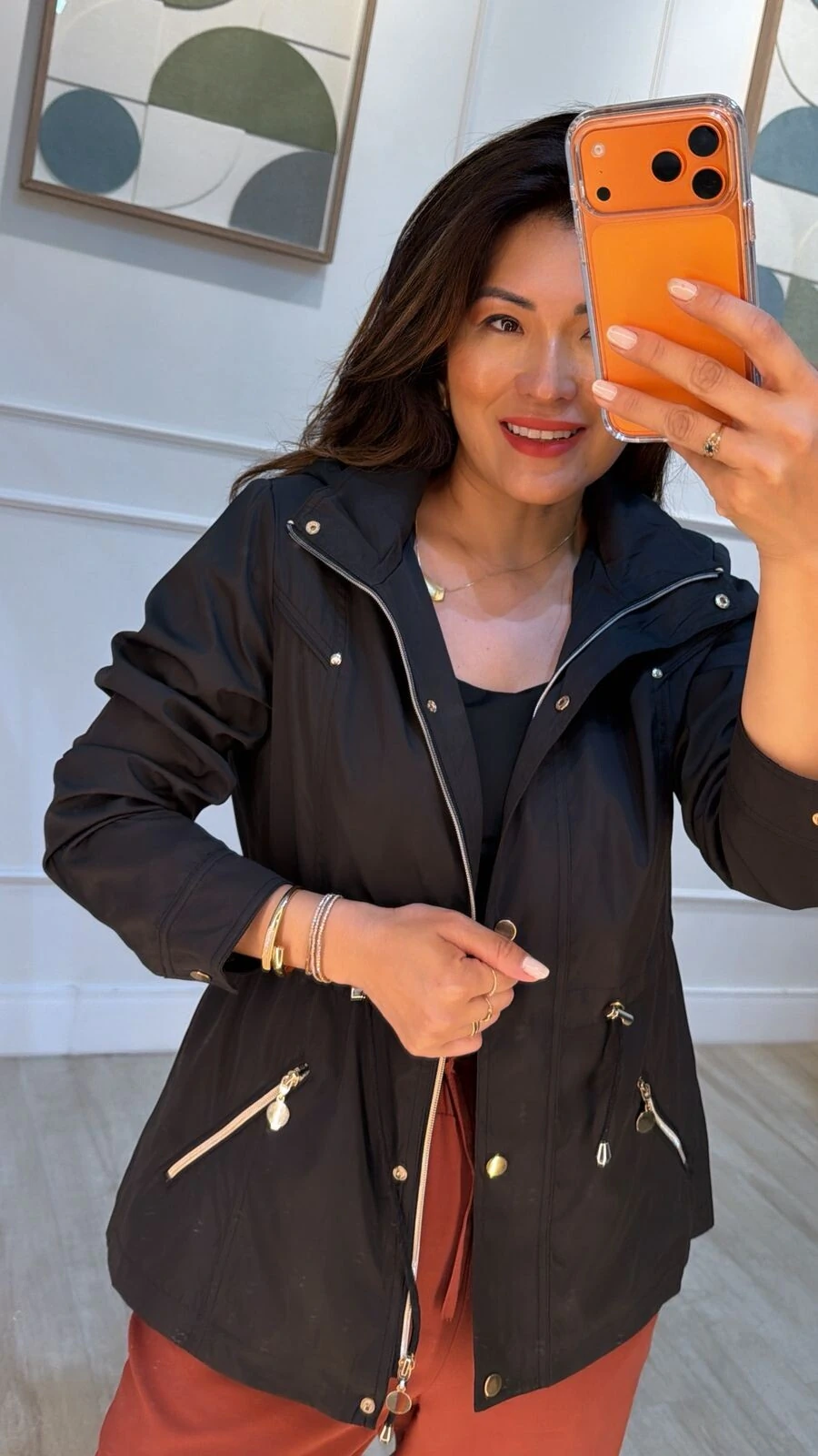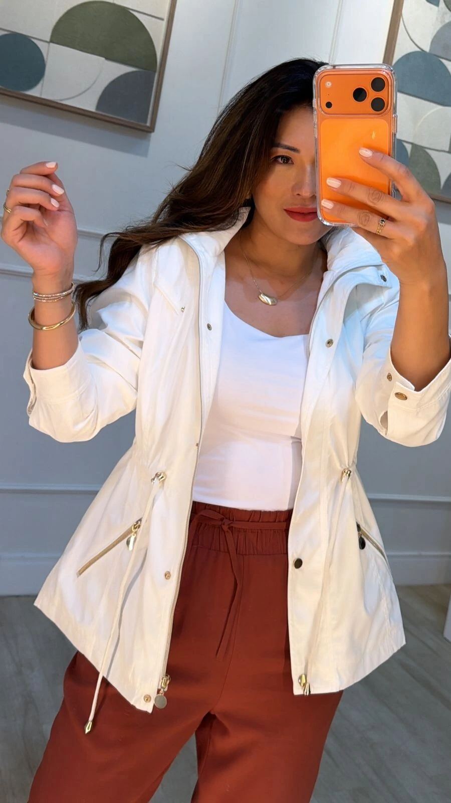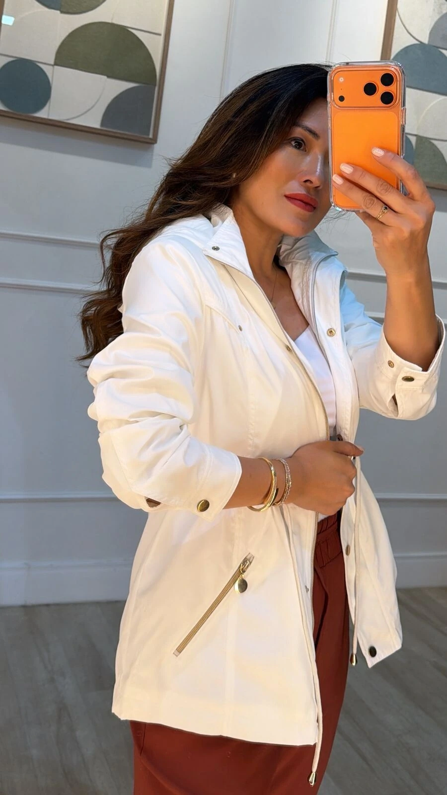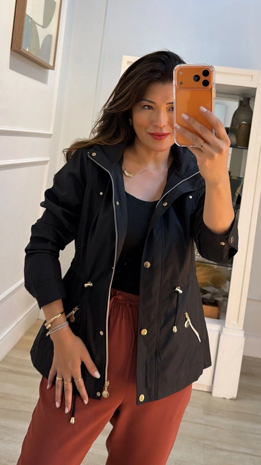 Parka gola alta, capuz removível, mangas longas com fechamento dos punhos por botões dourados, ombreiras, bolsos diagonais com fechamento por zíper dourado, pesponto, puxadores reguláveis na cintura, forro, e fechamento pela parte frontal da peça por zíper e botões dourados.