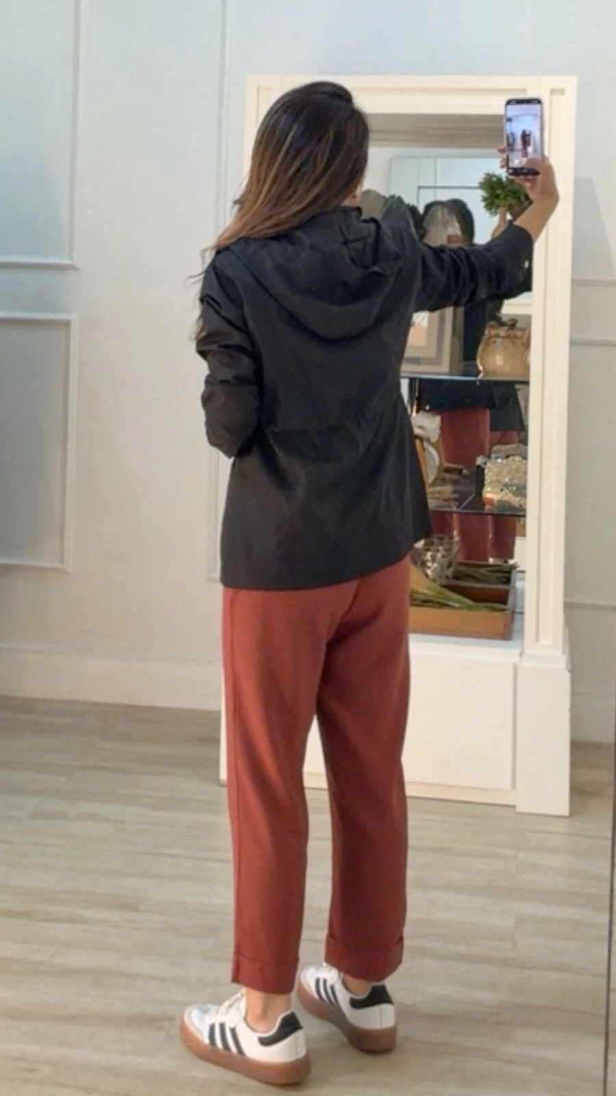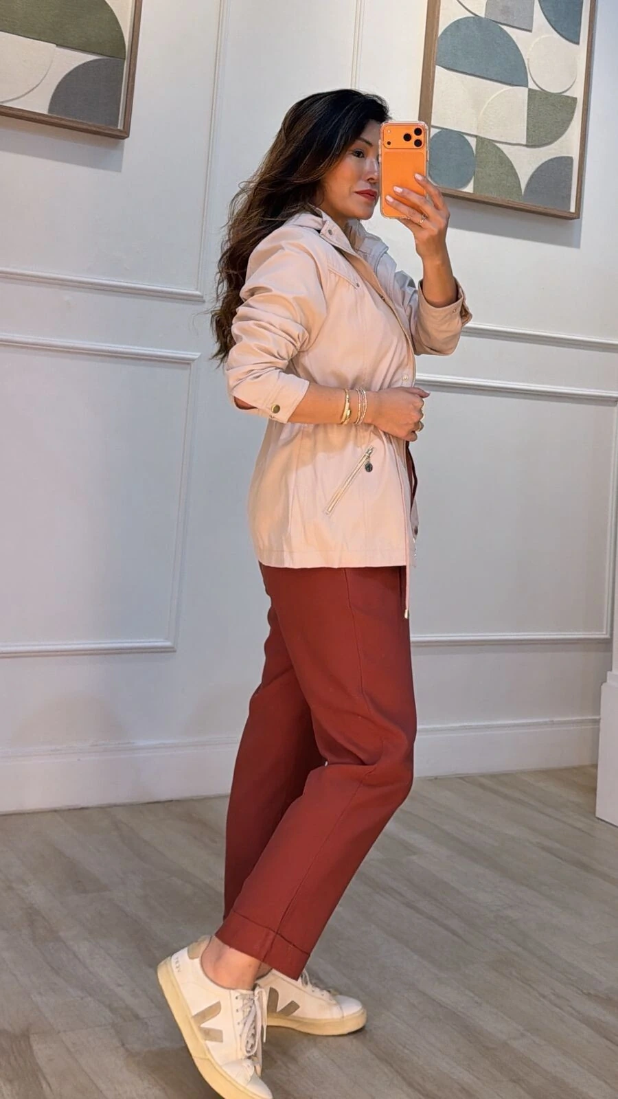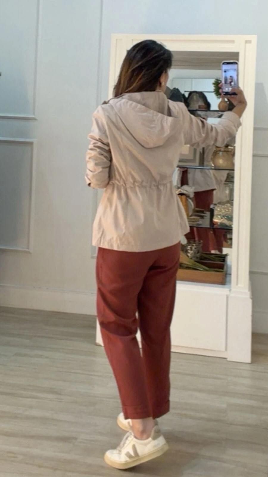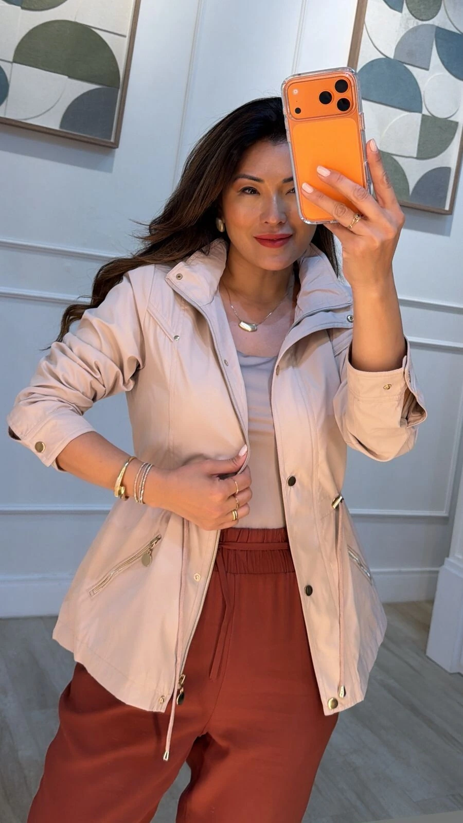 Parka gola alta, capuz removível, mangas longas com fechamento dos punhos por botões dourados, ombreiras, bolsos diagonais com fechamento por zíper dourado, pesponto, puxadores reguláveis na cintura, forro, e fechamento pela parte frontal da peça por zíper e botões dourados.