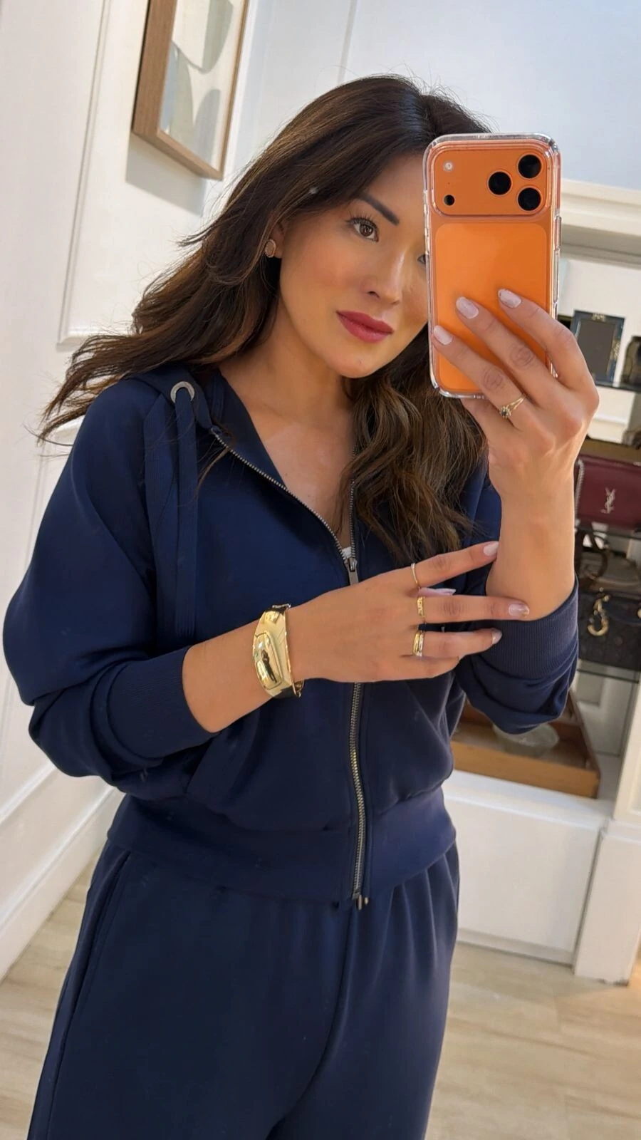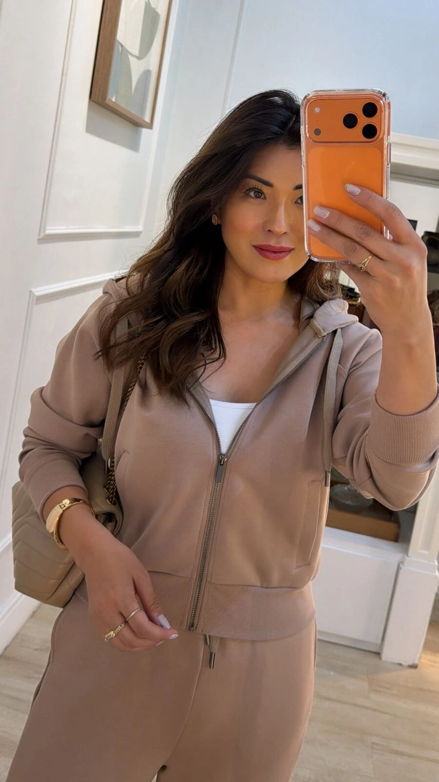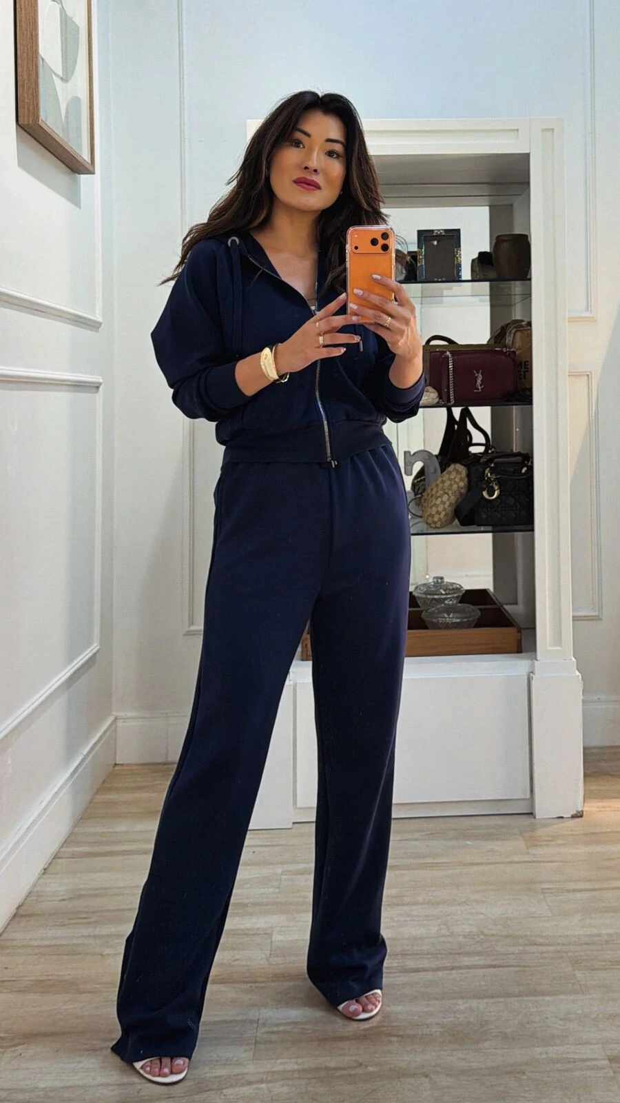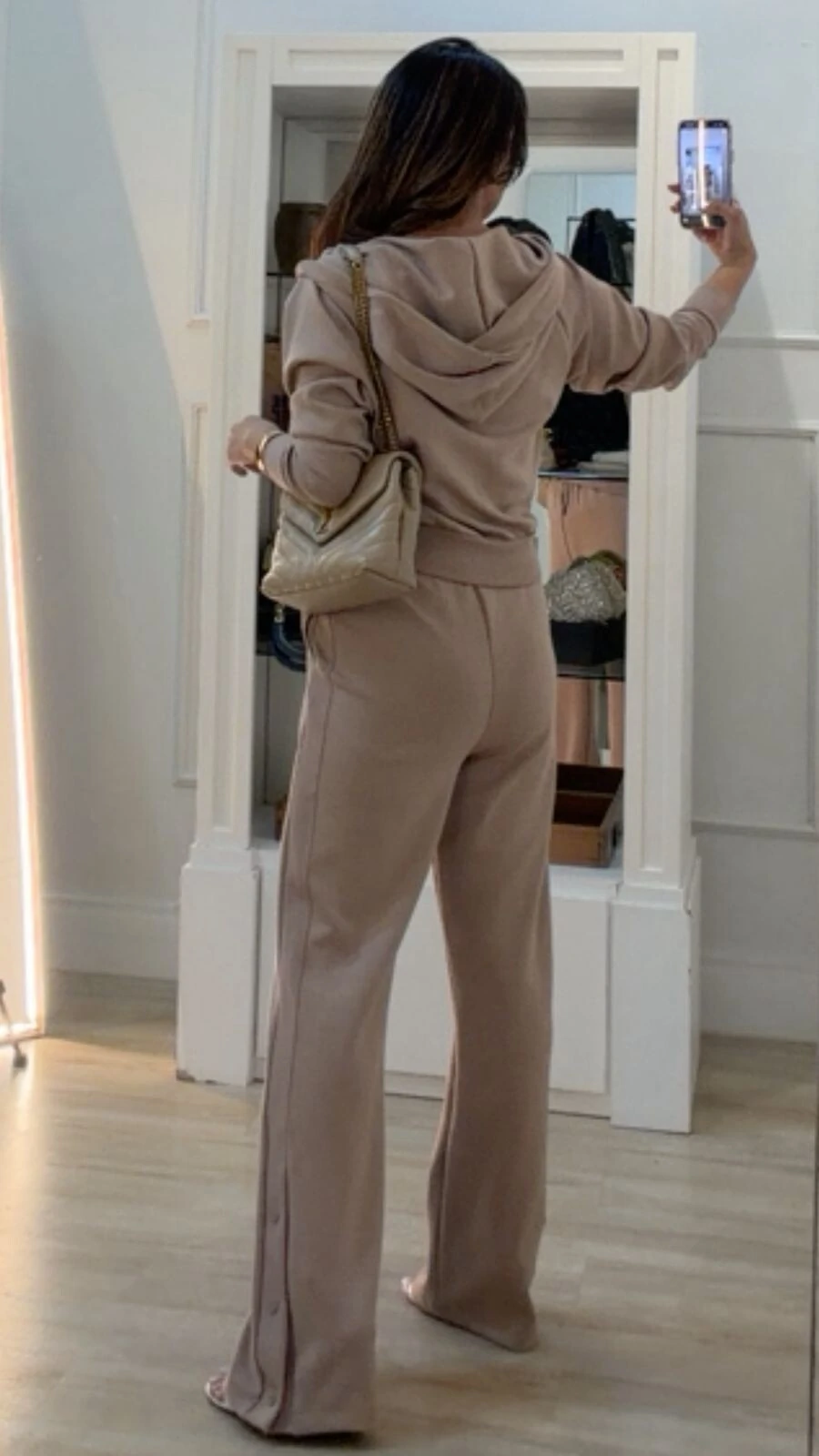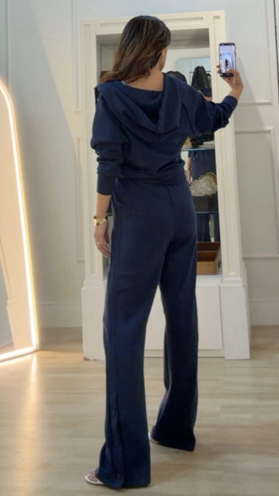 Conjunto confeccionado em moletom. Blusa possui gola com puxadores reguláveis, mangas longas, detalhe canelado, bolsos frontais, fechamento frontal da peça por zíper, punhos e barrado canelados. Calça pantalona possui pala larga com elástico franzido e amarração frontal, bolsos frontais, detalhe canelado lateral, e botões no barrado.