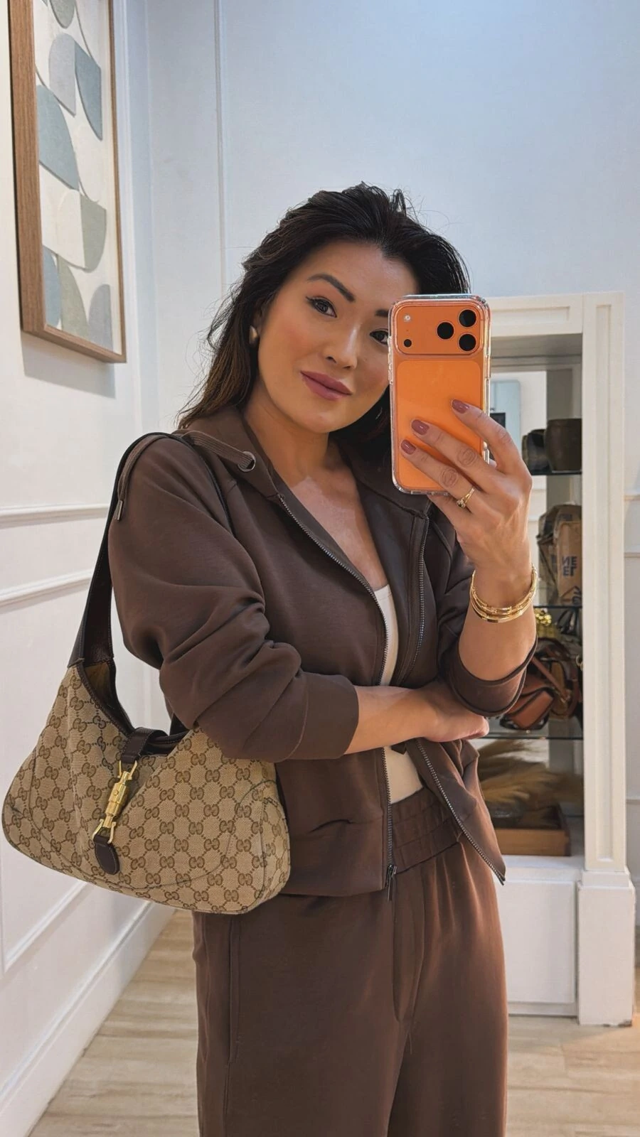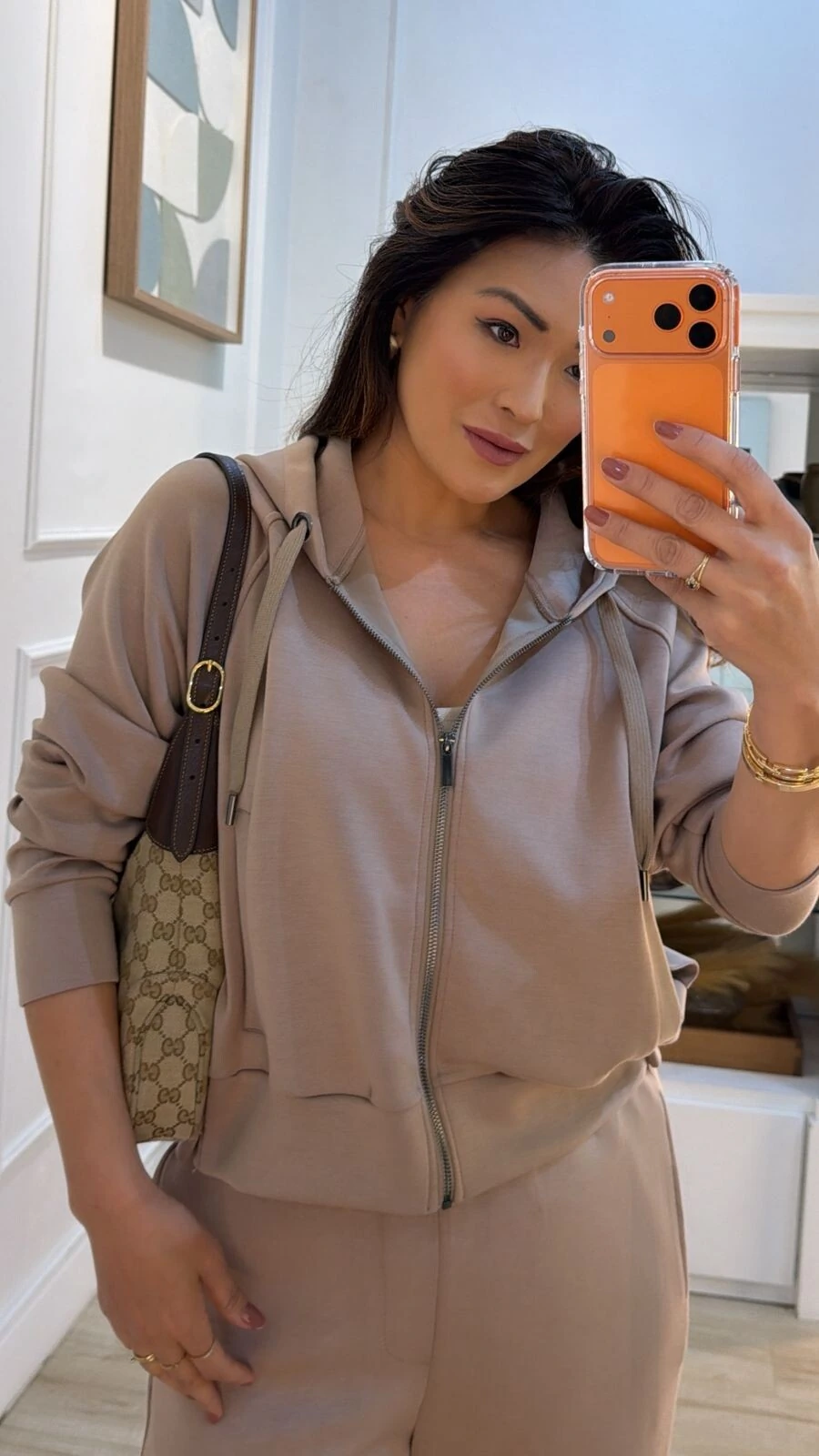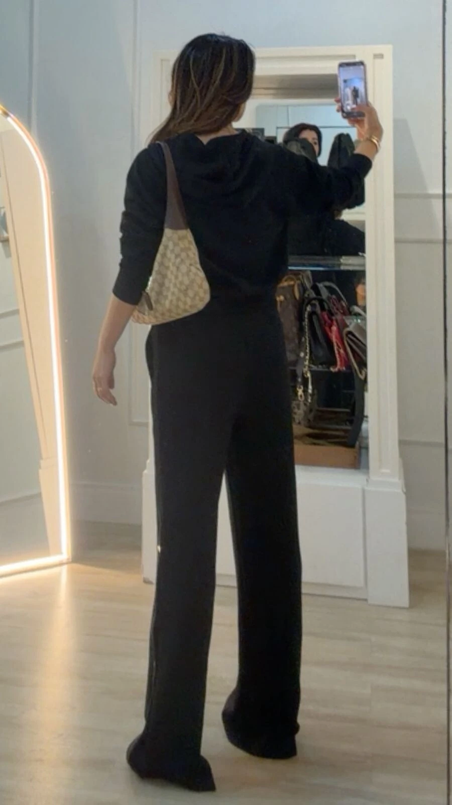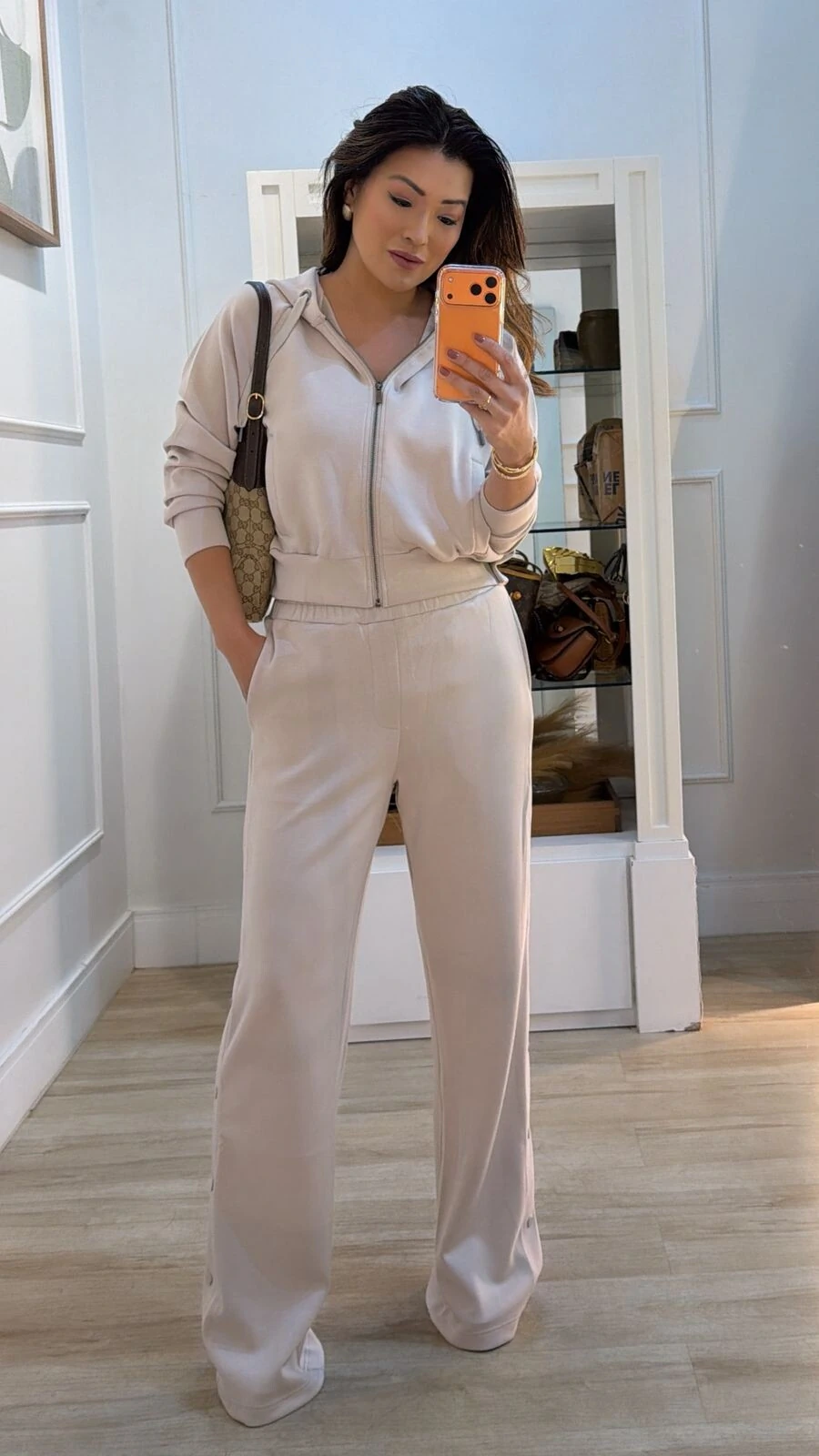 Conjunto confeccionado em moletom. Blusa possui capuz com puxadores reguláveis, mangas longas, punhos e barrado largos, bolsos frontais, detalhe de botões laterais, fechamento frontal da peça por zíper. Calça pantalona possui pala larga com elástico franzido, bolsos frontais, faixa lateral com detalhe de botões no barrado.