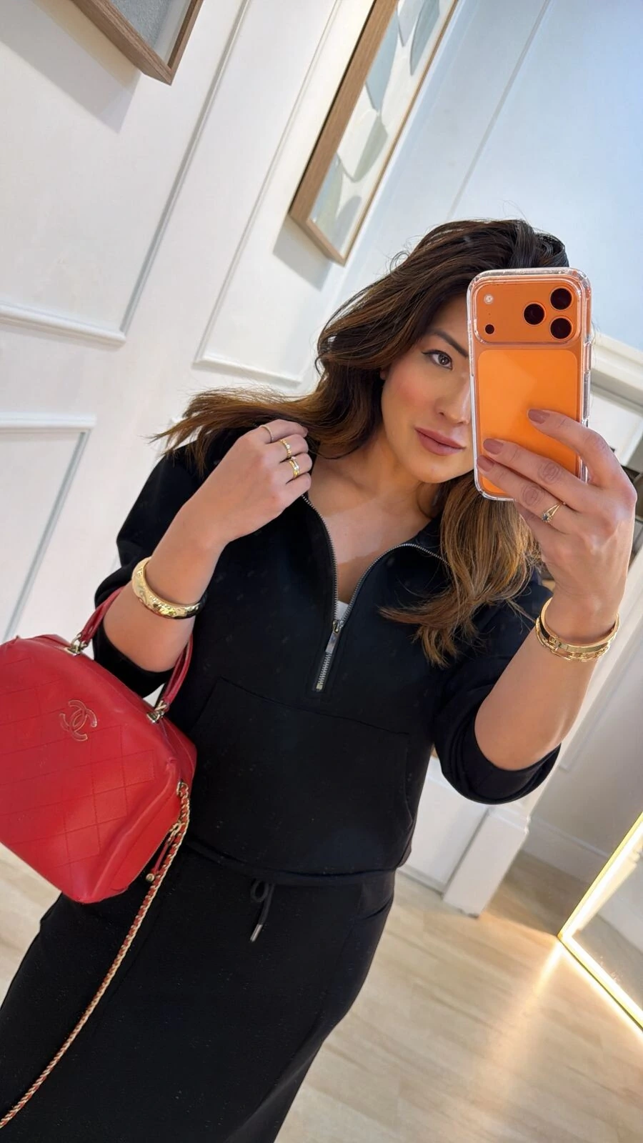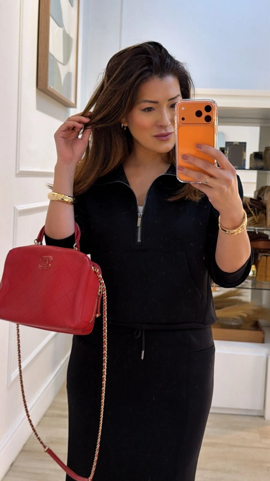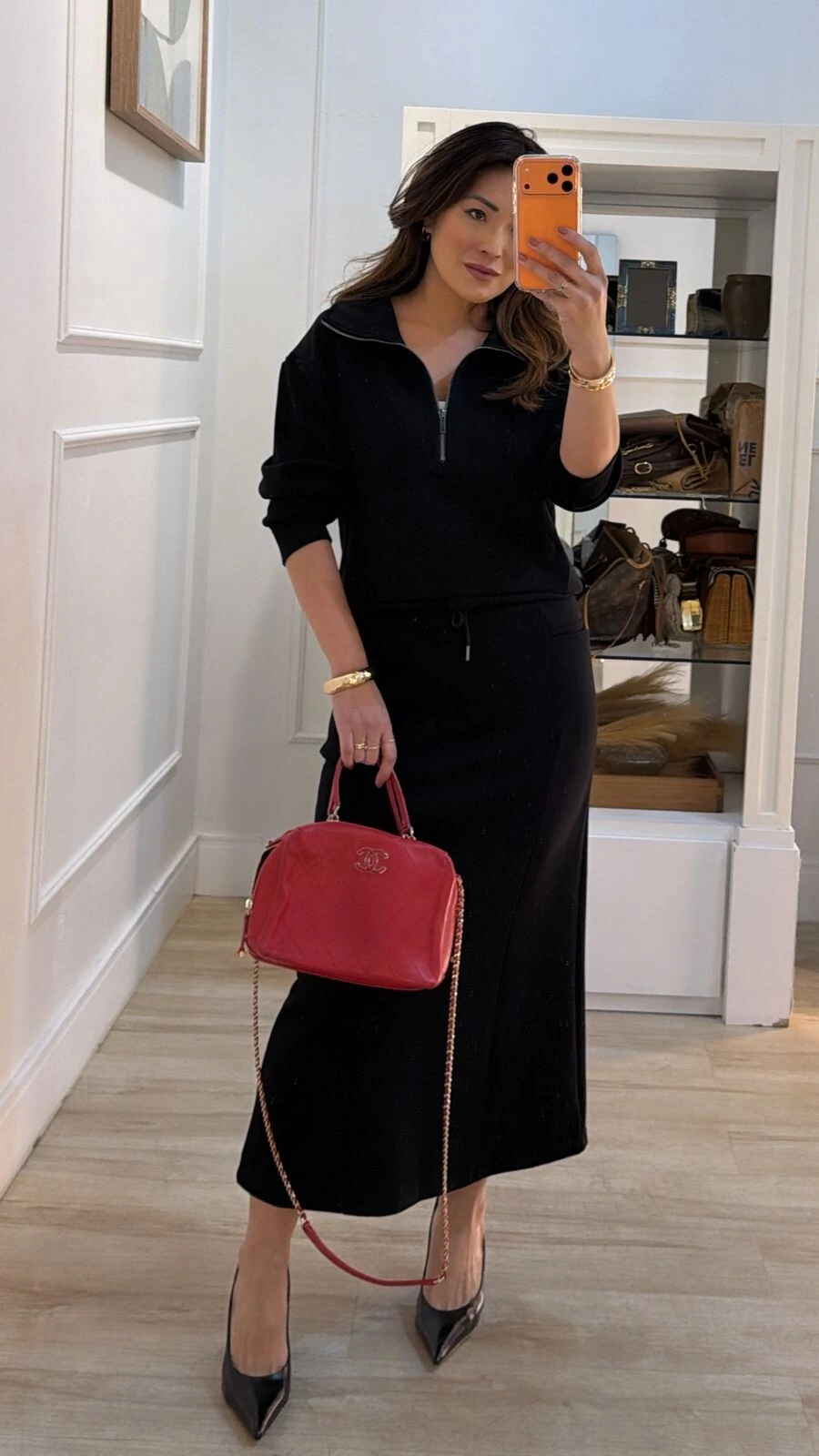 Conjunto confeccionado em moletom. Blusa possui gola alta, mangas longas, bolsos e zíper frontais, e pesponto. Saia midi possui pala larga com elástico franzido e amarração frontal, fenda posterior, bolsos frontais, e pesponto.