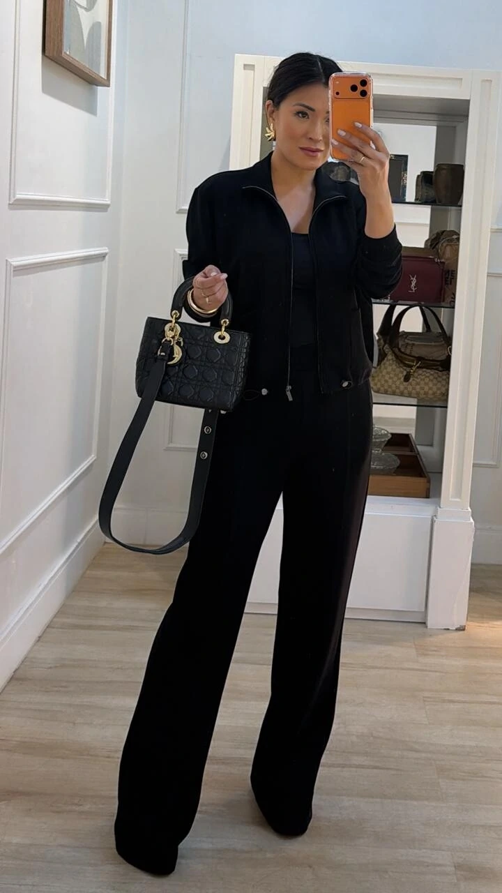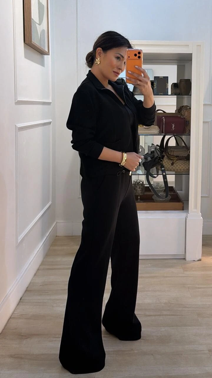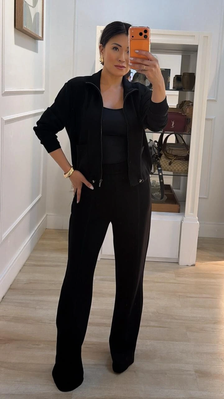 Conjunto confeccionado em moletom. Blusa possui gola alta, mangas longas, punhos largos com recorte, nervuras texturizadas frontais, bolsos frontais, fechamento frontal da peça por zíper, e puxadores reguláveis no barrado. Calça pantalona possui pala larga com elástico franzido, bolsos frontais, nervura texturizada frontal e pesponto.