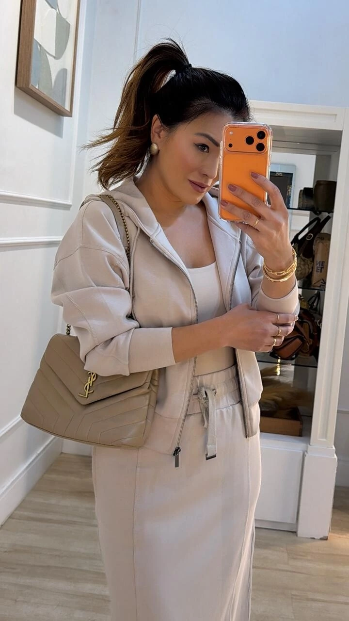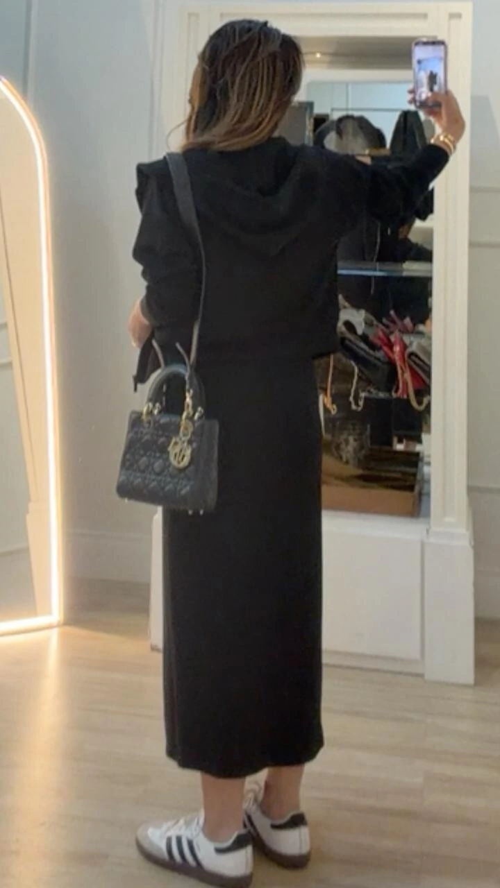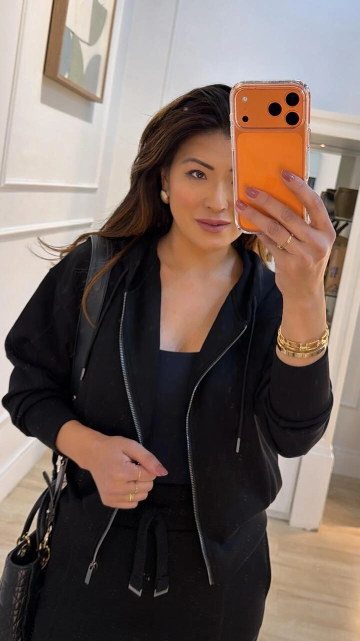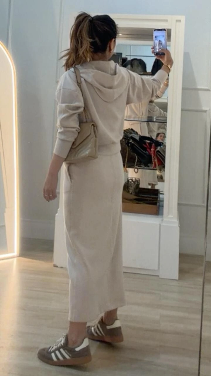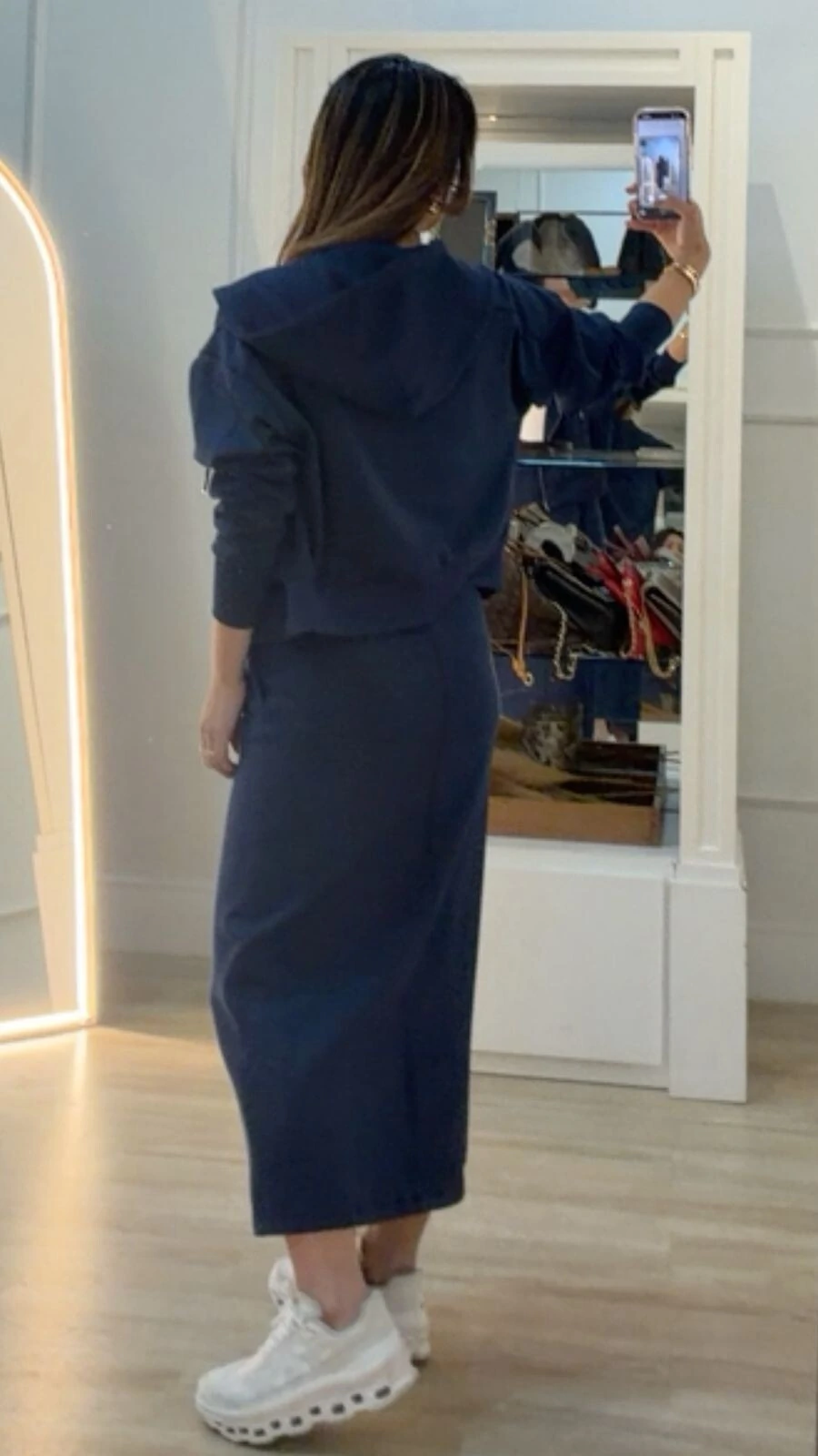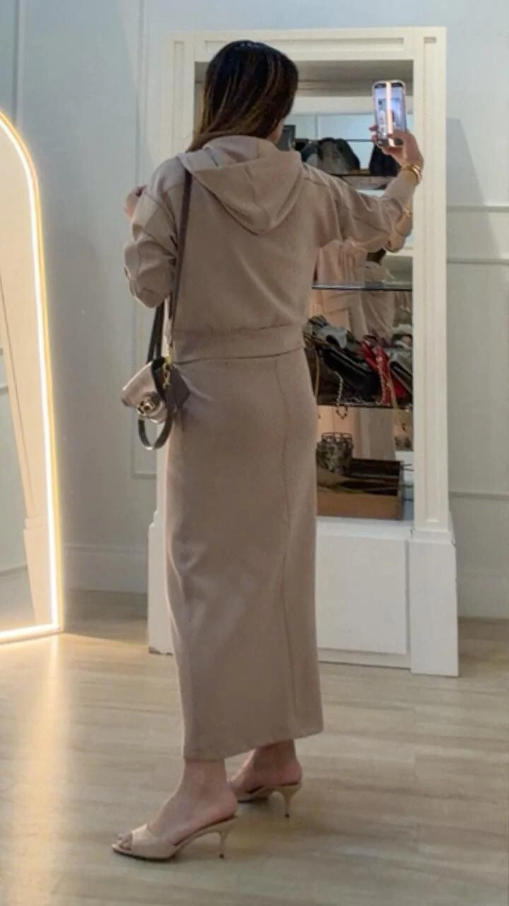 Conjunto confeccionado em moletom. Blusa possui capuz com puxadores reguláveis, mangas longas bufantes, punhos largos, nervuras texturizadas, bolsos frontais, pesponto, e fechamento frontal da peça por zíper. Saia midi possui pala larga com elástico franzido e amarração regulável, bolsos frontais, nervura texturizada e pesponto.