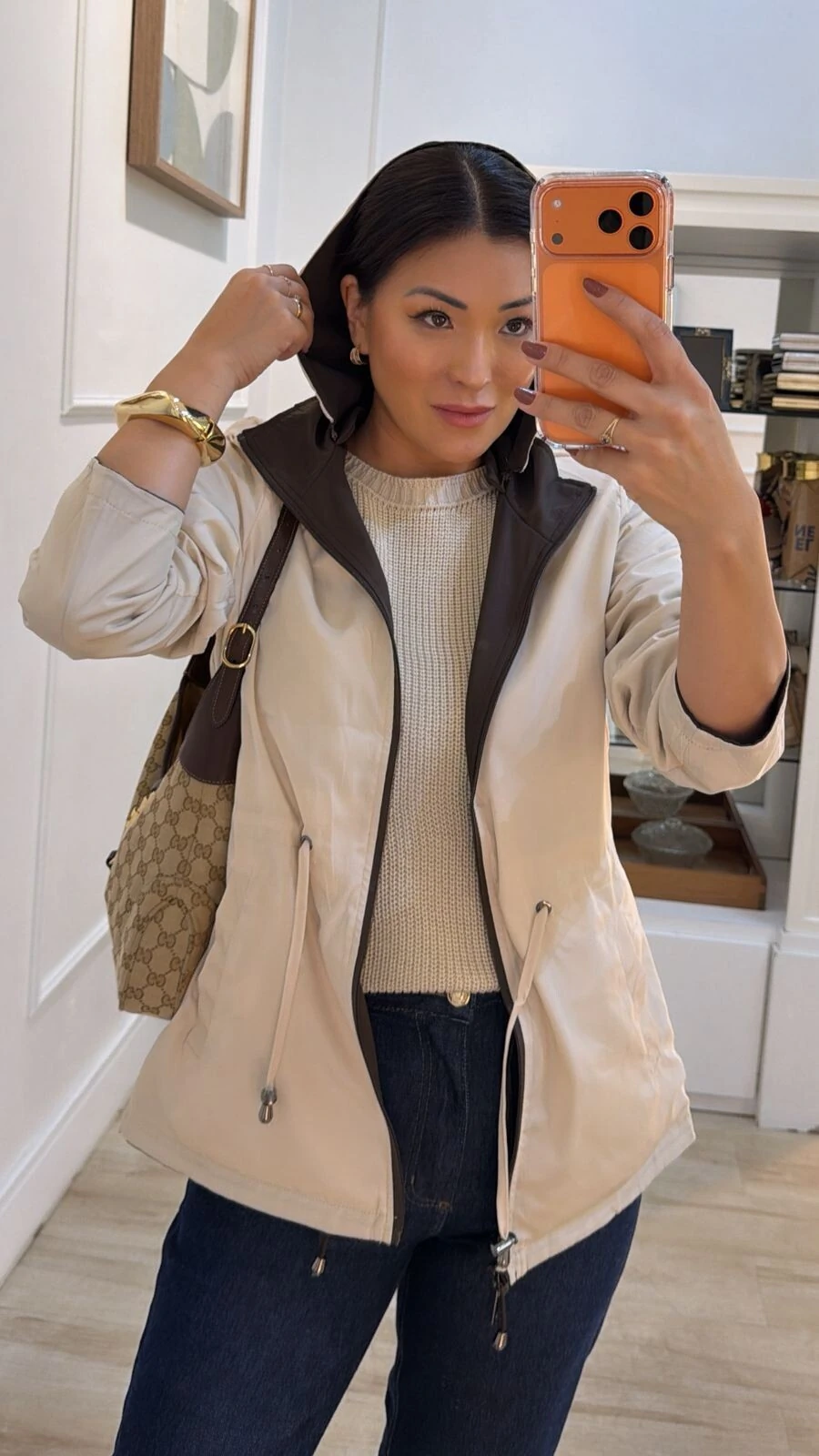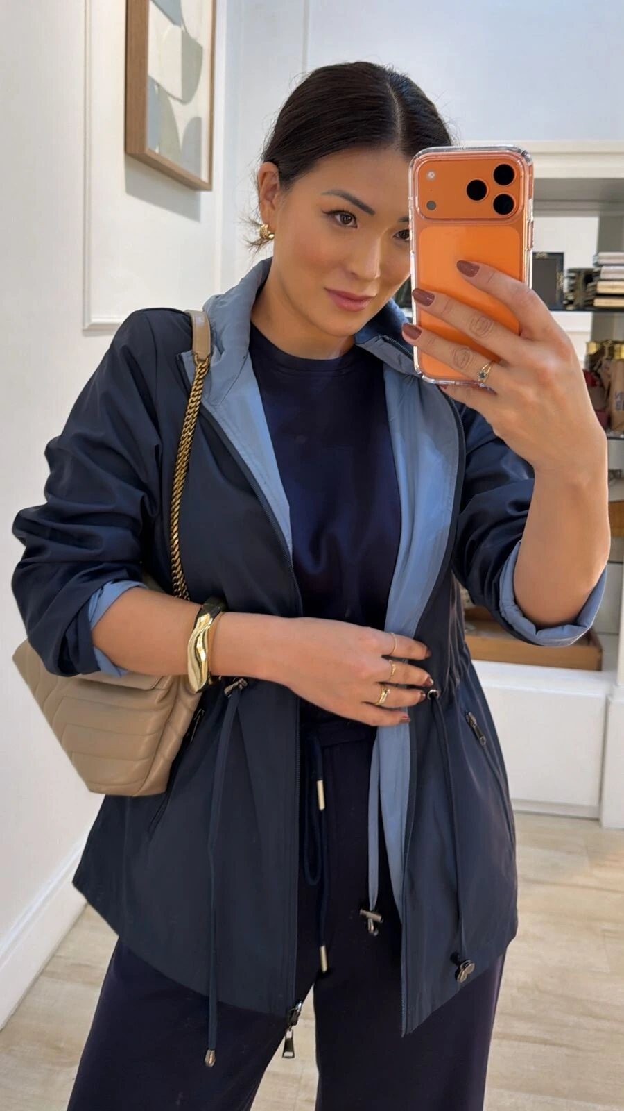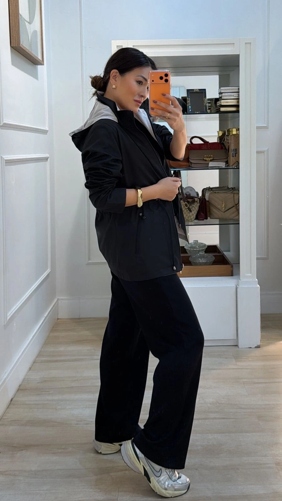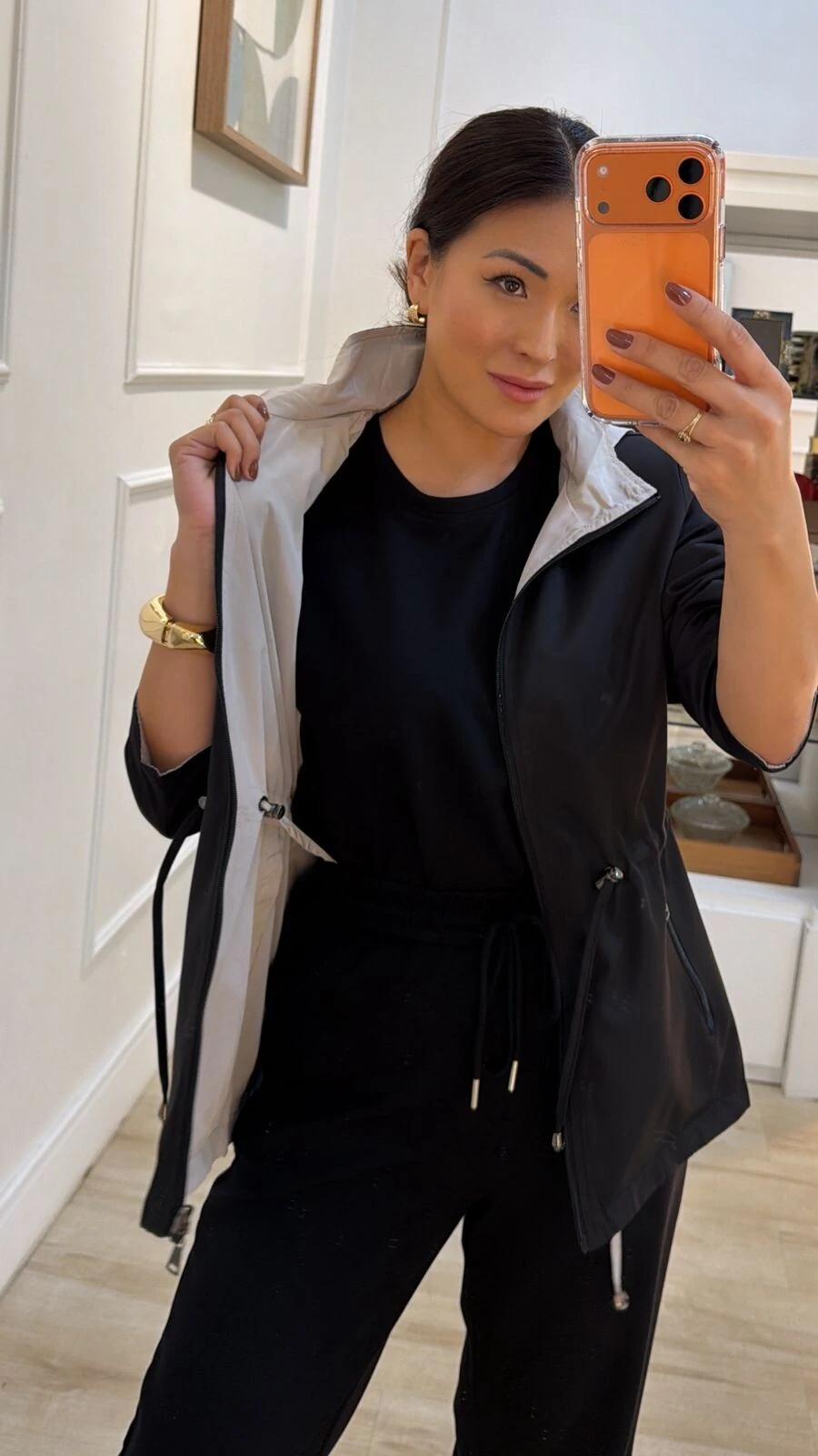 Parka dupla face. Possui capuz removível, gola alta, mangas longas, bolsos frontais, ombreiras, puxadores reguláveis na cintura, pesponto, fechamento pela parte frontal da peça e dos bolsos por zíper.
