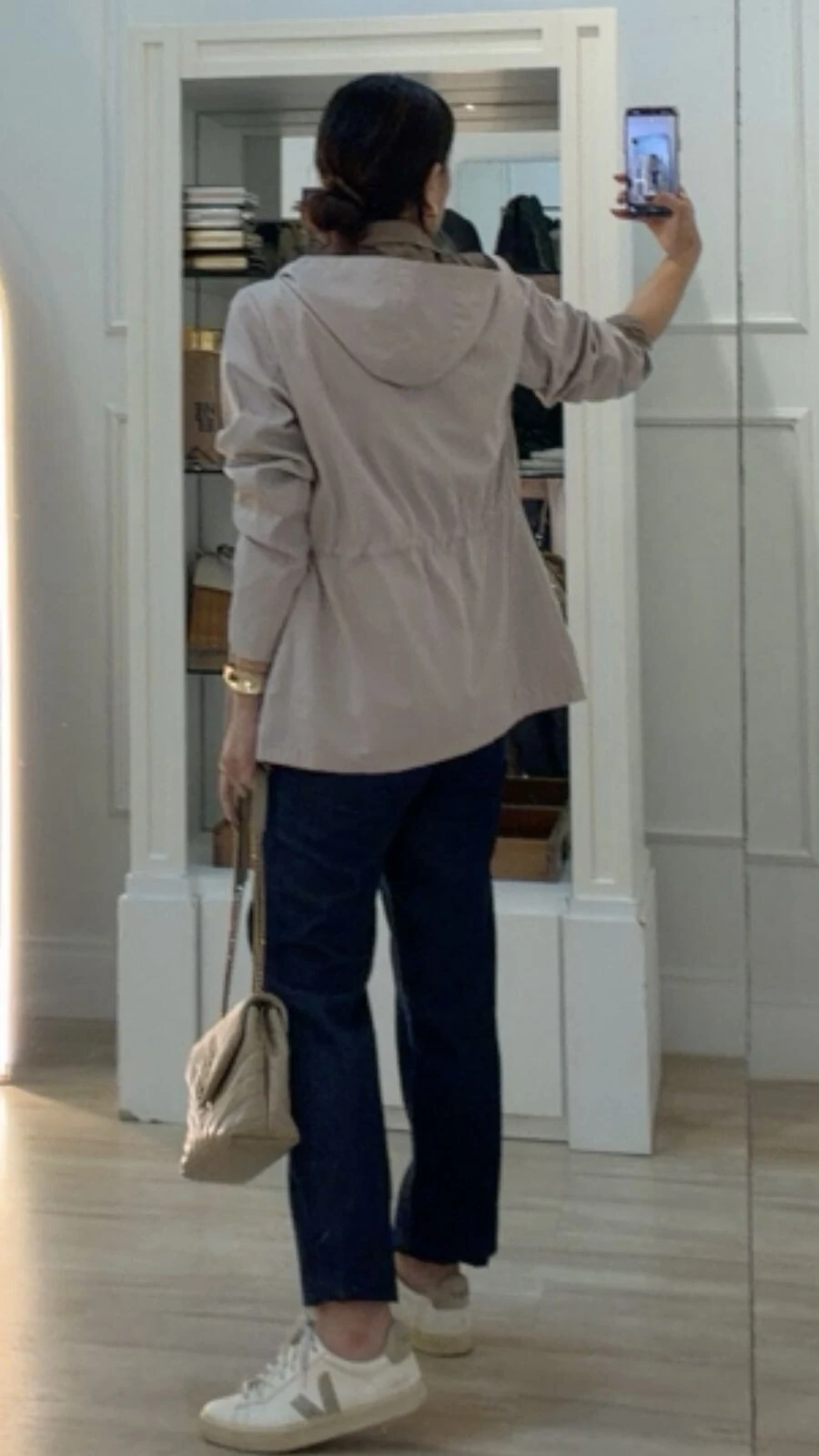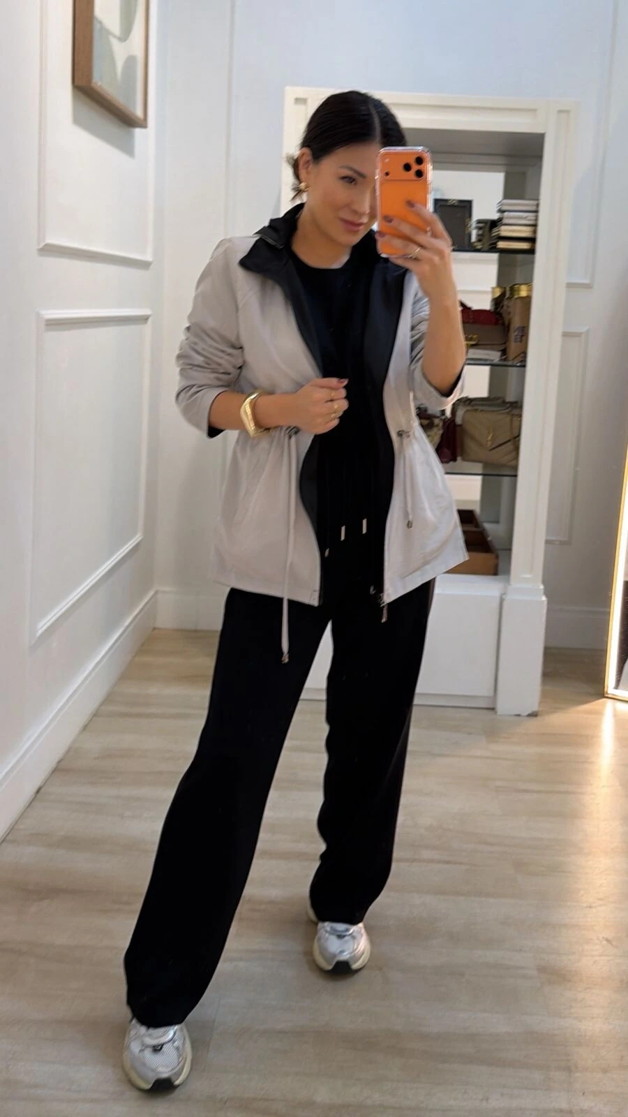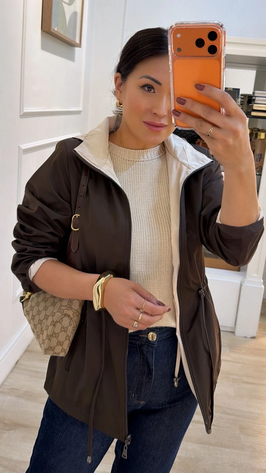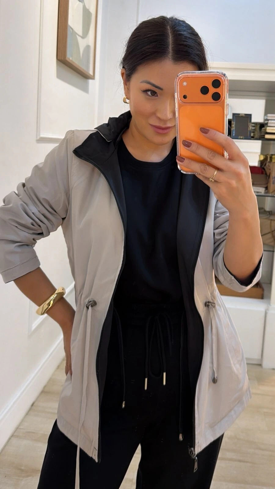 Parka dupla face. Possui capuz removível, gola alta, mangas longas, bolsos frontais, ombreiras, puxadores reguláveis na cintura, pesponto, fechamento pela parte frontal da peça e dos bolsos por zíper.