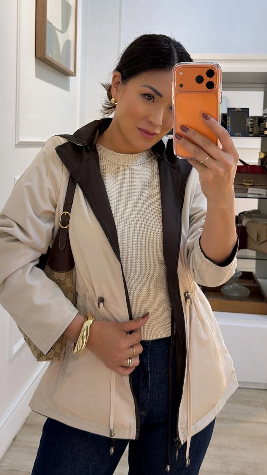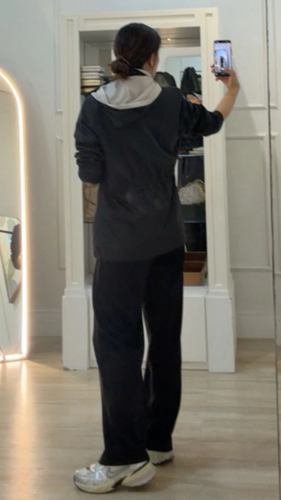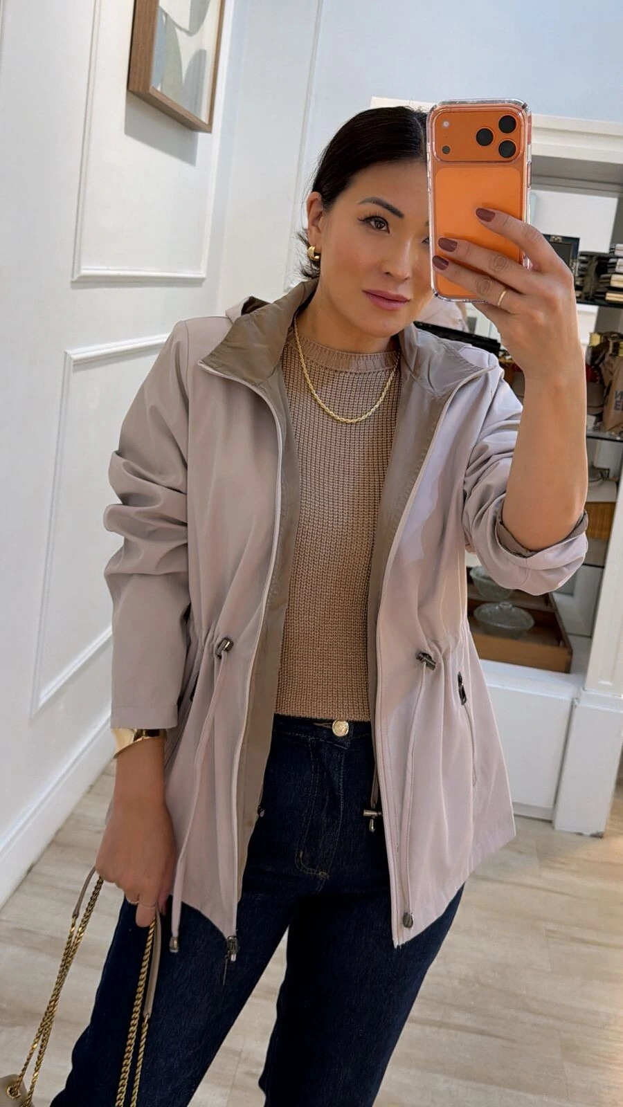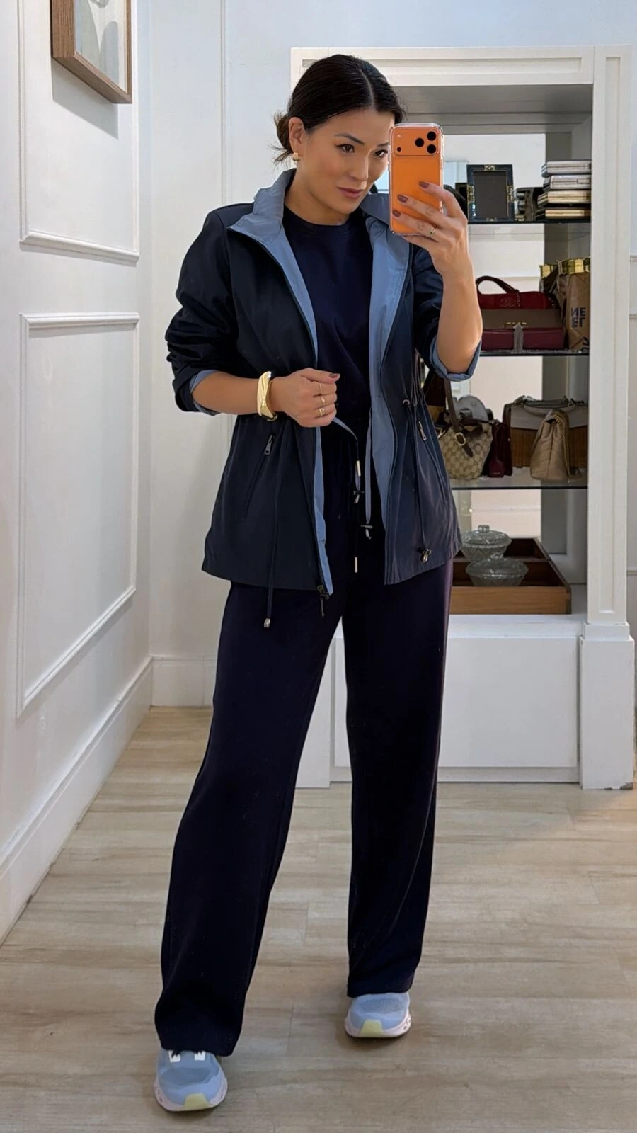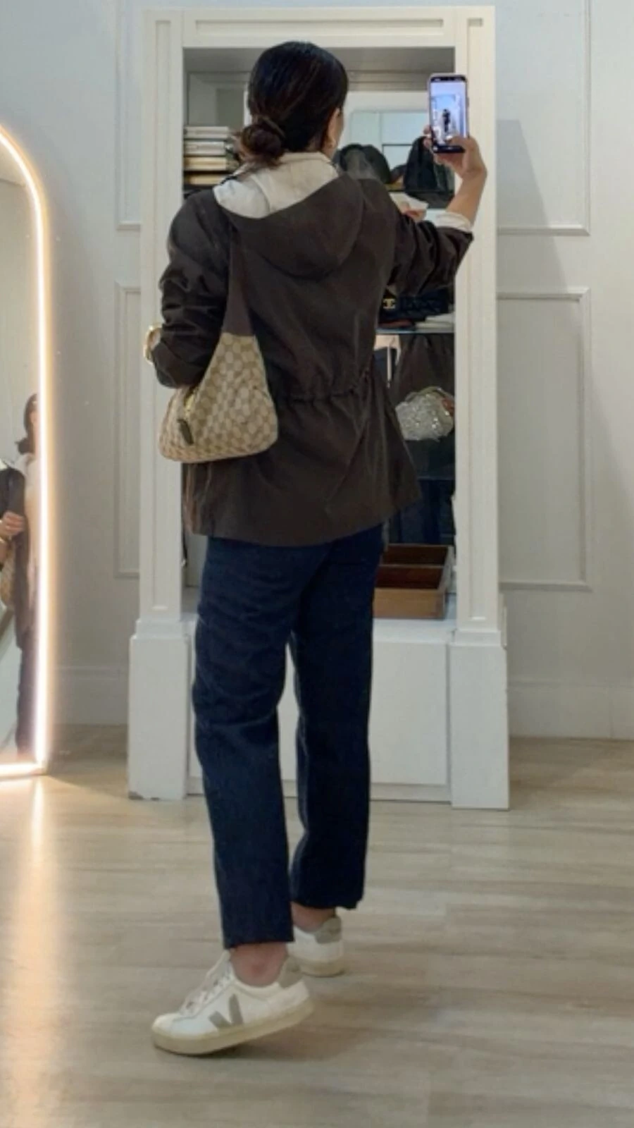 Parka dupla face. Possui capuz removível, gola alta, mangas longas, bolsos frontais, ombreiras, puxadores reguláveis na cintura, pesponto, fechamento pela parte frontal da peça e dos bolsos por zíper.