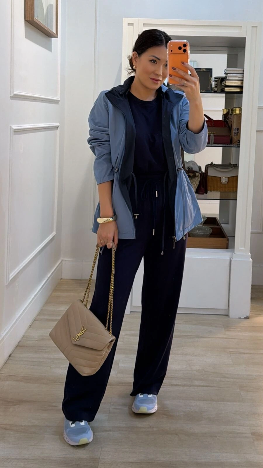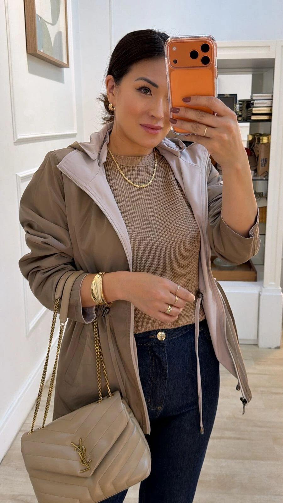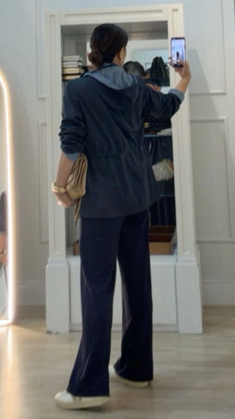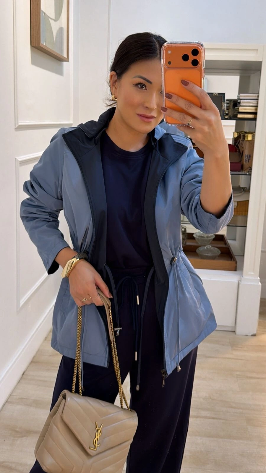Parka dupla face. Possui capuz removível, gola alta, mangas longas, bolsos frontais, ombreiras, puxadores reguláveis na cintura, pesponto, fechamento pela parte frontal da peça e dos bolsos por zíper.