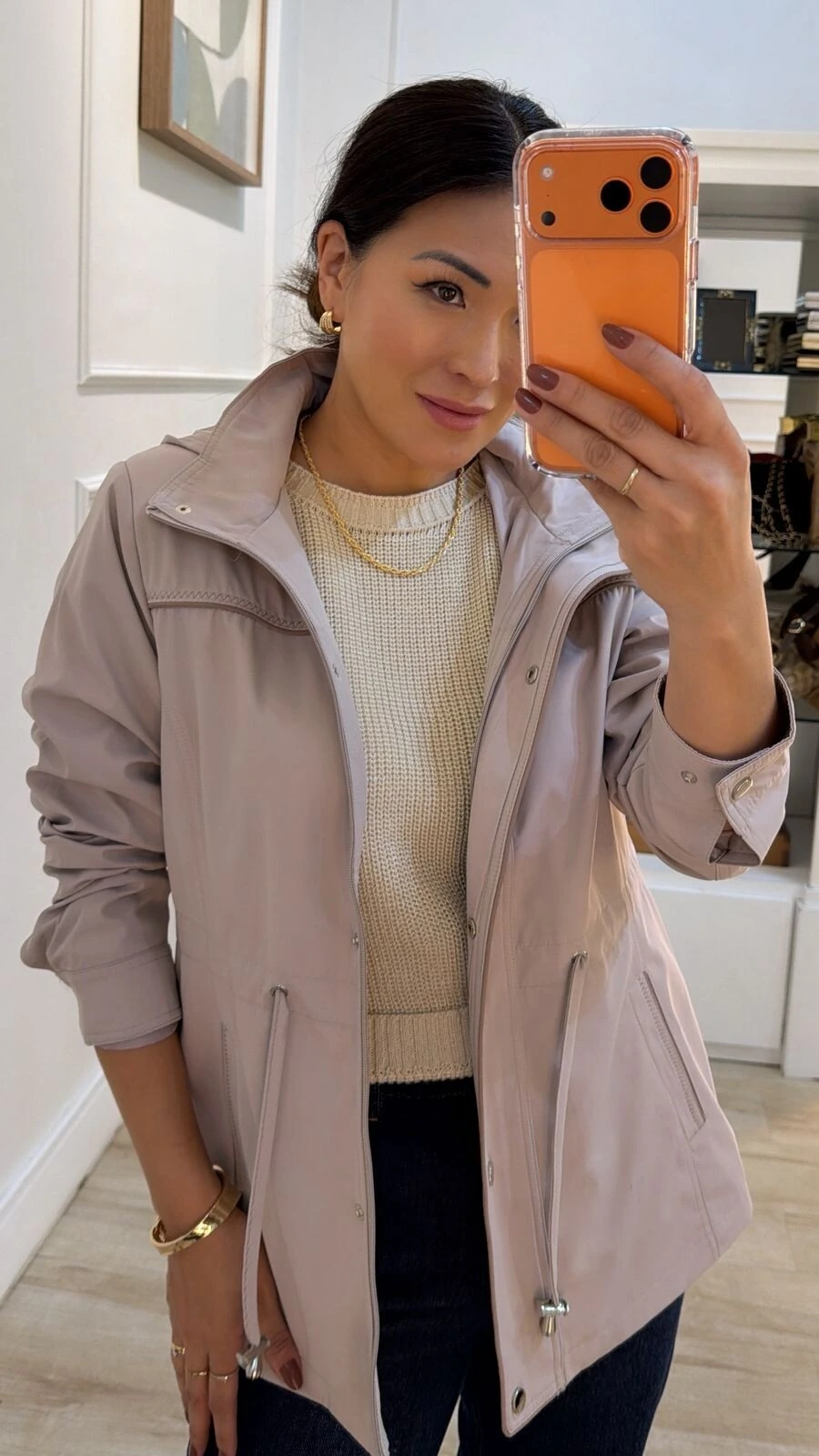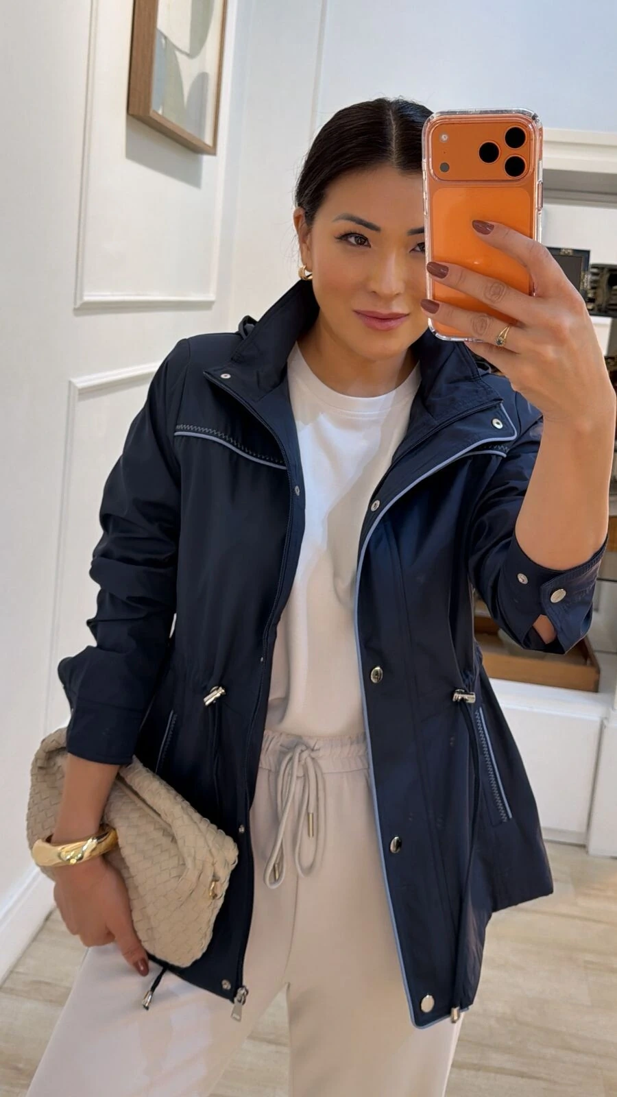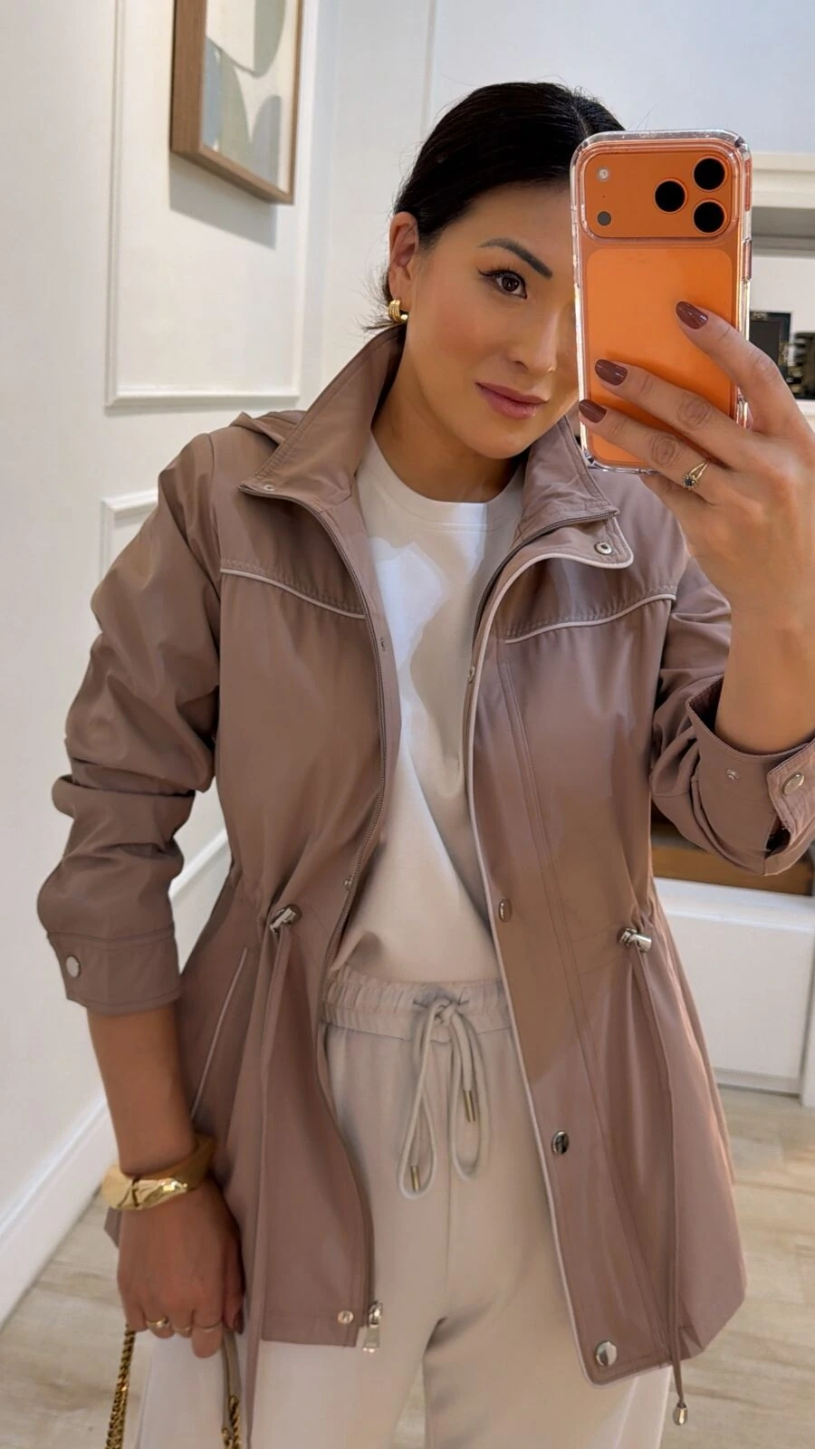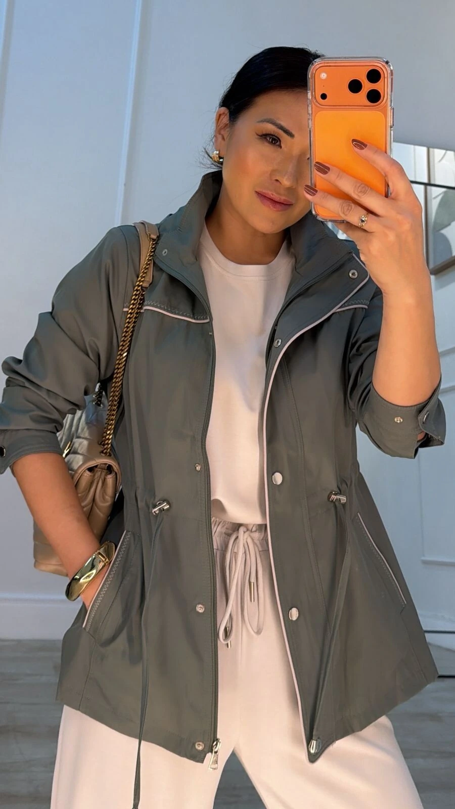 Parka possui gola alta, capuz removível, mangas longas com fechamento dos pui, ombreiras, puxadores reguláveis na cintura, bolsos frontais, detalhe bicolor de vivo e pesponto, fechamento frontal da peça por zíper e botão de pressão, e forro.