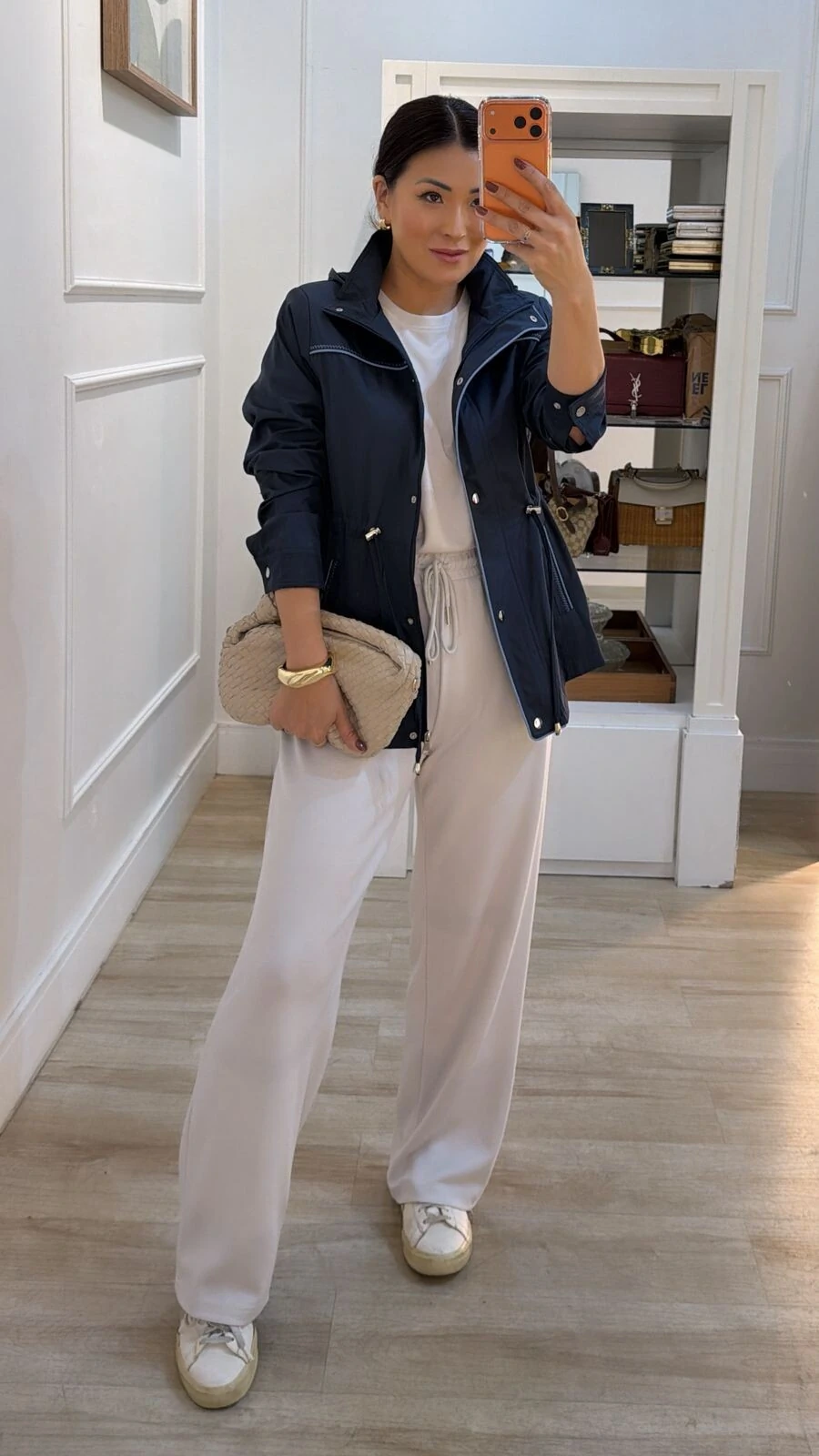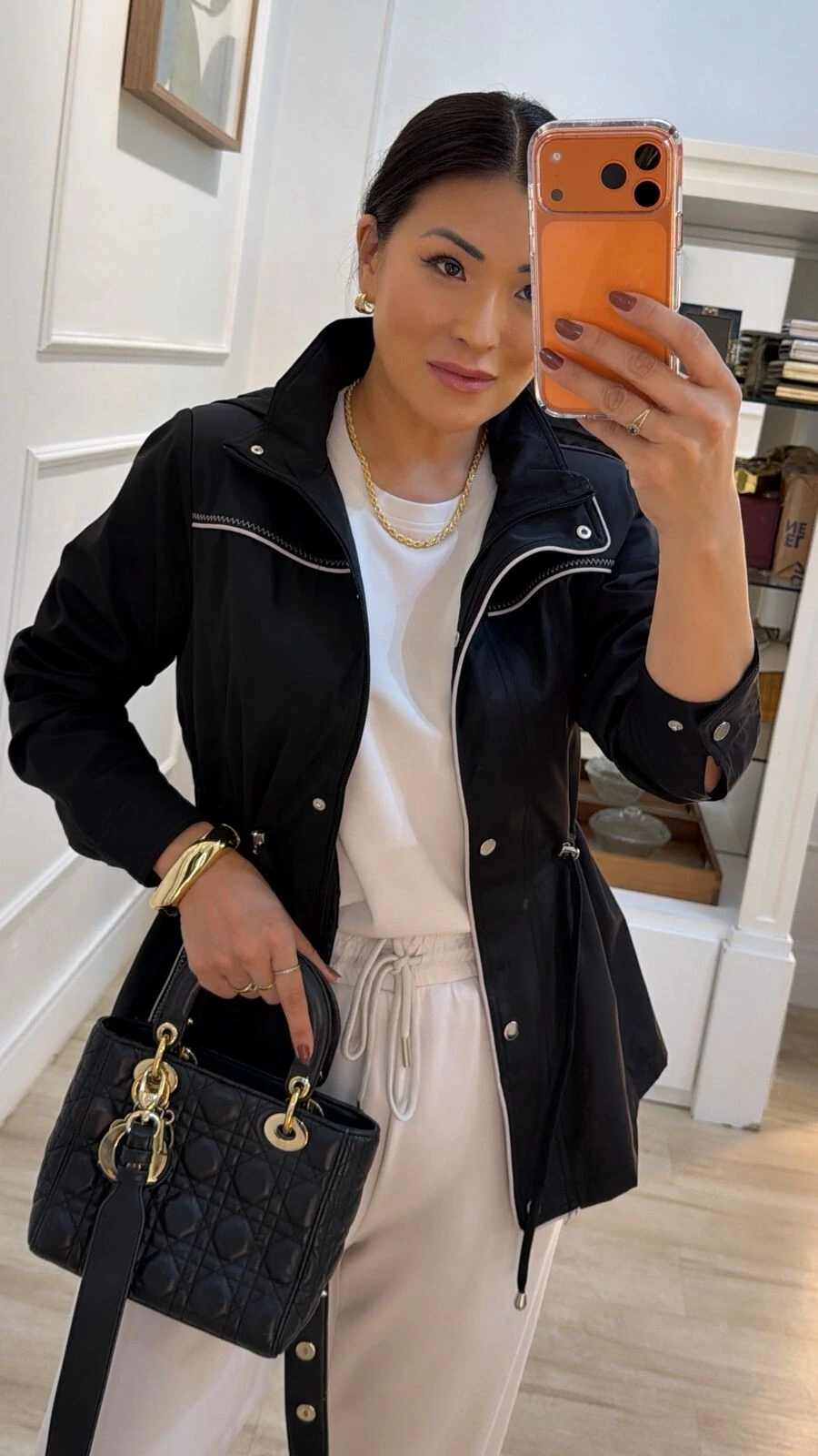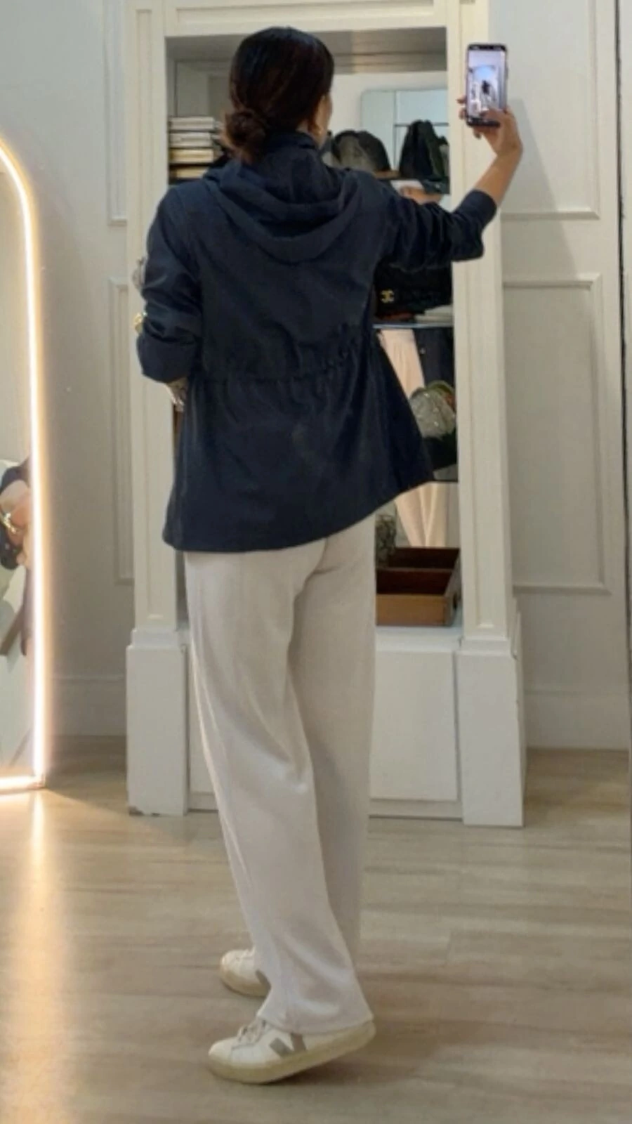 Parka possui gola alta, capuz removível, mangas longas com fechamento dos pui, ombreiras, puxadores reguláveis na cintura, bolsos frontais, detalhe bicolor de vivo e pesponto, fechamento frontal da peça por zíper e botão de pressão, e forro.