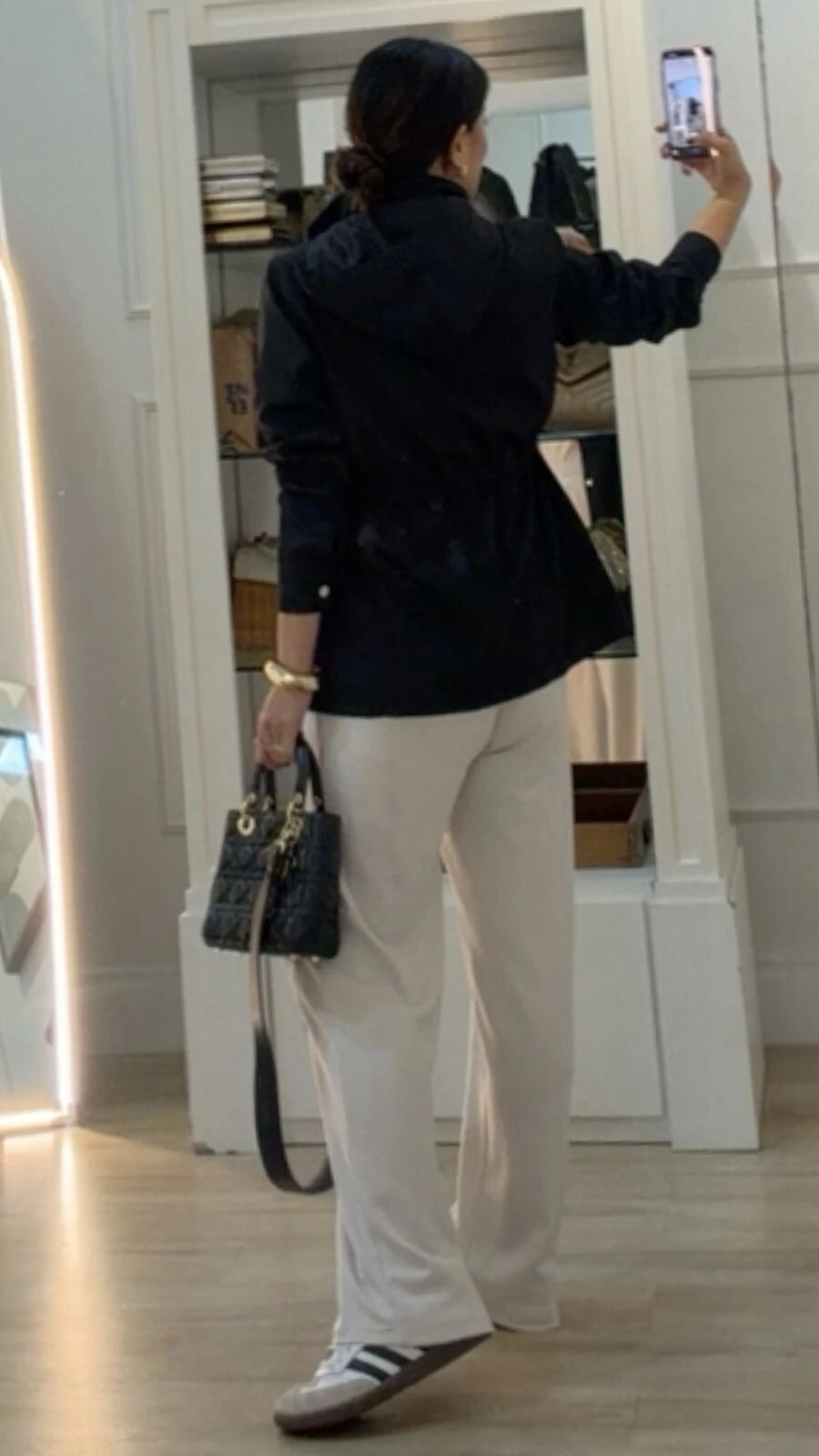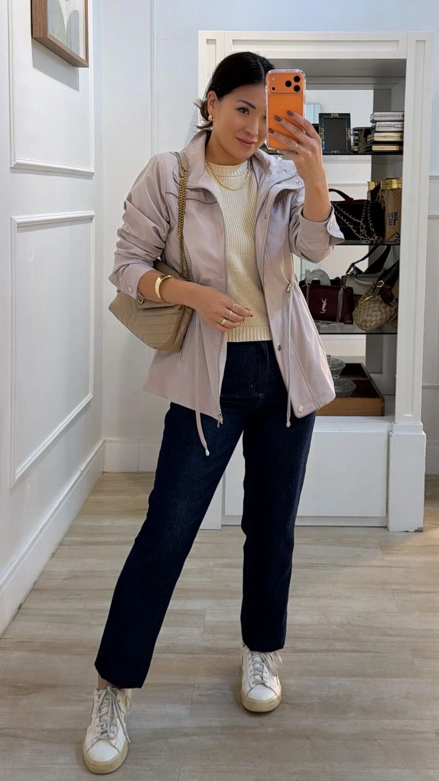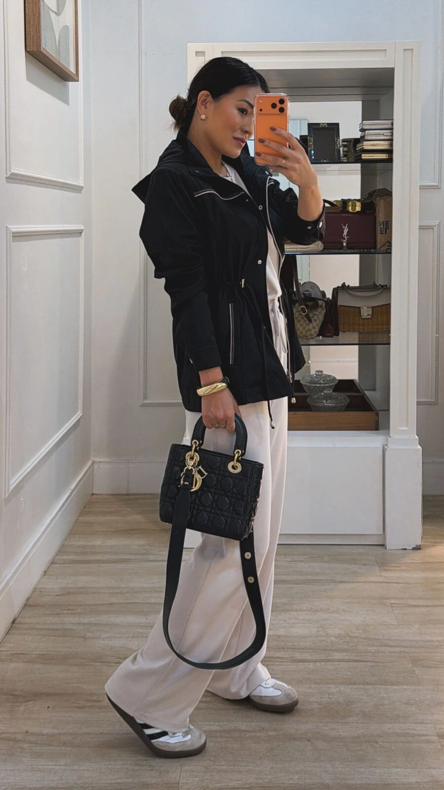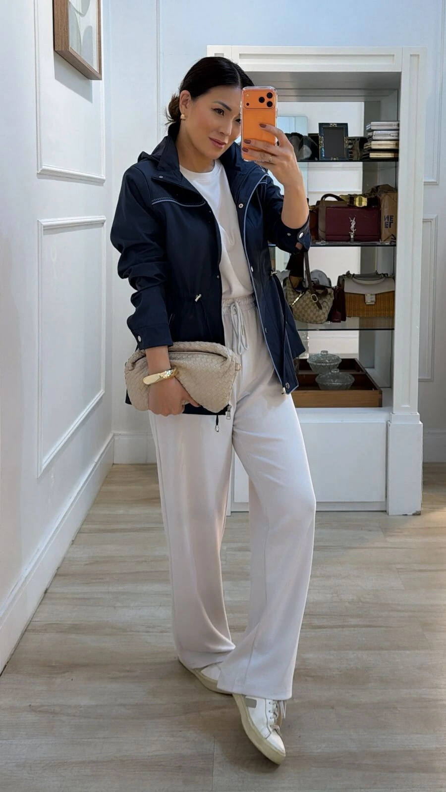 Parka possui gola alta, capuz removível, mangas longas com fechamento dos pui, ombreiras, puxadores reguláveis na cintura, bolsos frontais, detalhe bicolor de vivo e pesponto, fechamento frontal da peça por zíper e botão de pressão, e forro.