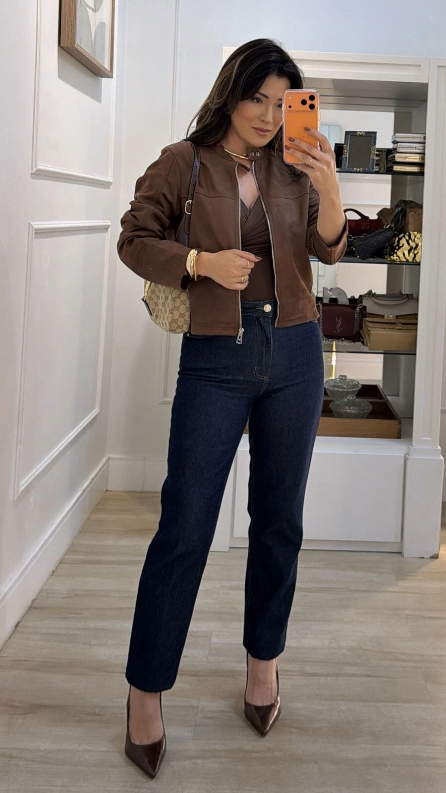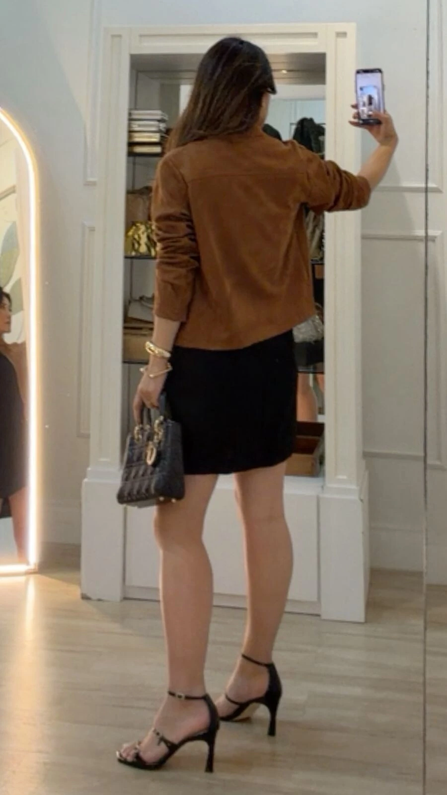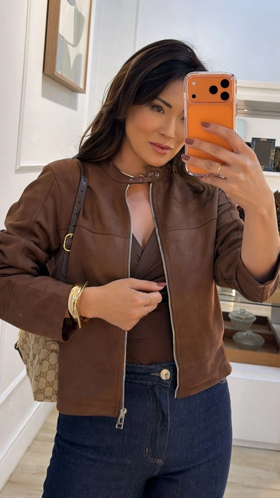 Jaqueta confeccionado em suede. Possui gola alta com fechamento por botões prata, mangas longas, bolsos frontais, recorte, pesponto, fechamento pela parte frontal da peça por zíper prata.