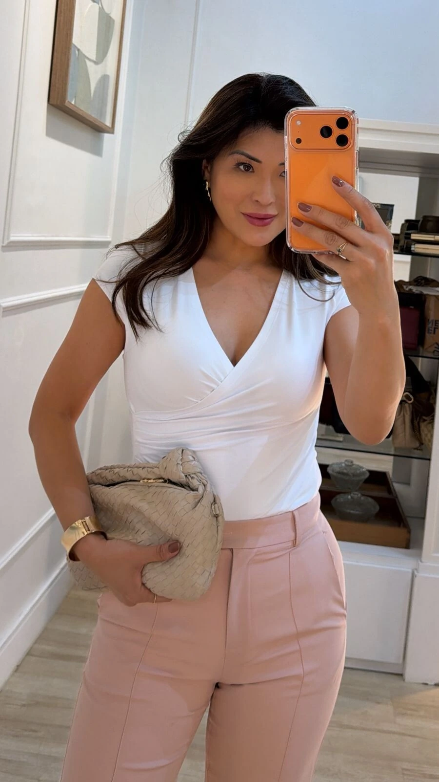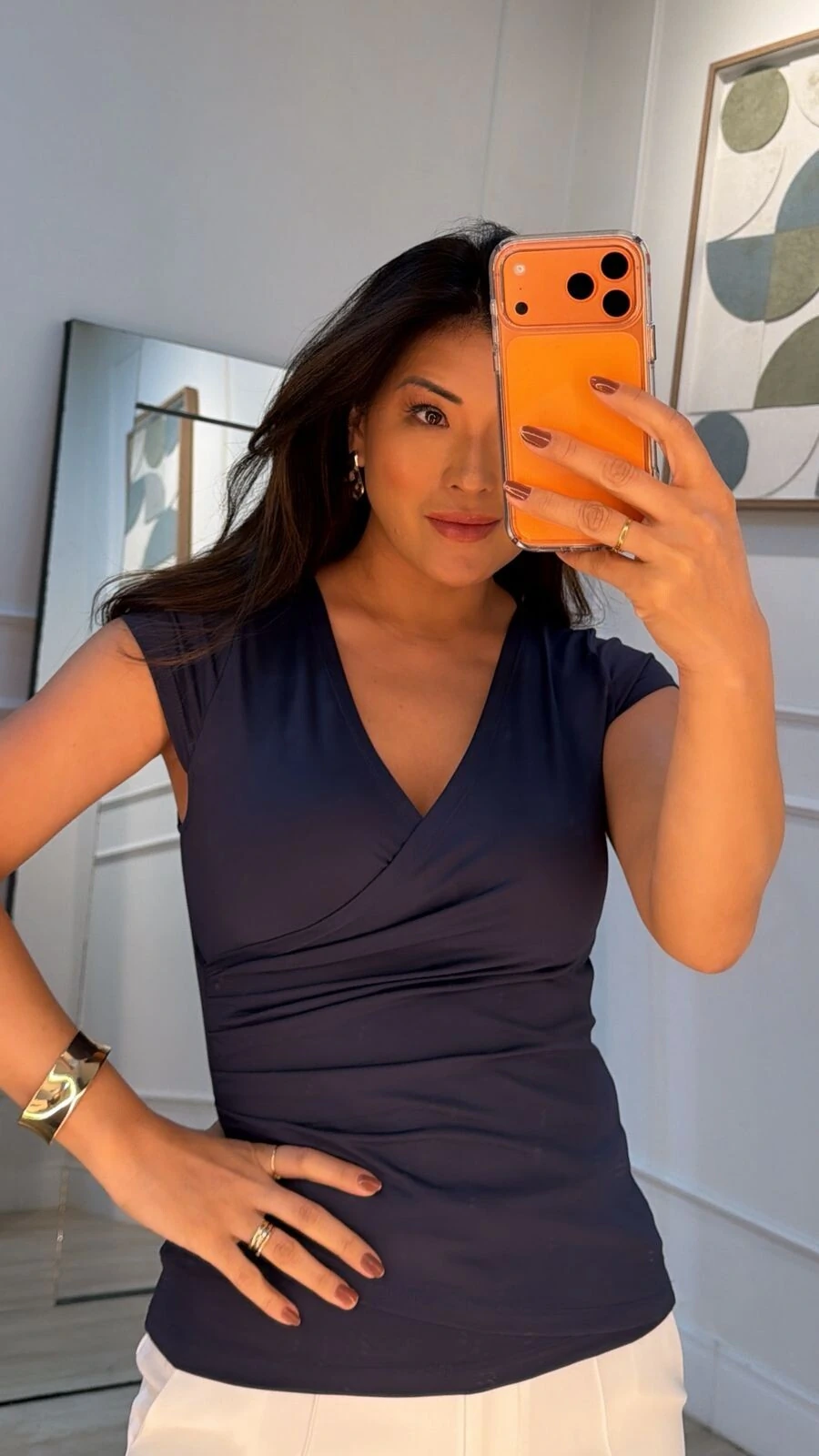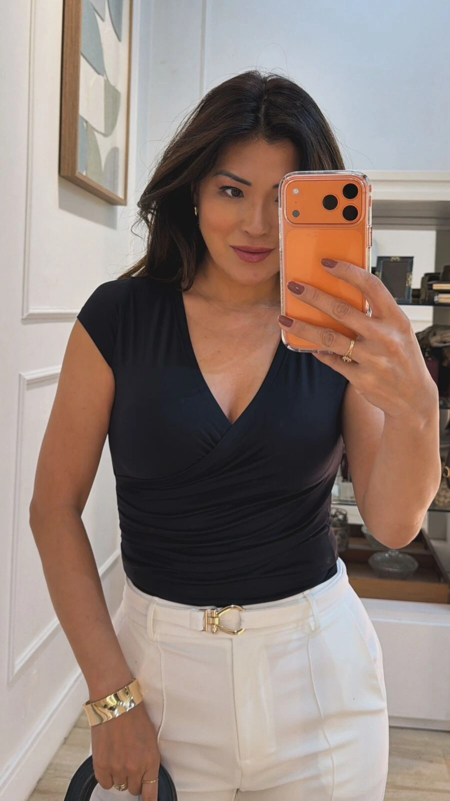 Blusa cachequer confeccionada em suplex. Possui decote v transpassado, drapeado lateral, mangas curtas e pesponto.