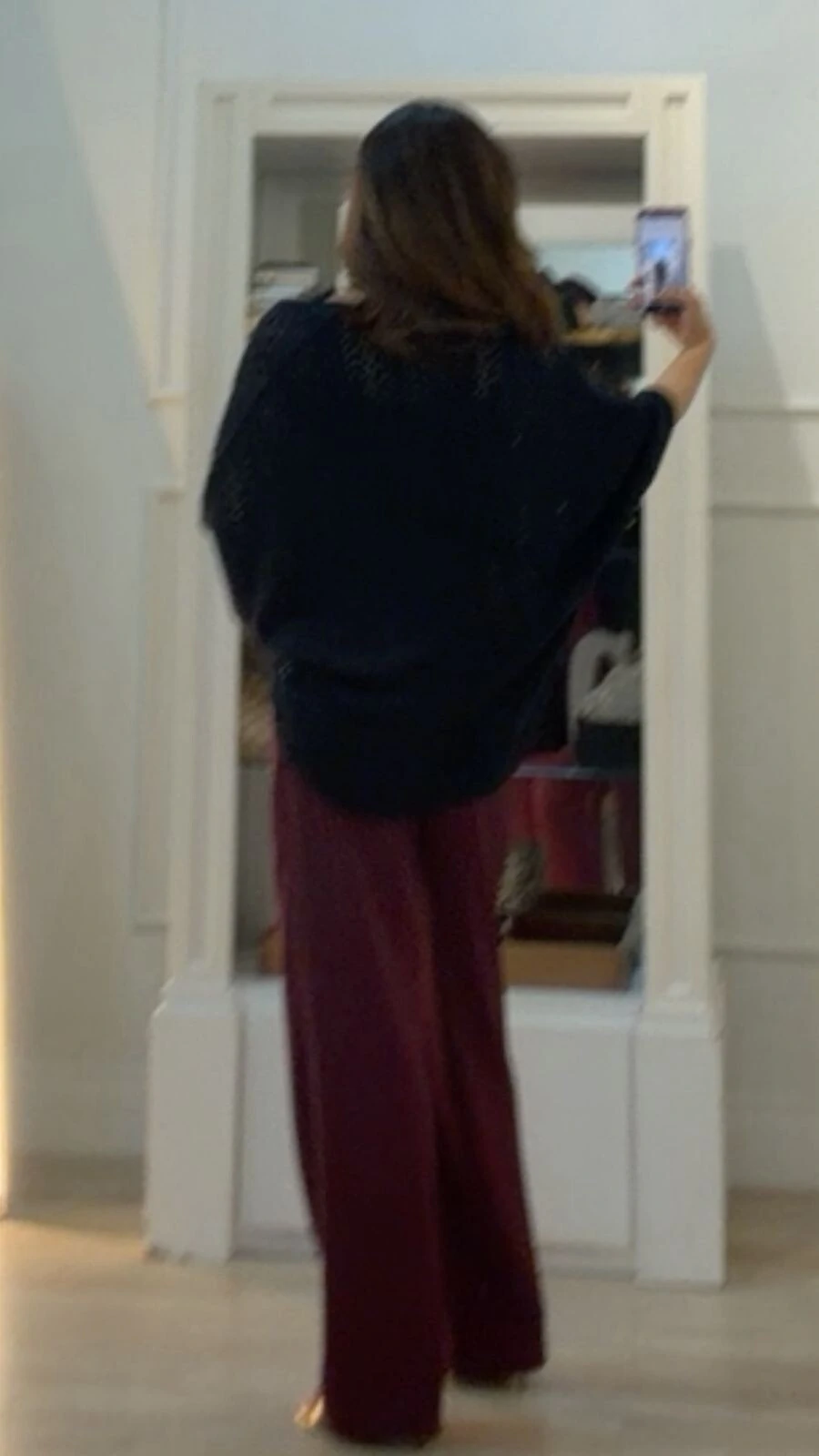 Kimono confeccionado em tricot vazado. Possui mangas ¾, gola e punhos enrolados, fenda lateral, barrado posterior arredondado.