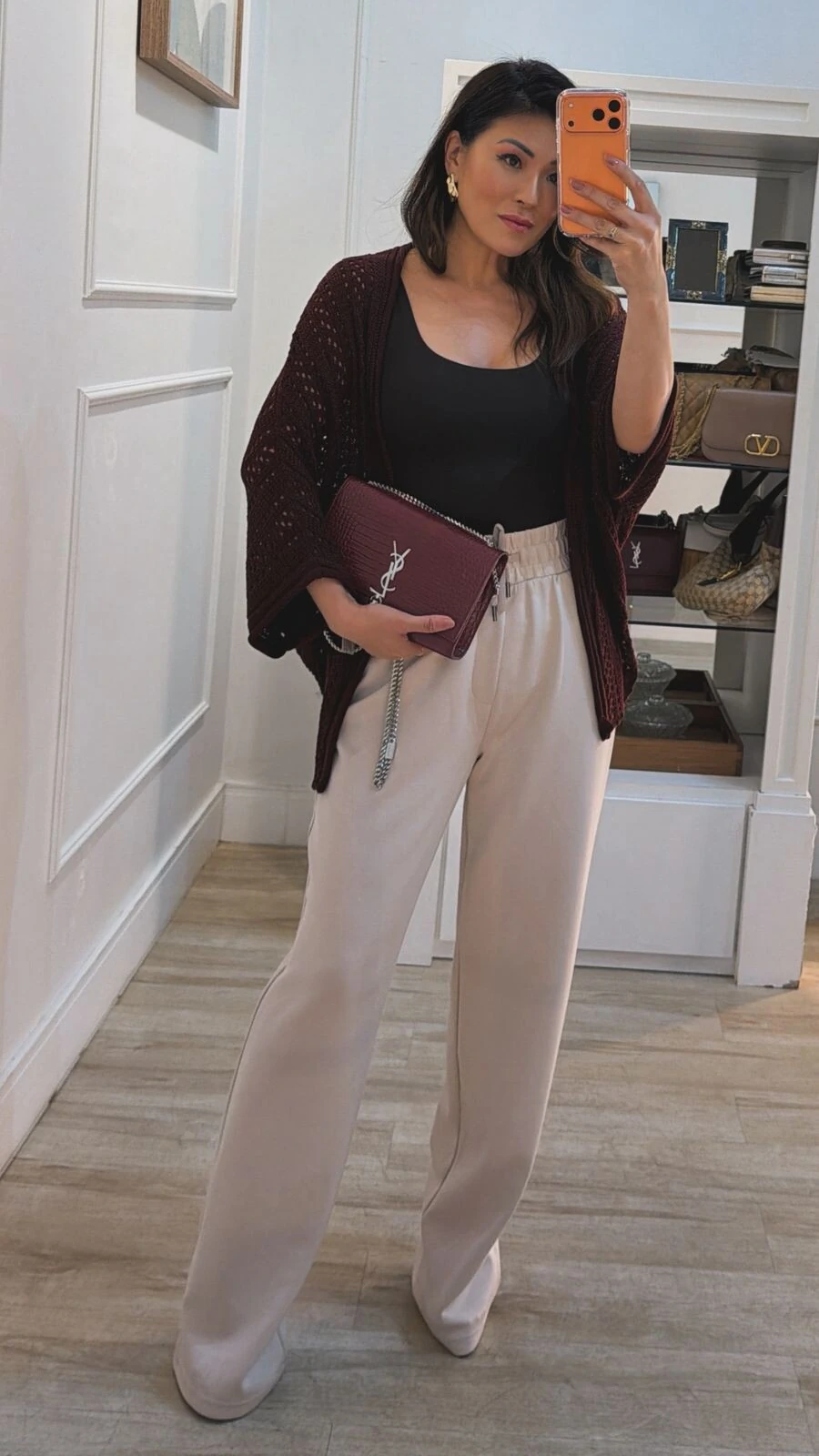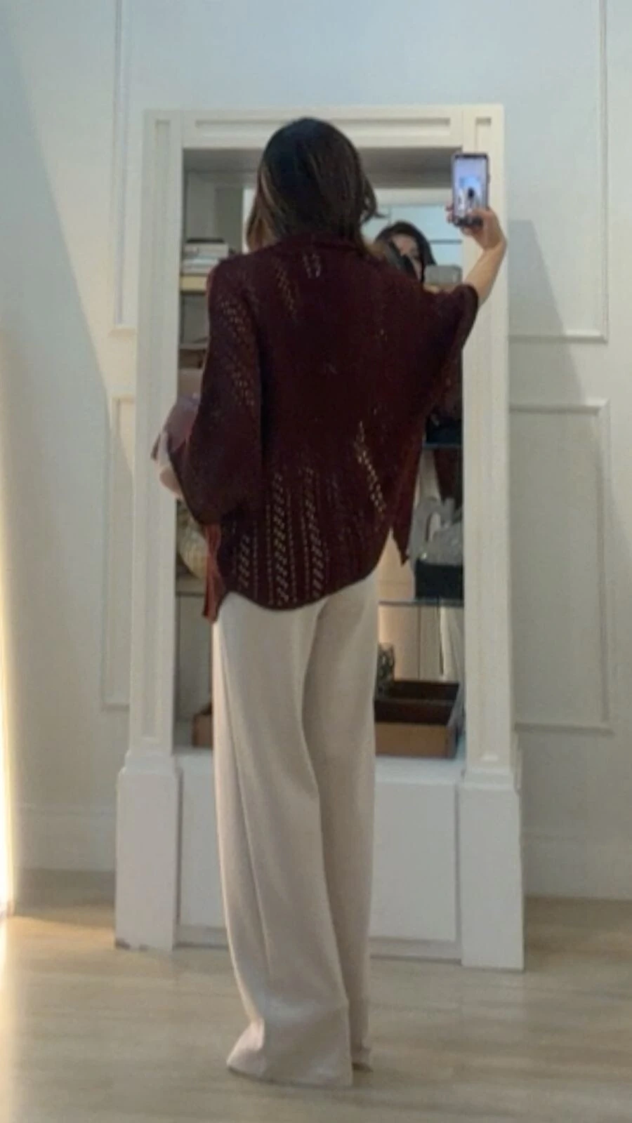 Kimono confeccionado em tricot vazado. Possui mangas ¾, gola e punhos enrolados, fenda lateral, barrado posterior arredondado.